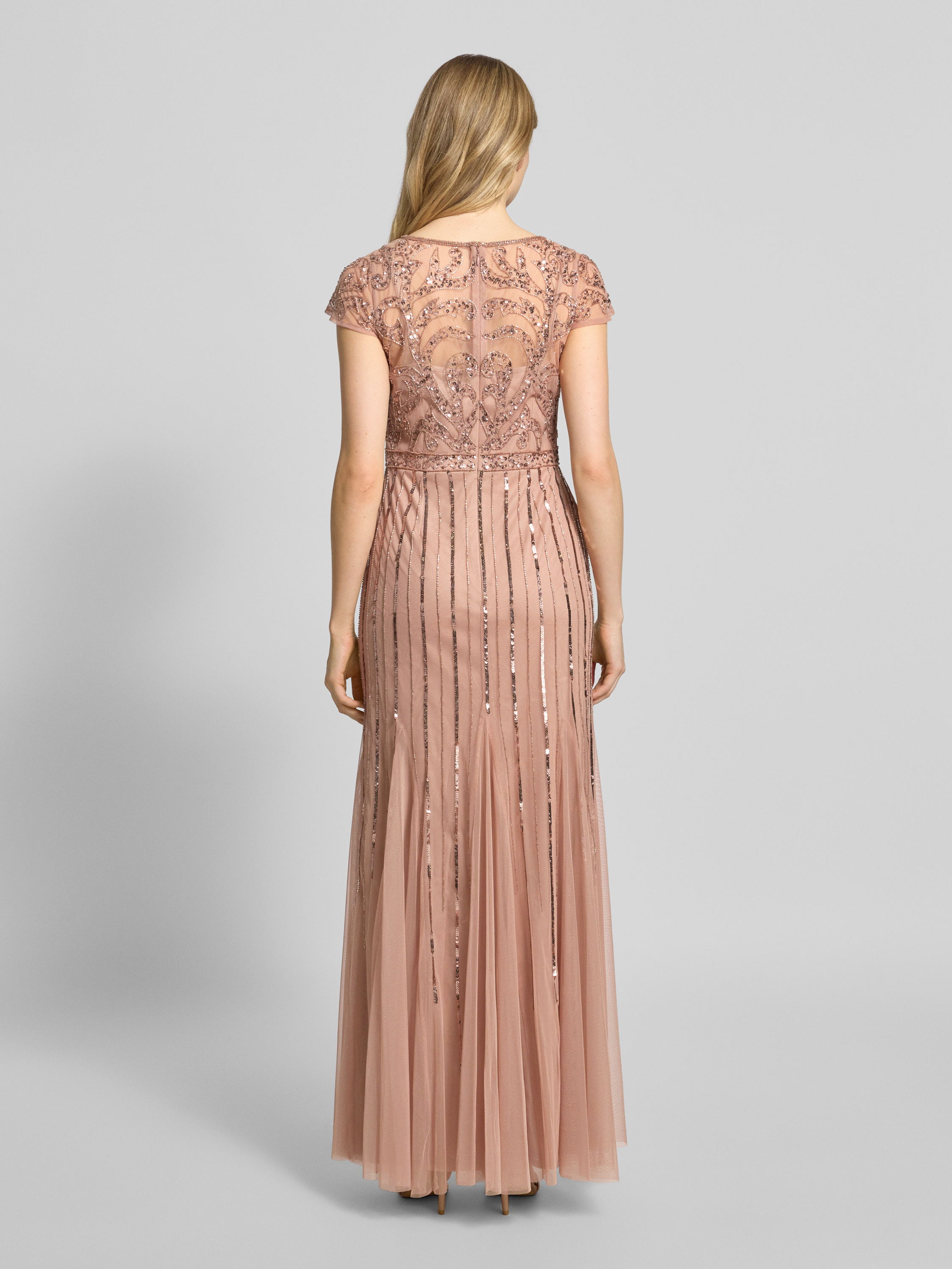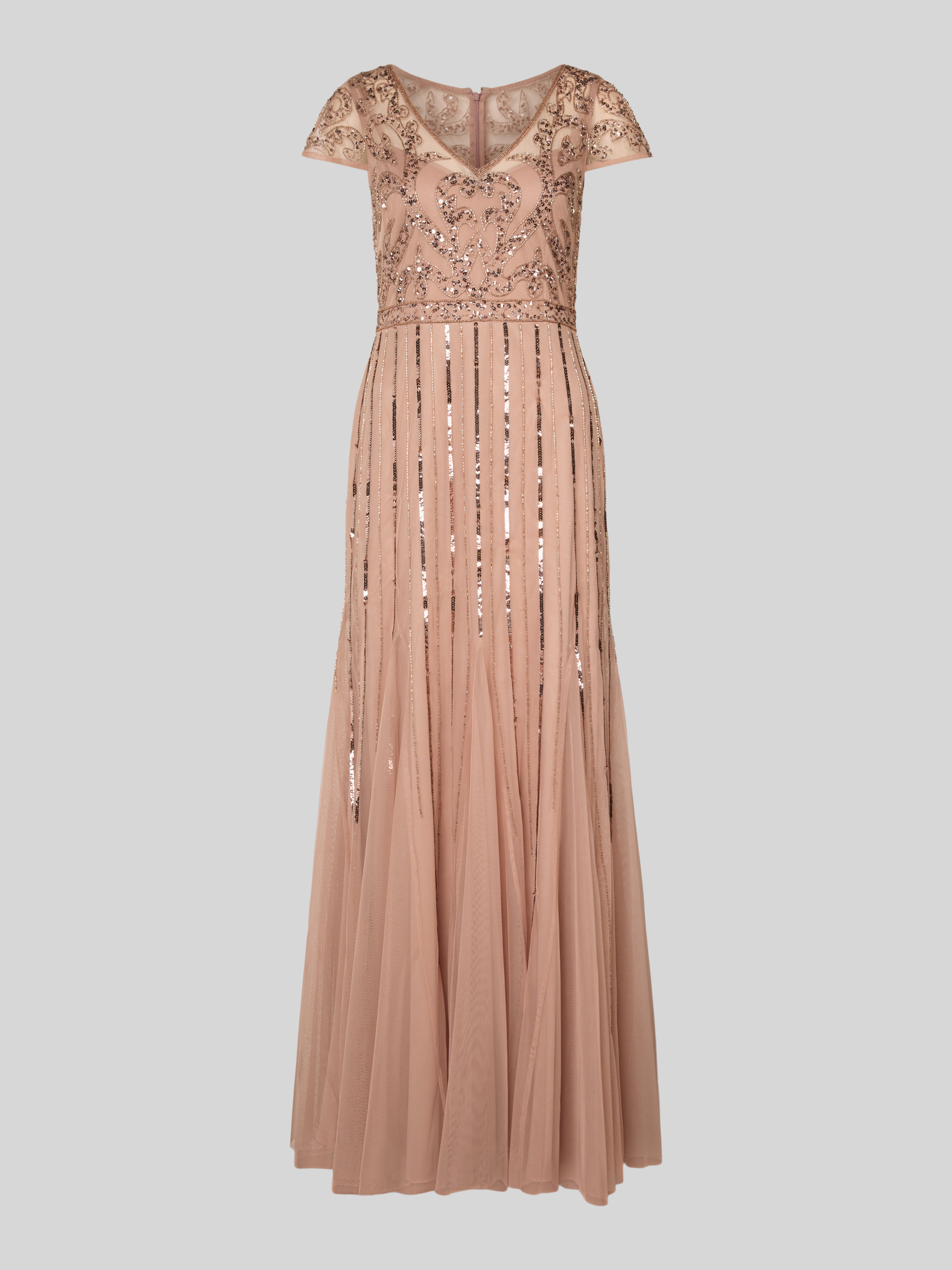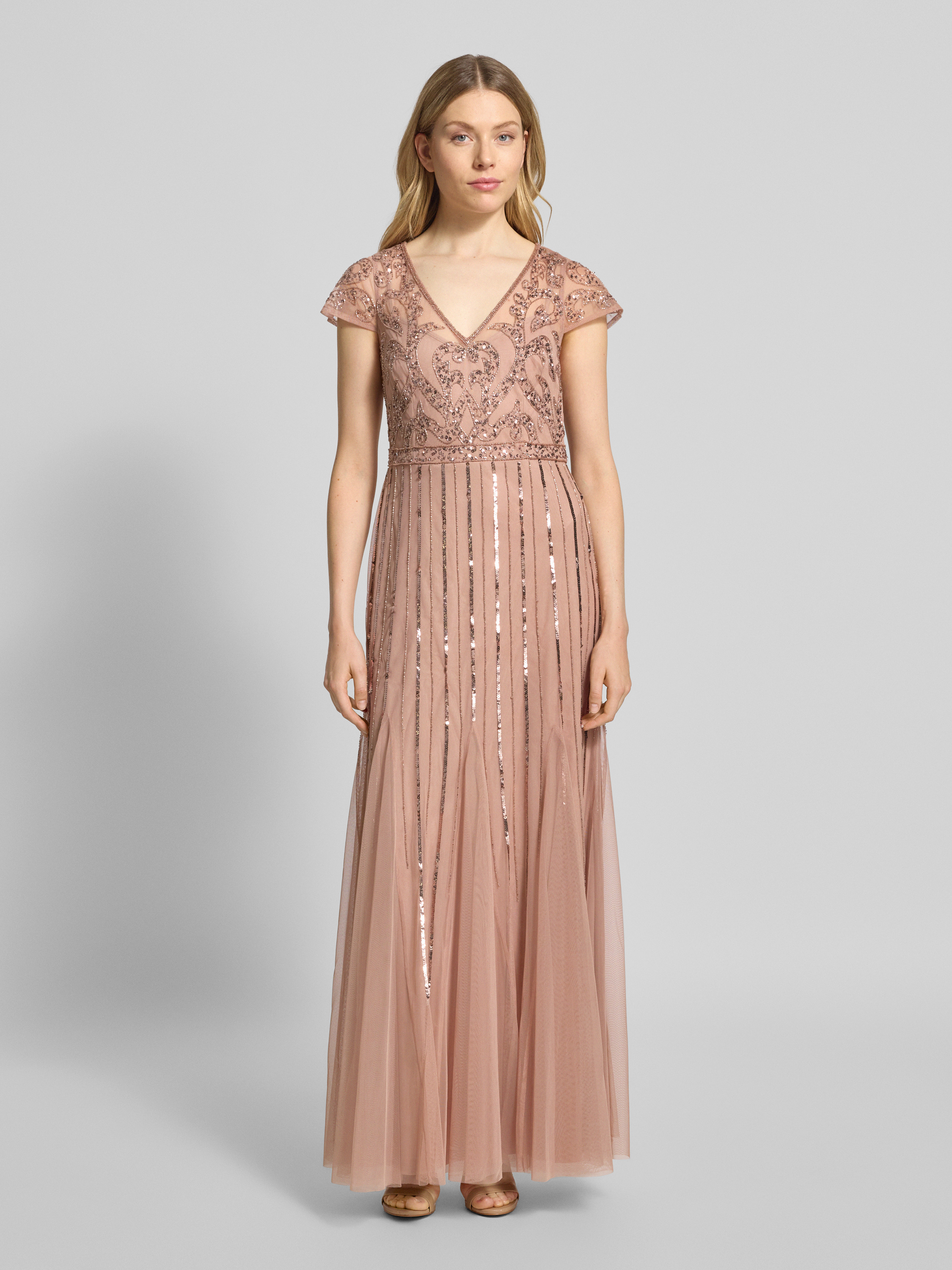 Das Damenkleid von Adrianna Papell fällt durch seinen fließenden Tüll und die ausgestellte A-Linie angenehm leicht. Der V-Ausschnitt setzt einen eleganten Akzent, während schimmernde Pailletten für besondere Effekte sorgen. Durch die bodenlange Silhouette eignet sich das Maxikleid für festliche Anlässe.