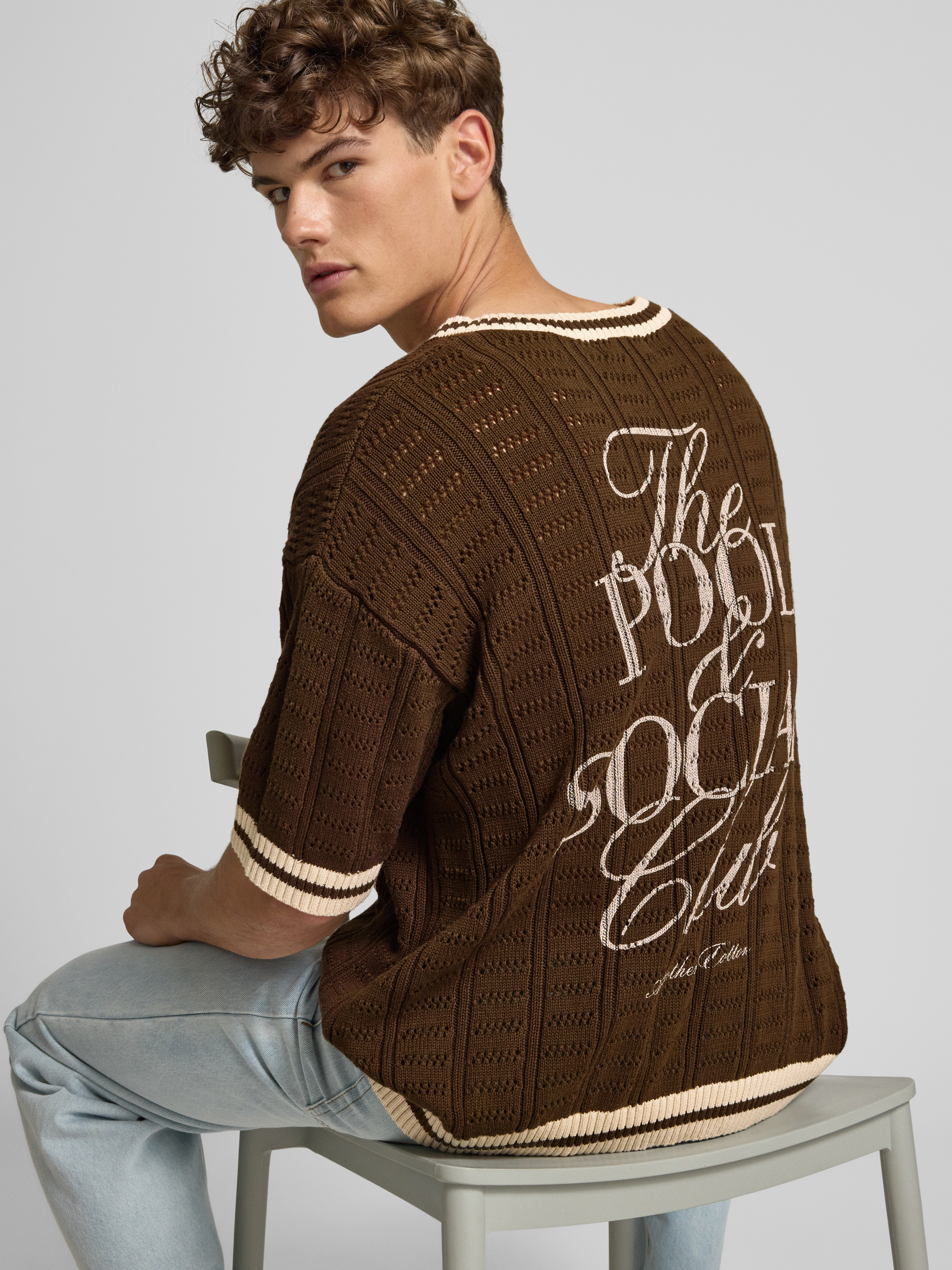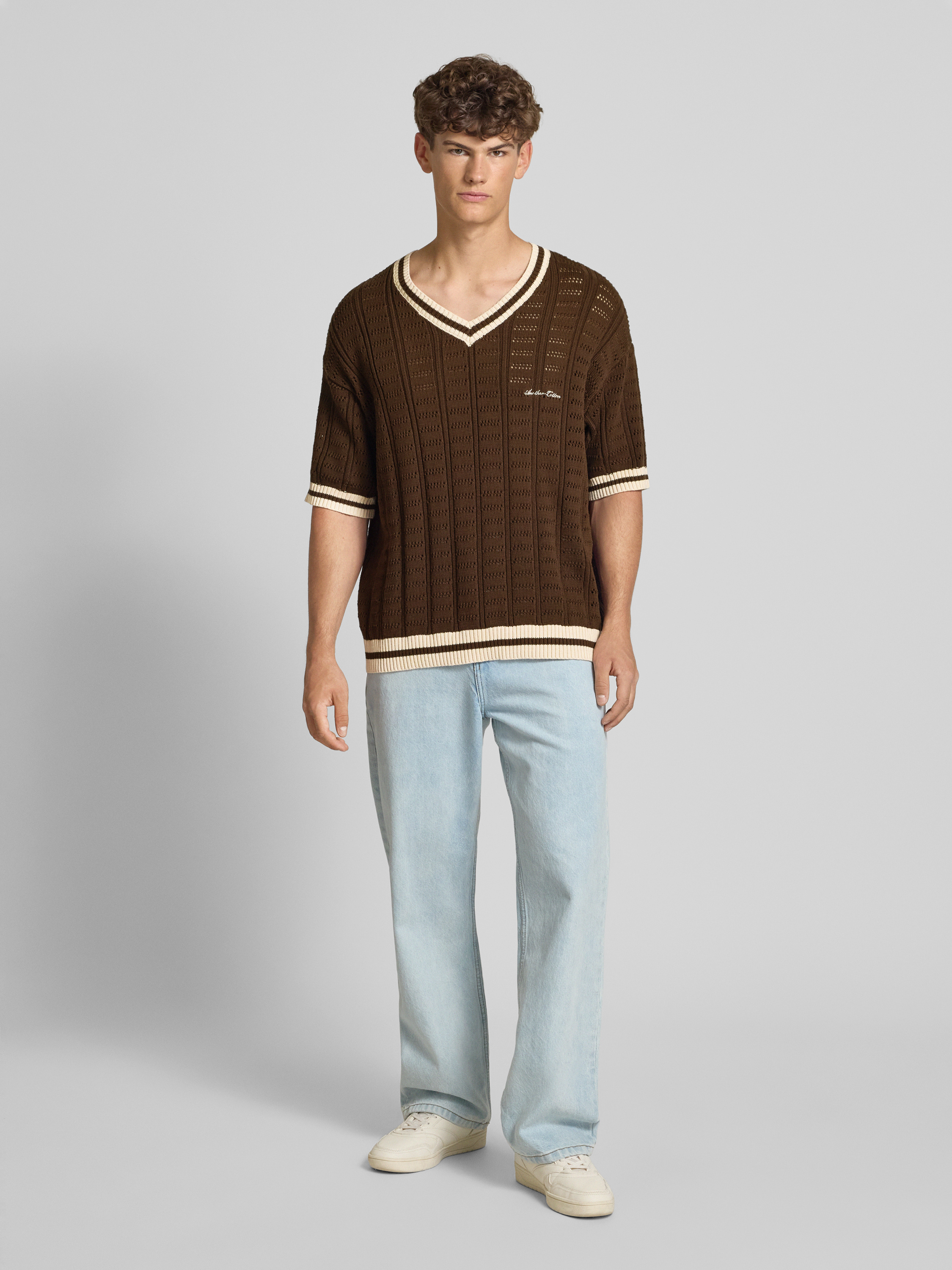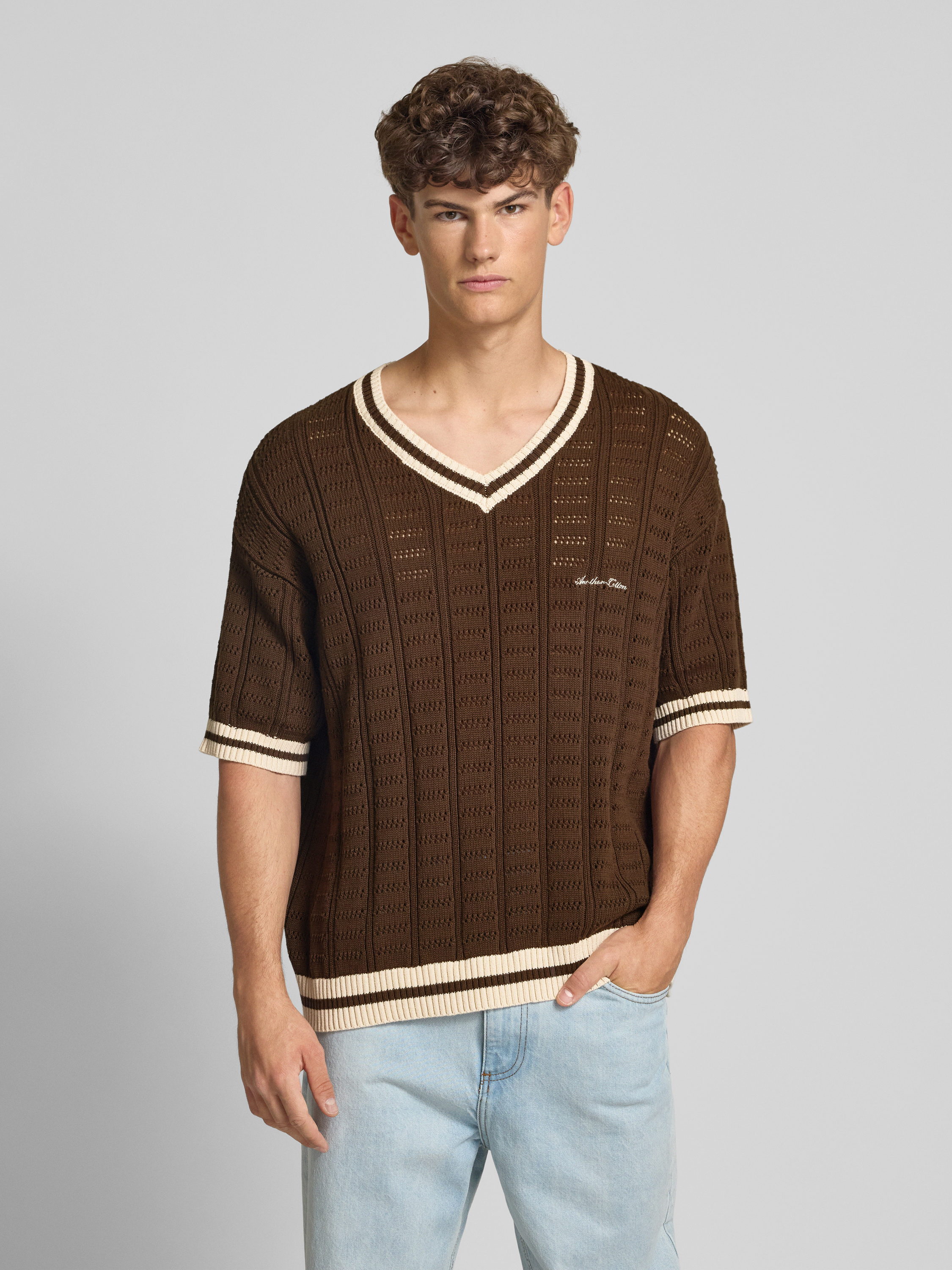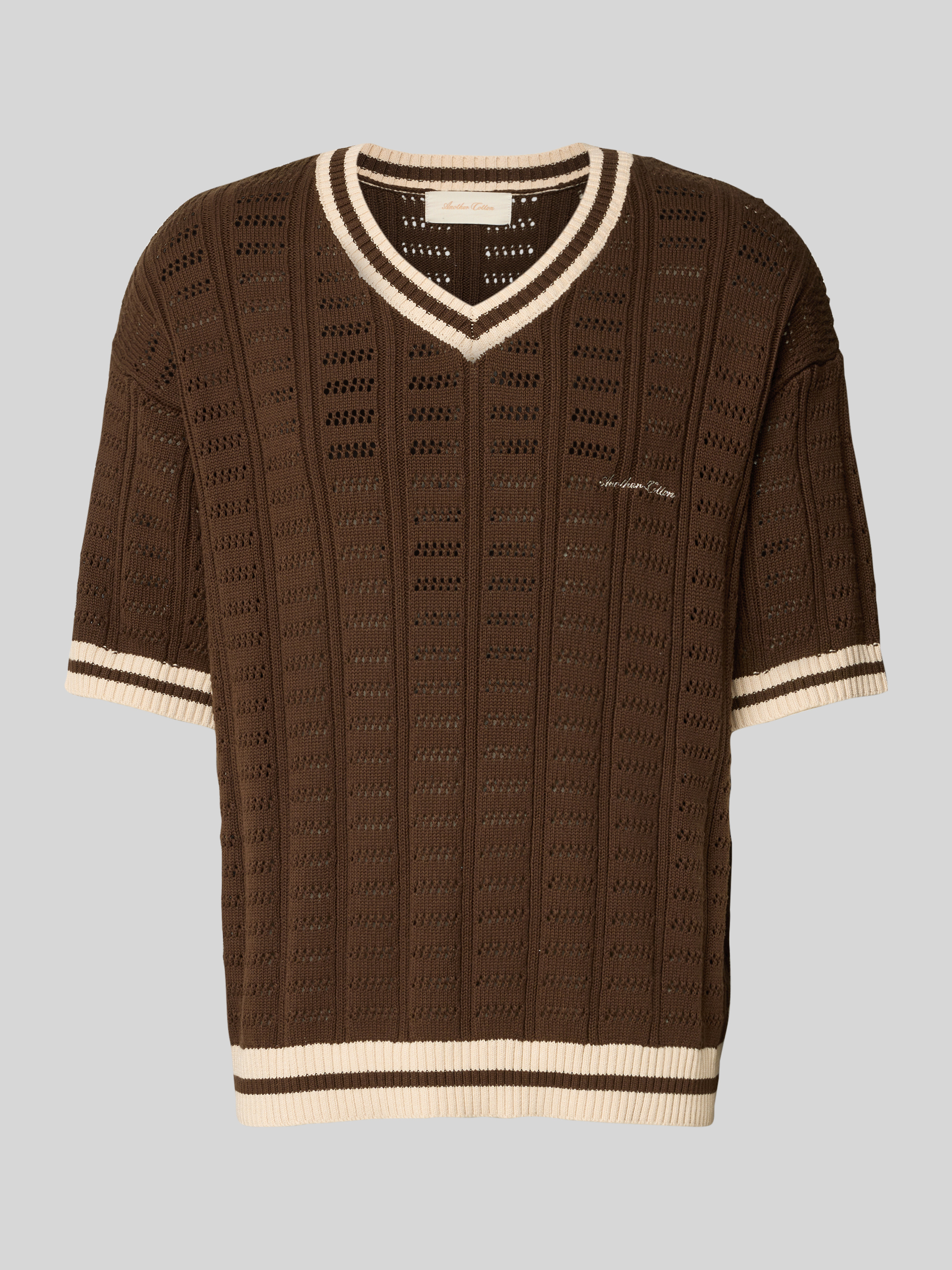 Der Herren Strickpullover von ANOTHER COTTON LAB vereint Komfort und Stil durch seinen lockeren Schnitt und den angenehmen Baumwoll-Mix. Mit einem V-Ausschnitt und kurzen Ärmeln eignet er sich ideal für entspannte Tage. Die feine Lochstickerei verleiht dem Design eine dezente Raffinesse.