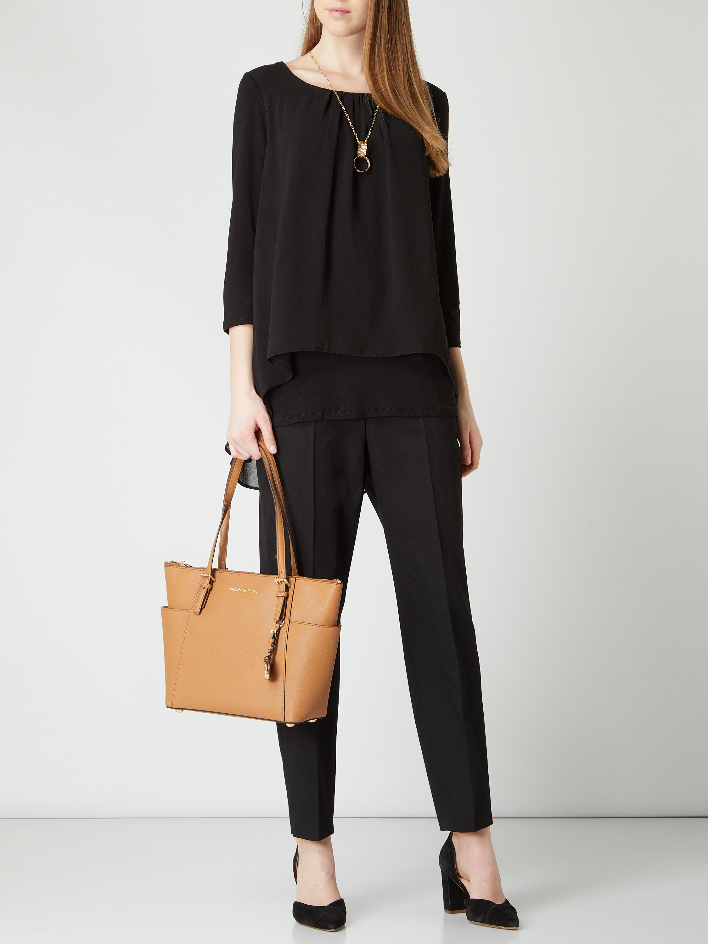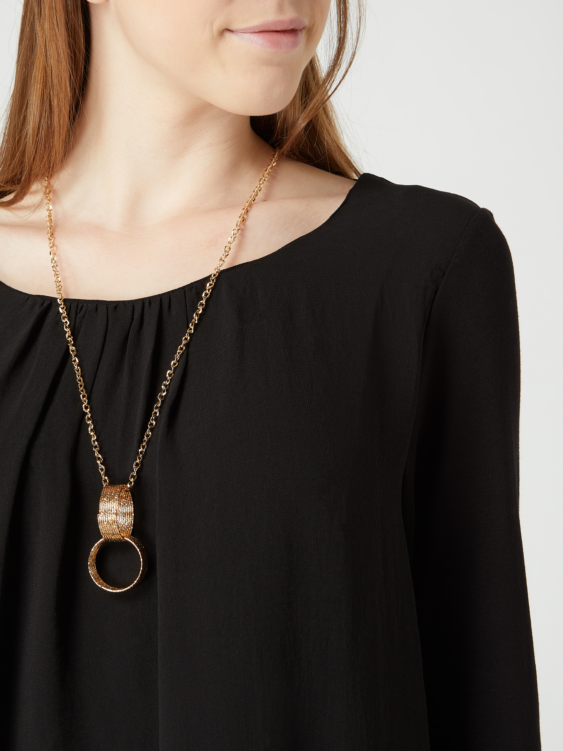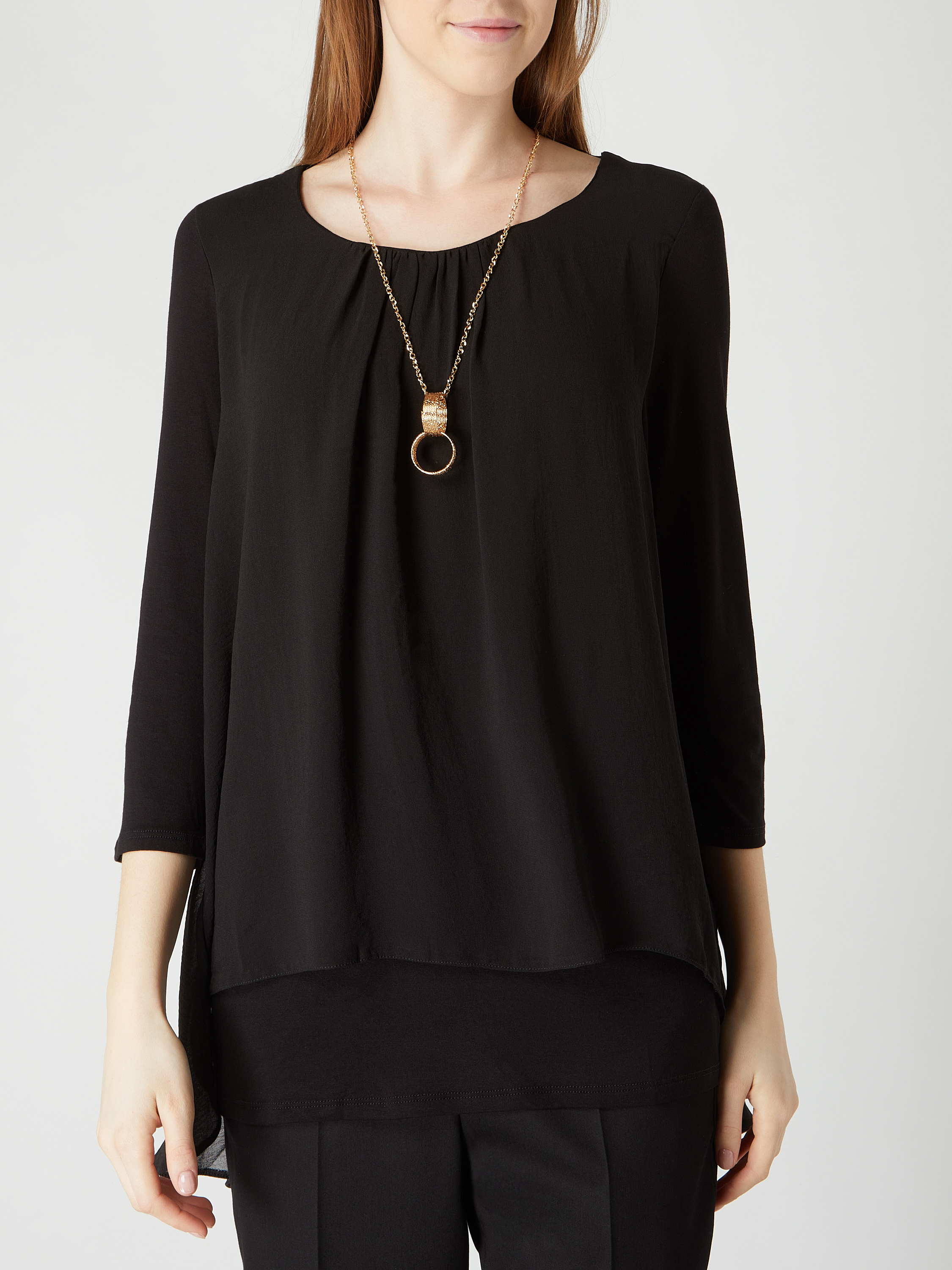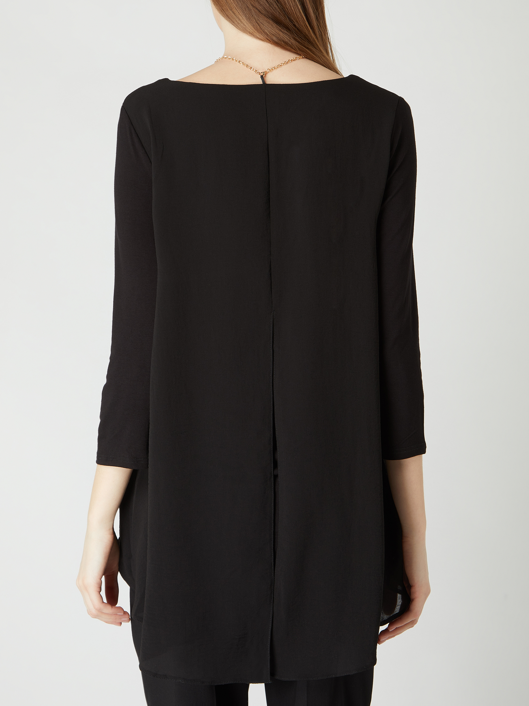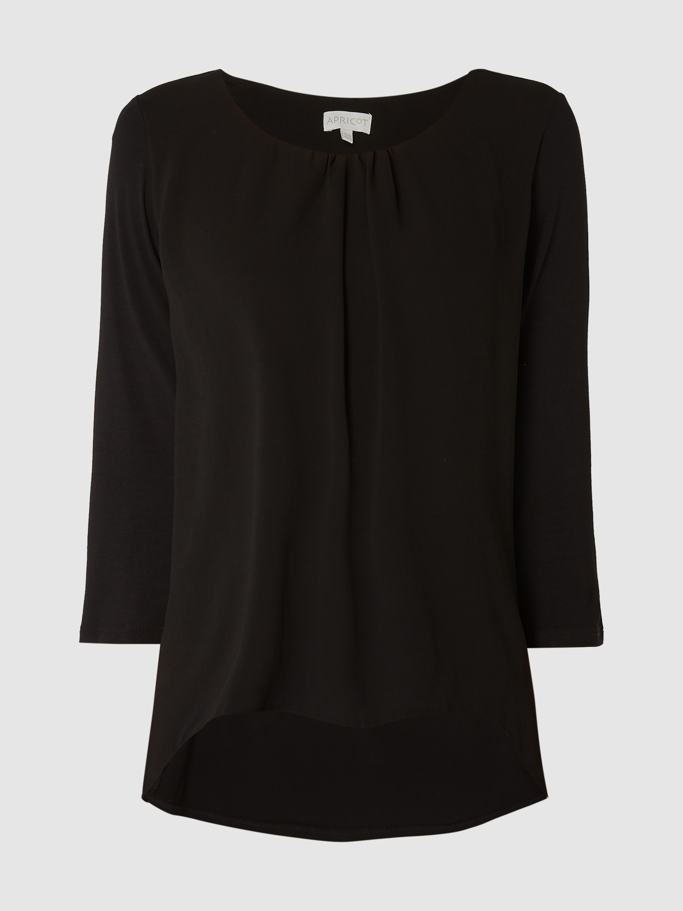 Das Blusenshirt von Apricot ist aus Chiffon gefertigt und ausgestellt geschnitten. Es zeigt sich im Double-Layer-Look mit Dreiviertel-Ärmeln und leicht verlängerter Rückseite.