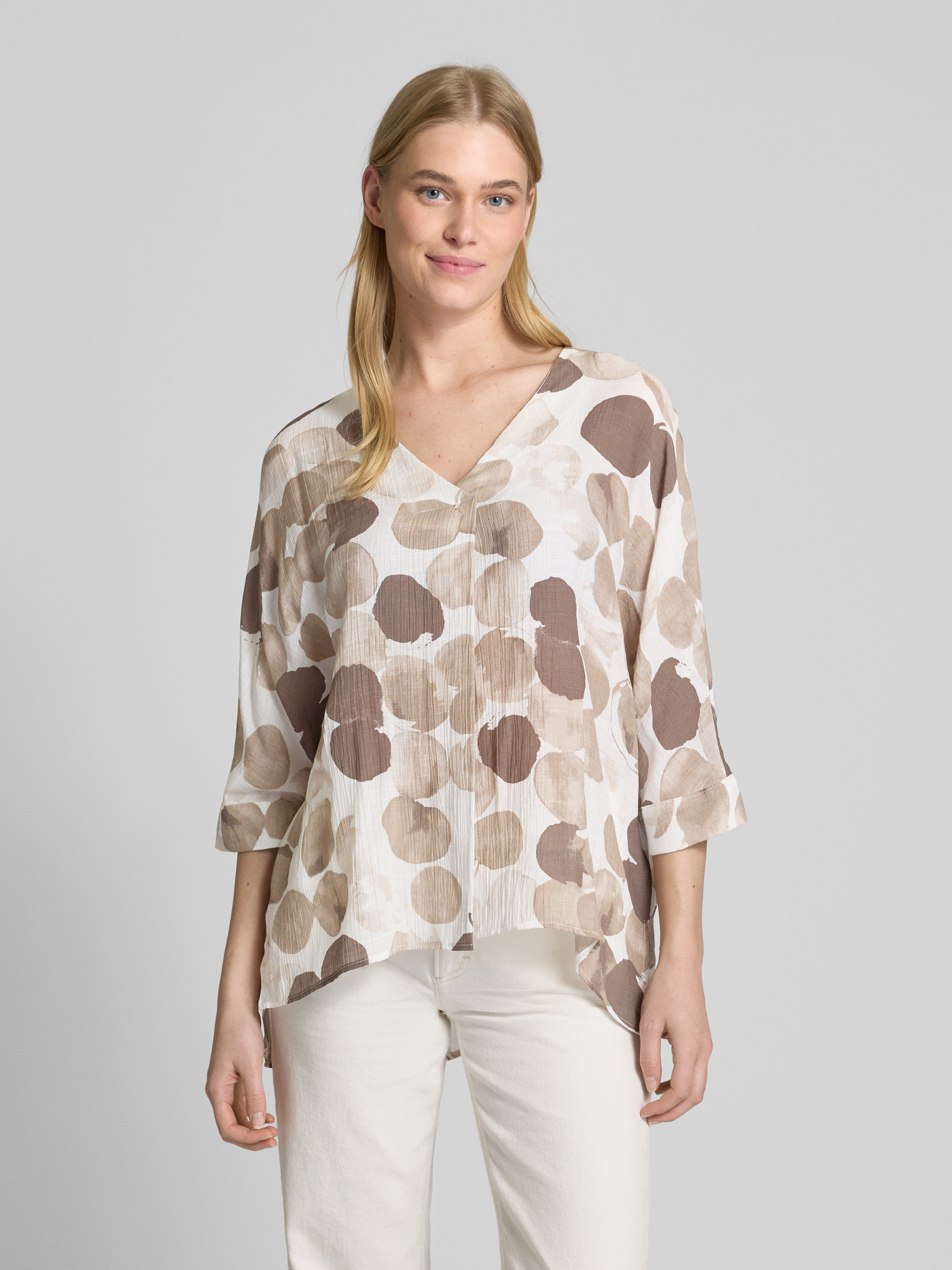 Die Apricot Bluse im Relaxed Fit vereint einen lässigen Schnitt mit einem V-Ausschnitt und 3/4-Ärmeln, wodurch sie sich ideal für vielseitige Kombinationen eignet. Der Viskose-Mix sorgt für ein angenehmes Tragegefühl. Ob im Büro oder in der Freizeit, sie passt sich mühelos an.