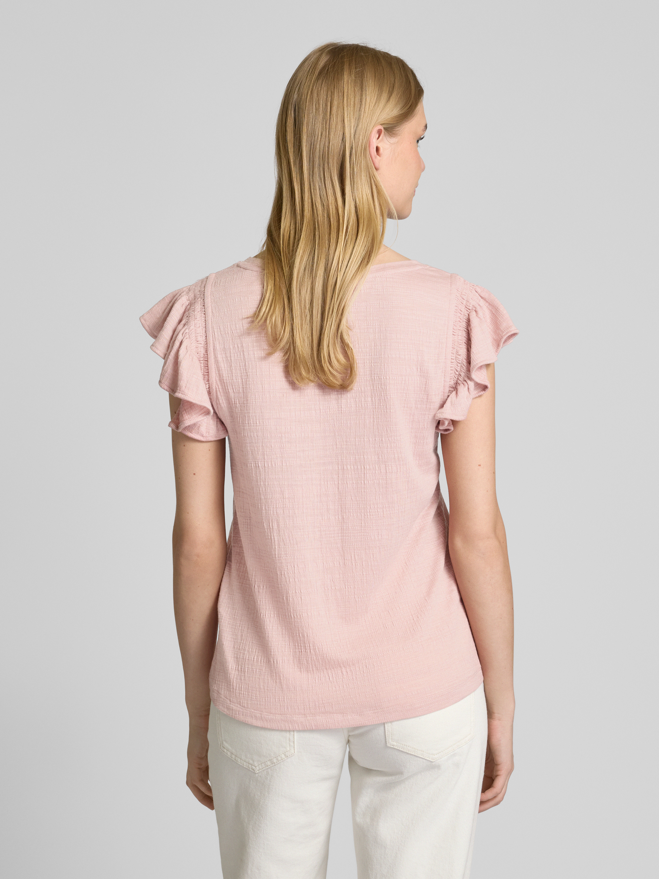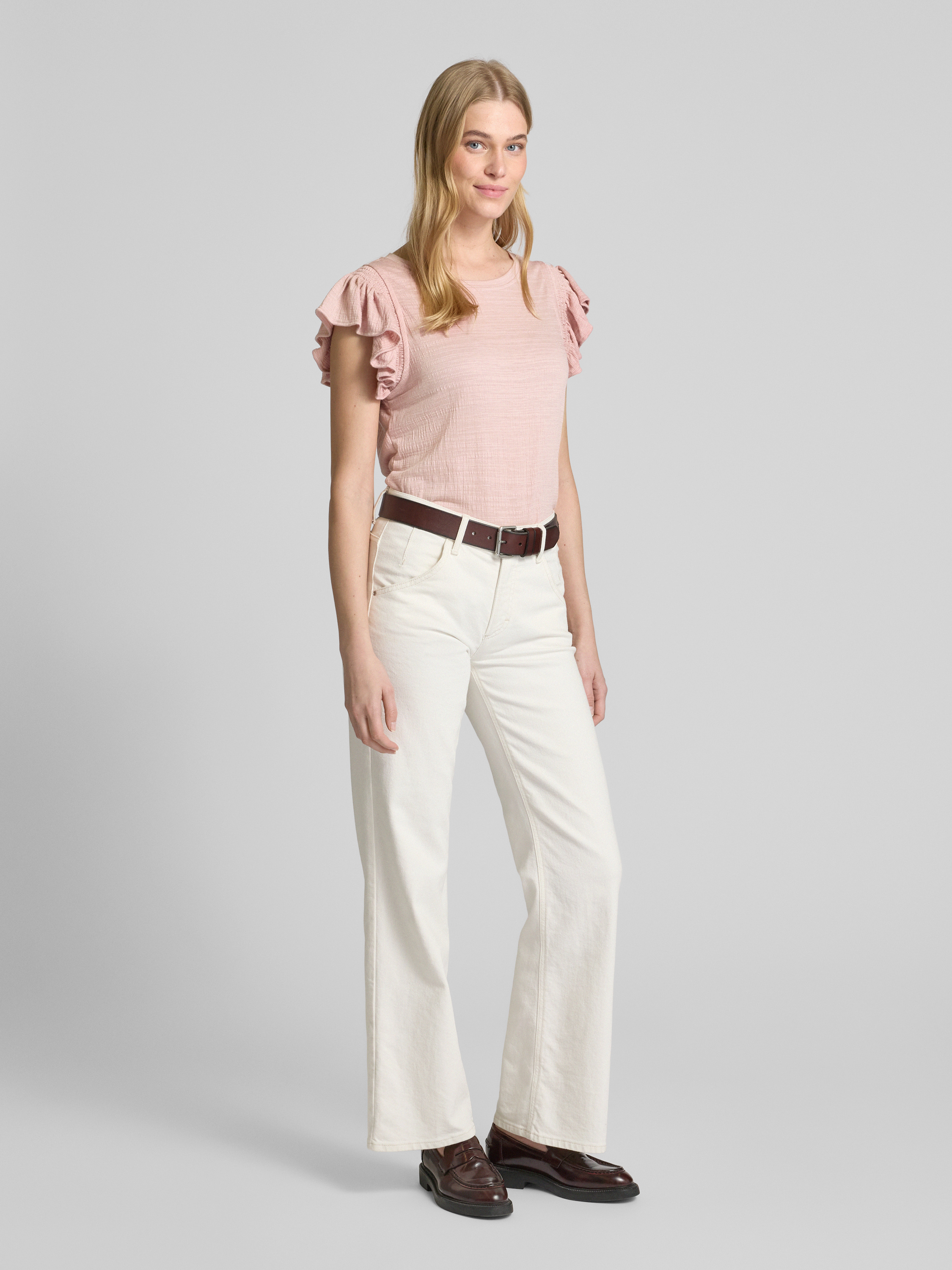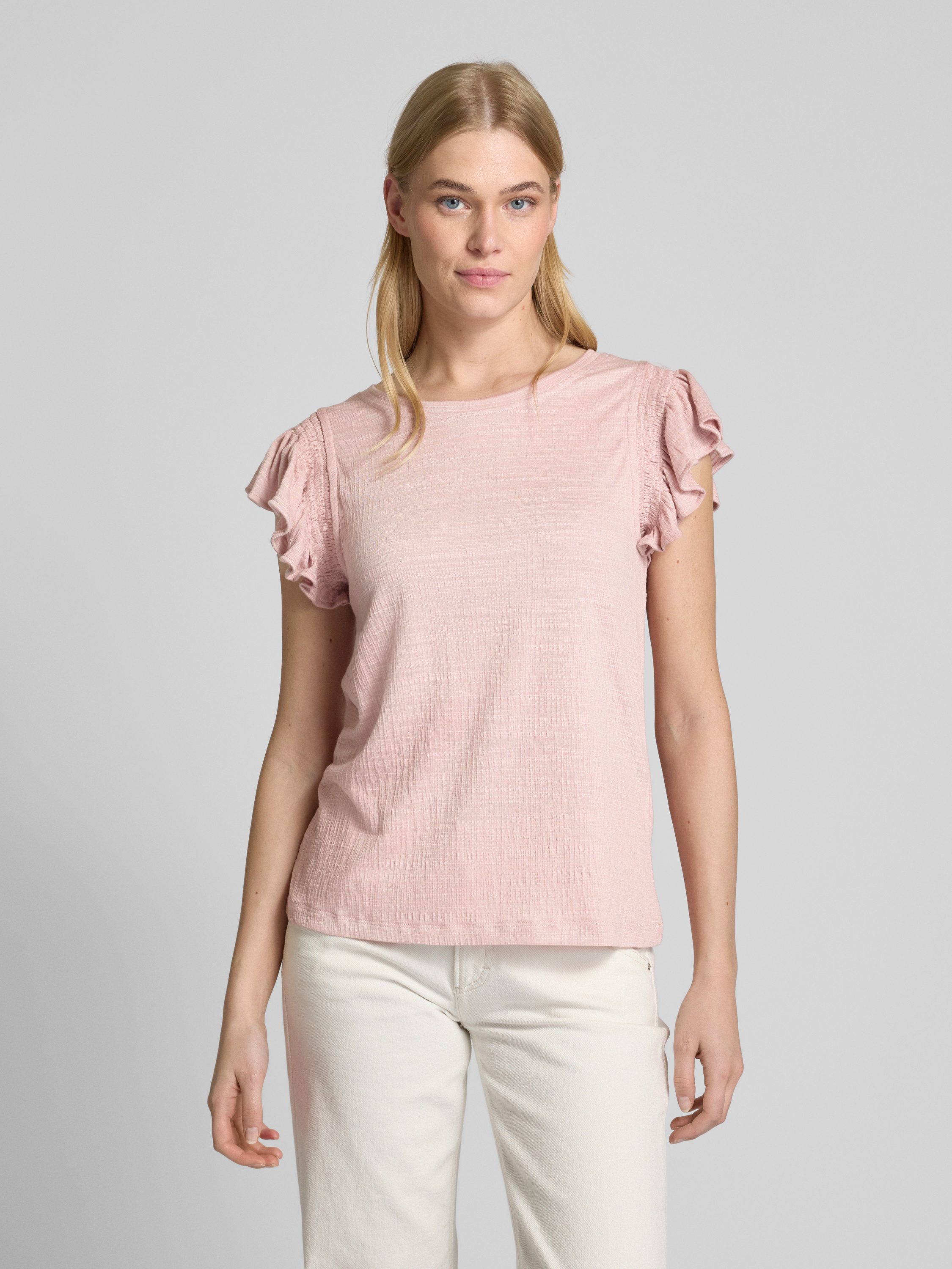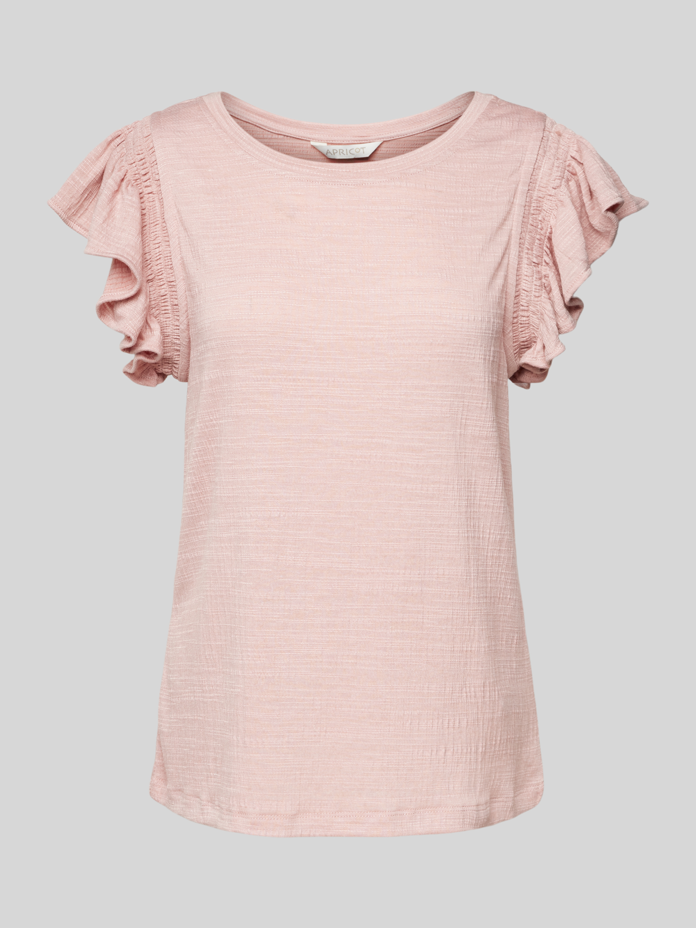 Das T-Shirt von Apricot kombiniert einen geraden Schnitt mit einem eleganten U-Boot-Ausschnitt und zarten Volants, die dem Design eine feminine Note verleihen. Der angenehme Material-Mix mit Viskose-Anteil sorgt für ein komfortables Tragegefühl. Ein vielseitiges Kleidungsstück, das sich ideal für verschiedene Anlässe eignet.