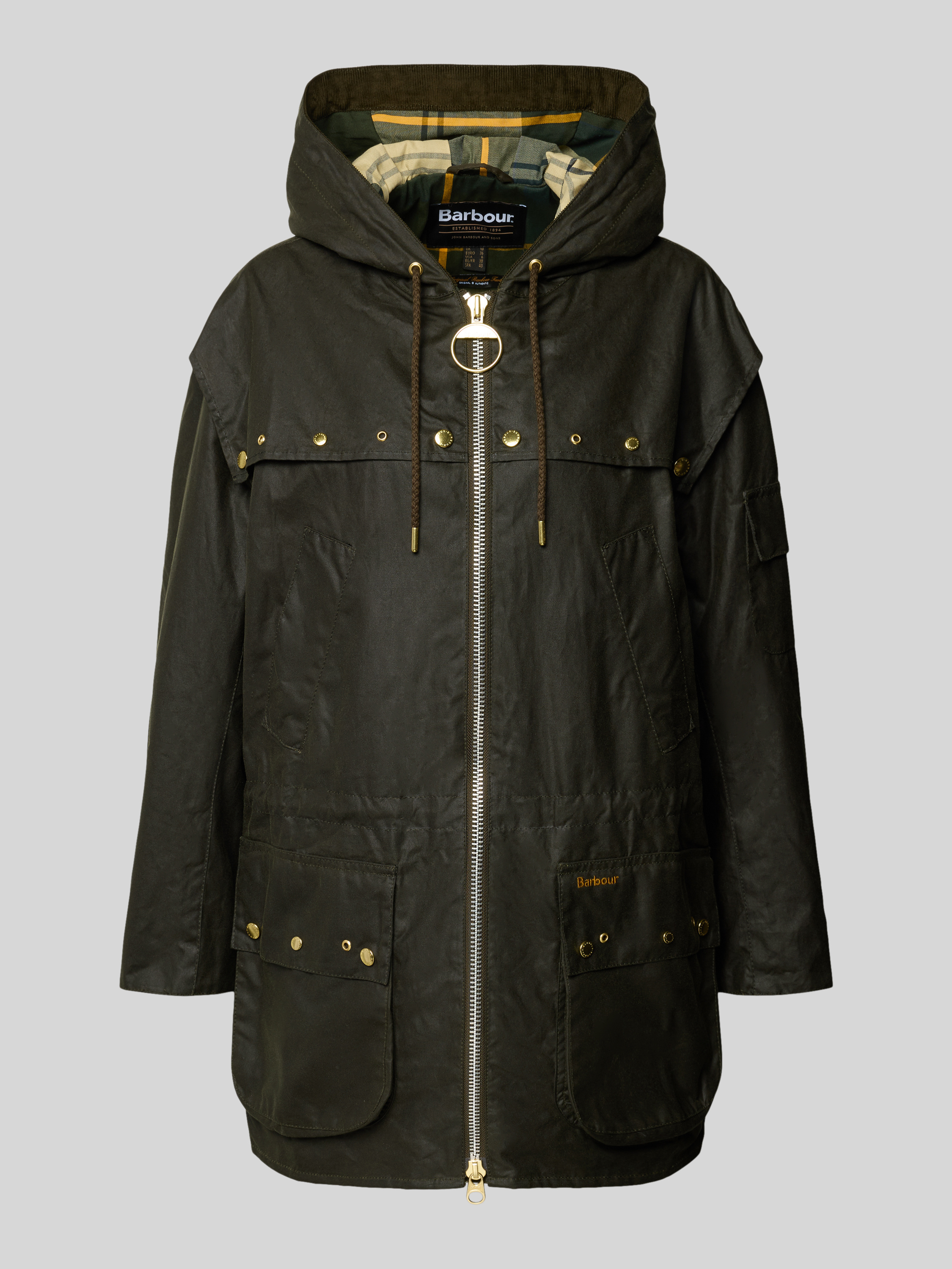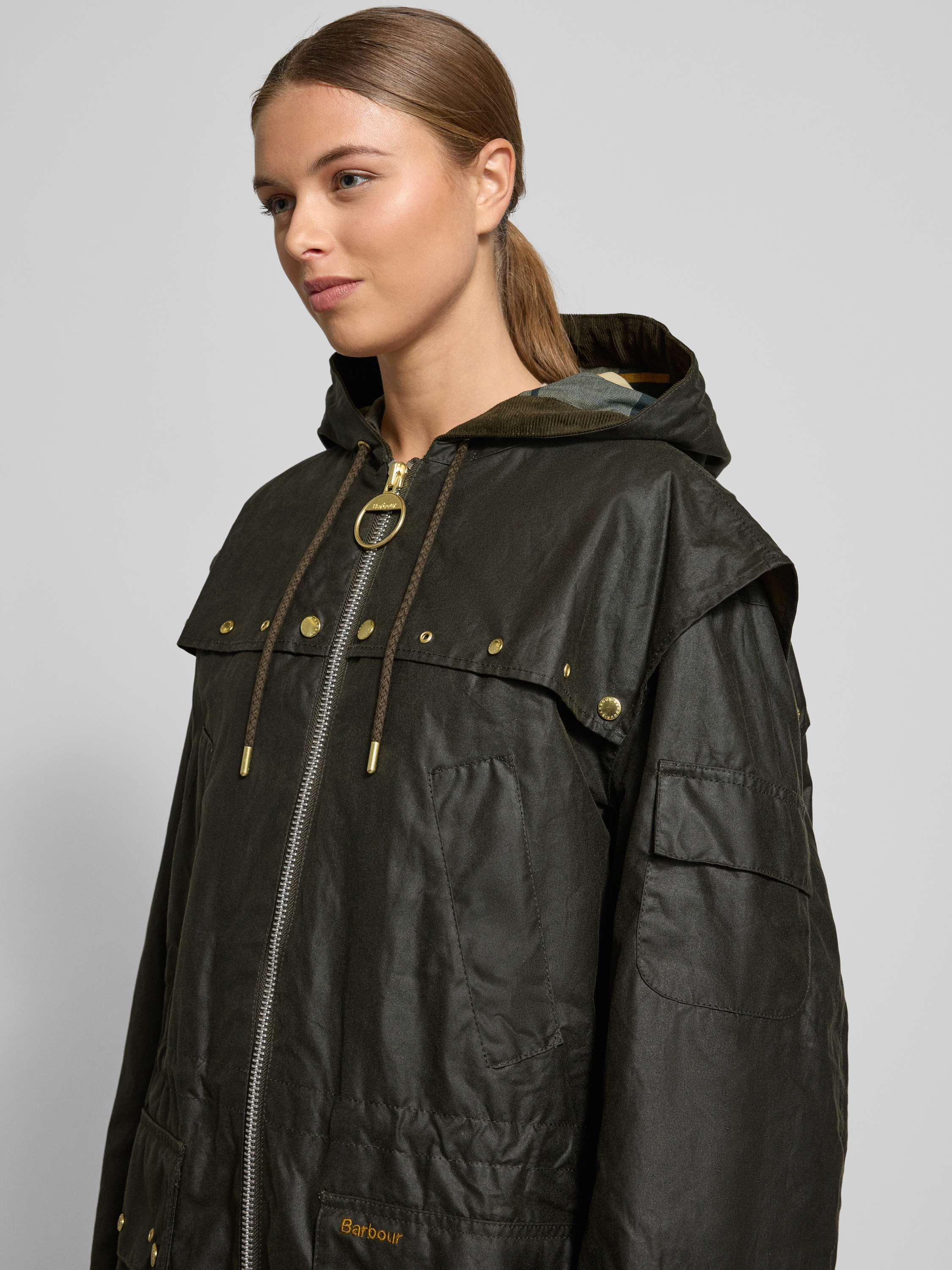 Die Damen Funktionsjacke von Barbour zeigt sich in Regular-Fit und schlichter, unifarbener Optik. Durch die gewachste Baumwolle entsteht eine strukturierte Oberfläche, die im Alltag strapazierfähig wirkt und angenehm zu tragen ist. Praktische Details wie Kapuze mit Tunnelzug und vielseitige Taschen runden das Modell funktional ab.