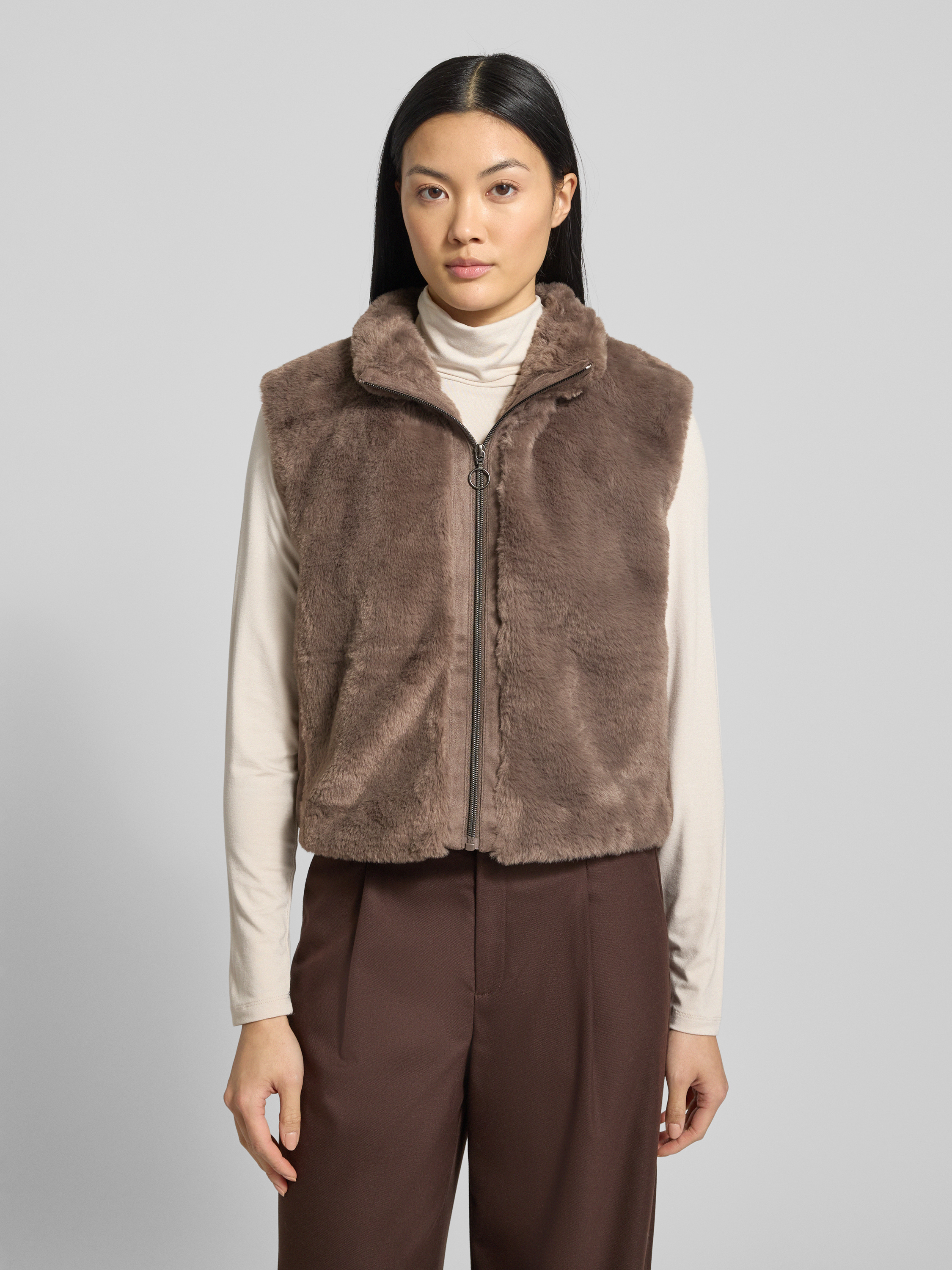 Die Damen Weste von Betty Barclay legt mit ihrem Regular Fit Wert auf eine bequeme Passform, wodurch sie sich unkompliziert in verschiedene Outfits einfügt. Weiches Kunstfell sorgt für ein angenehmes Tragegefühl, während der Stehkragen den Halsbereich leicht wärmt. So entsteht ein vielseitiger Begleiter, der unkompliziert kombiniert werden kann.
