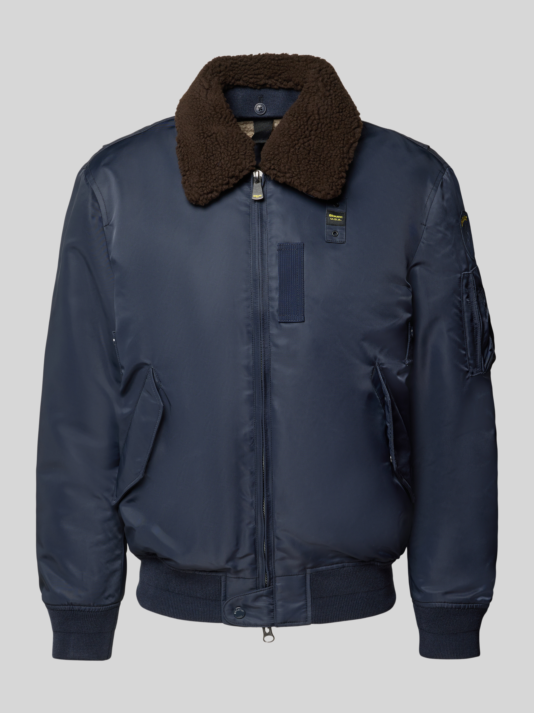 Die Herrenjacke von Blauer Usa, Modell 'MARSHALL', präsentiert sich in regulärer Passform und bringt durch den Umlegekragen eine klassische Note ein. Dank der großzügig geschnittenen Form lässt sich diese Bomberjacke unkompliziert kombinieren. Praktische Pattentaschen verstauen Kleinigkeiten sicher unterwegs.