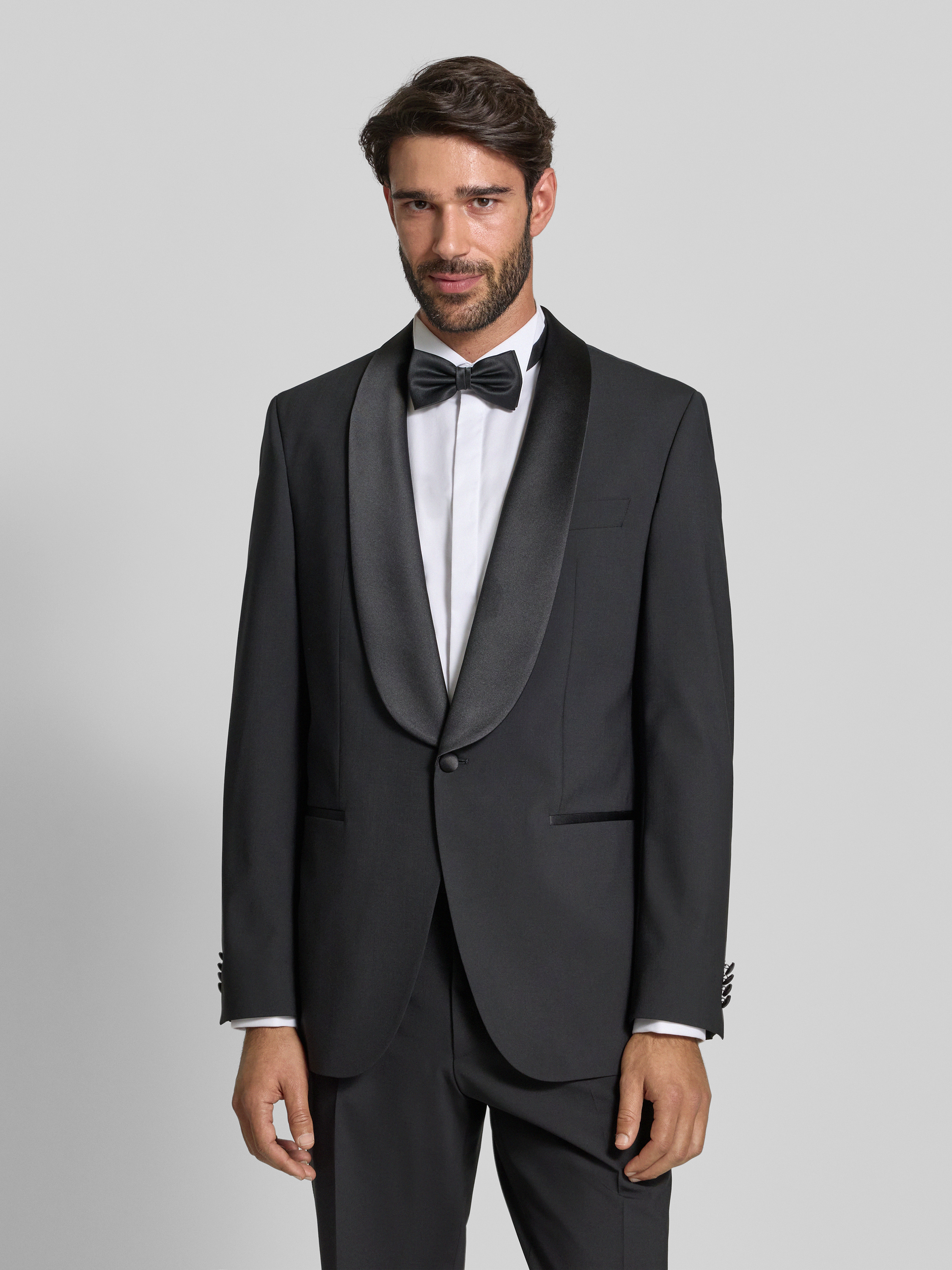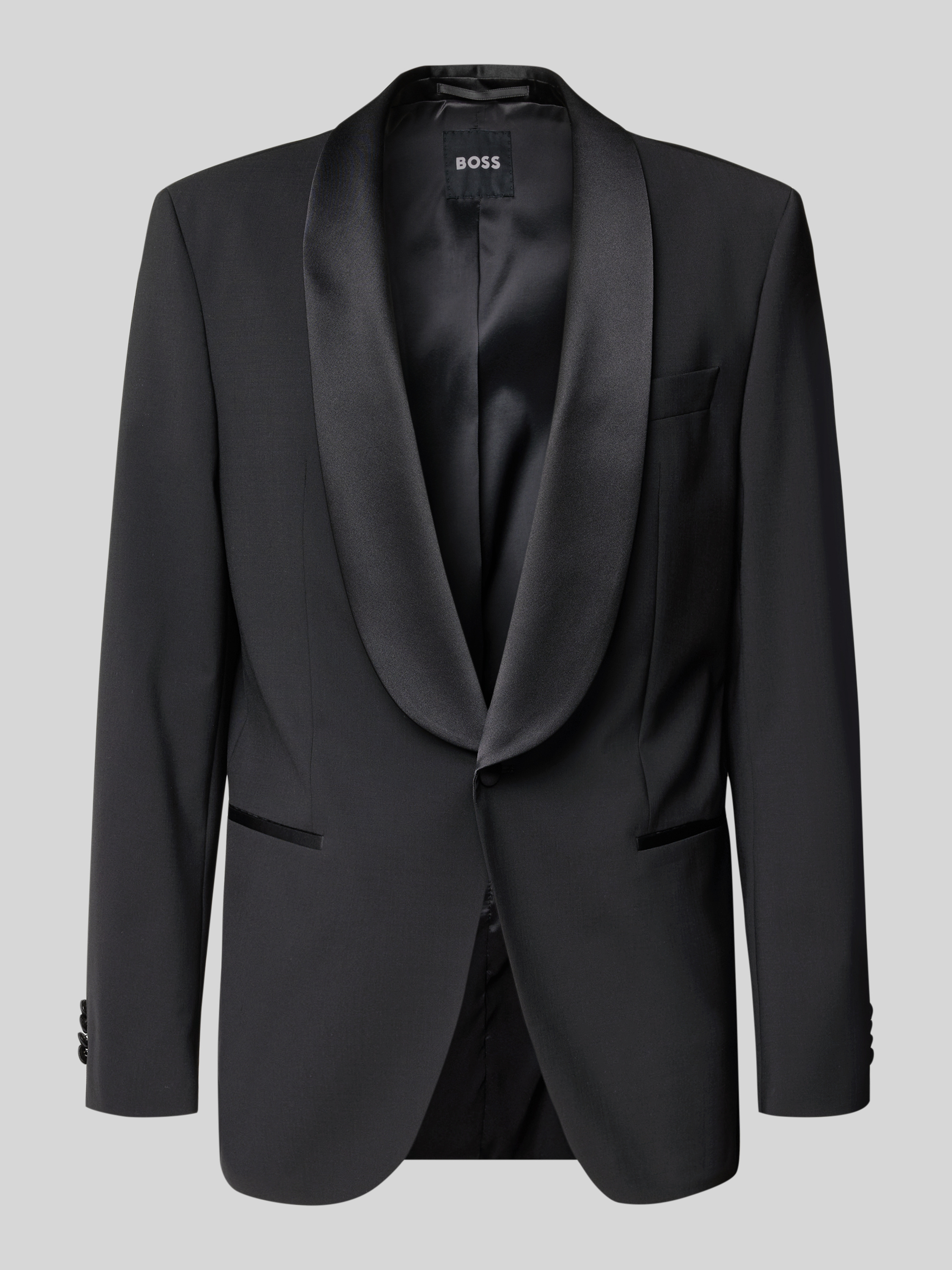 Das Herren Anzugsakko von BOSS, Modell 'JASPER TUX', zeigt sich im unifarbenen Design und Regular-Fit-Schnitt, wodurch ein klassischer Look entsteht, der unkompliziert kombinierbar ist. Der Schalkragen aus Satin sorgt für einen eleganten Akzent, während der Schurwoll-Mix angenehmen Tragekomfort über den Tag hinweg ermöglicht. So lässt sich das Sakko vielseitig einsetzen, ob im Alltag oder zu besonderen Anlässen.