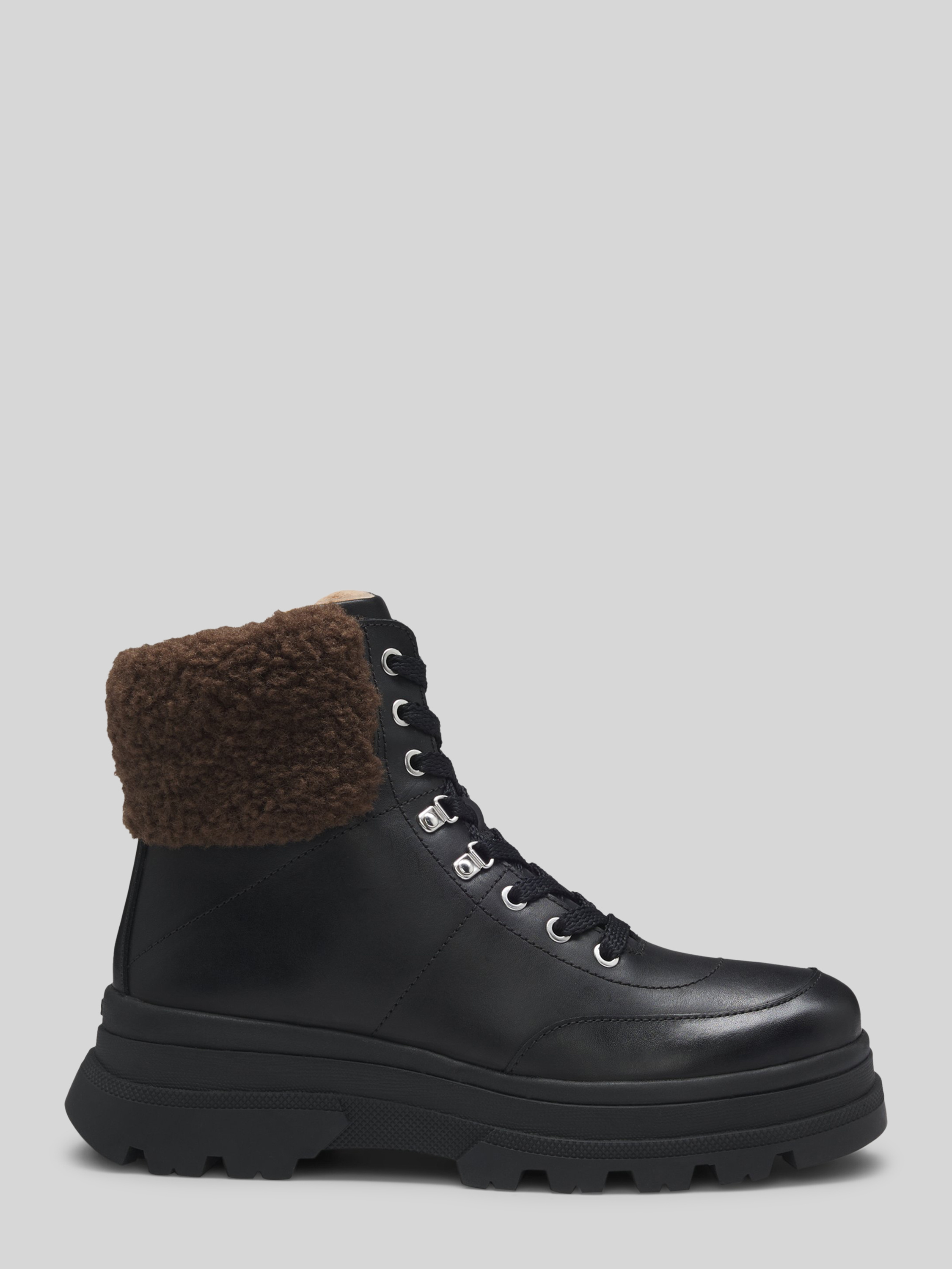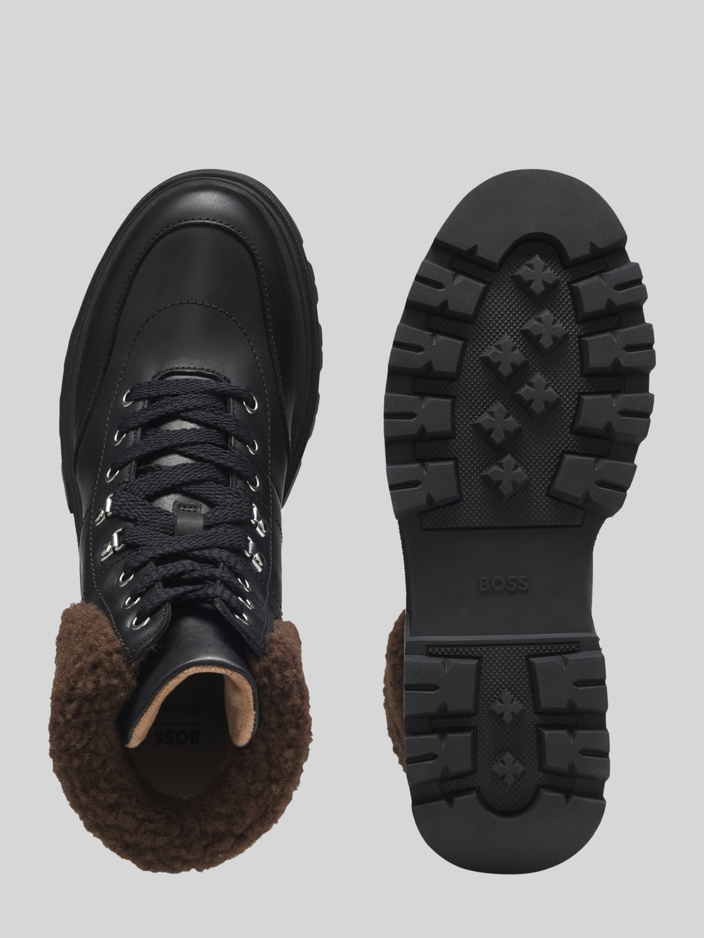 Die Damen Boots von BOSS, Modell 'FOSTER', zeigen sich in unifarbener Optik mit abgerundeter Schuhspitze und flacher Absatzform. Durch das hochwertige echte Leder erhält man ein angenehmes Tragegefühl sowie eine langlebige Begleitung für verschiedenste Anlässe. Ein Webpelzbesatz rundet das Design dezent ab.