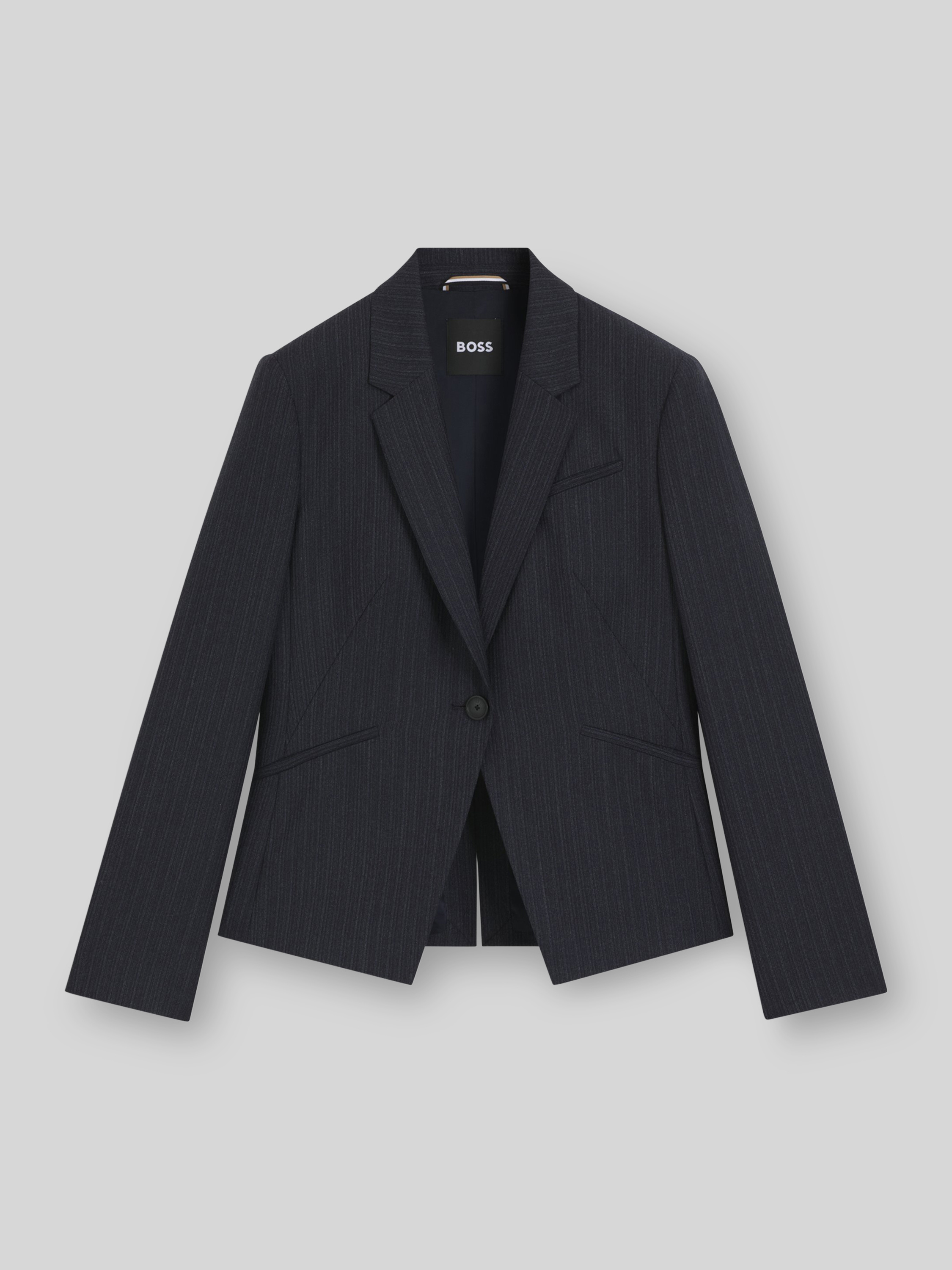 Der Damen Kurzblazer von BOSS aus reiner Schurwolle liegt angenehm auf der Haut und sorgt durch die schlanke Passform für eine moderne Silhouette. Ein feines Nadelstreifenmuster bringt dezente Struktur ins Outfit, während der Reverskragen einen klassischen Akzent setzt. Mit seinem Allover-Muster eignet sich der Blazer für vielfältige Kombinationen im Alltag.