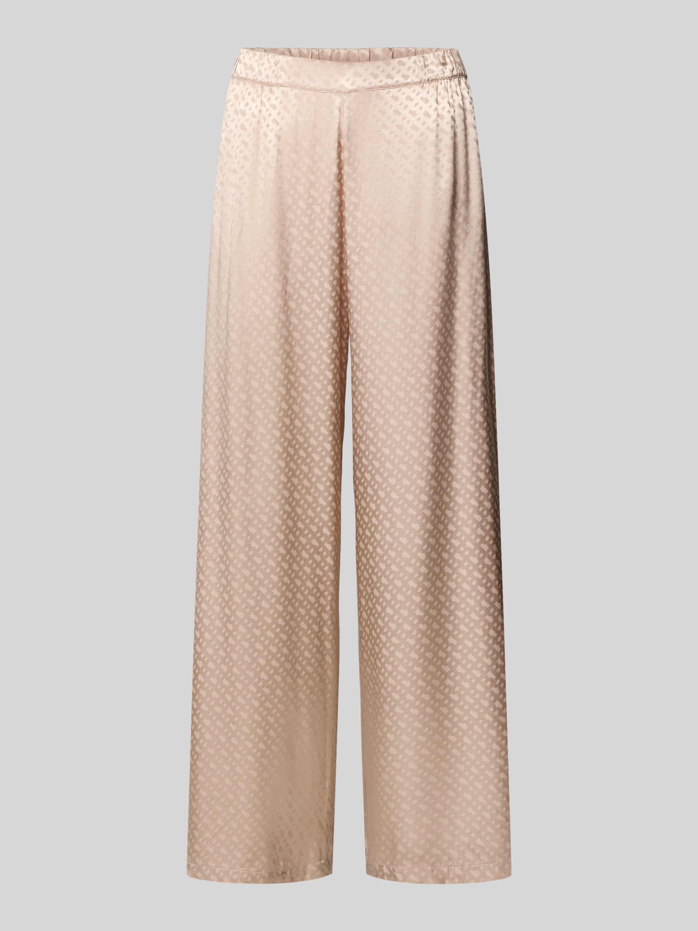 Die Damenhose von BOSS, Modell Monogram_Pants, fällt durch ihren lässigen Wide-Leg-Schnitt auf und sorgt so für spürbar angenehme Bewegungsfreiheit beim Tragen. Der glatte Satin aus reiner Viskose liegt besonders weich auf der Haut. Dezente Logo-Prägungen setzen einen zurückhaltenden Akzent.