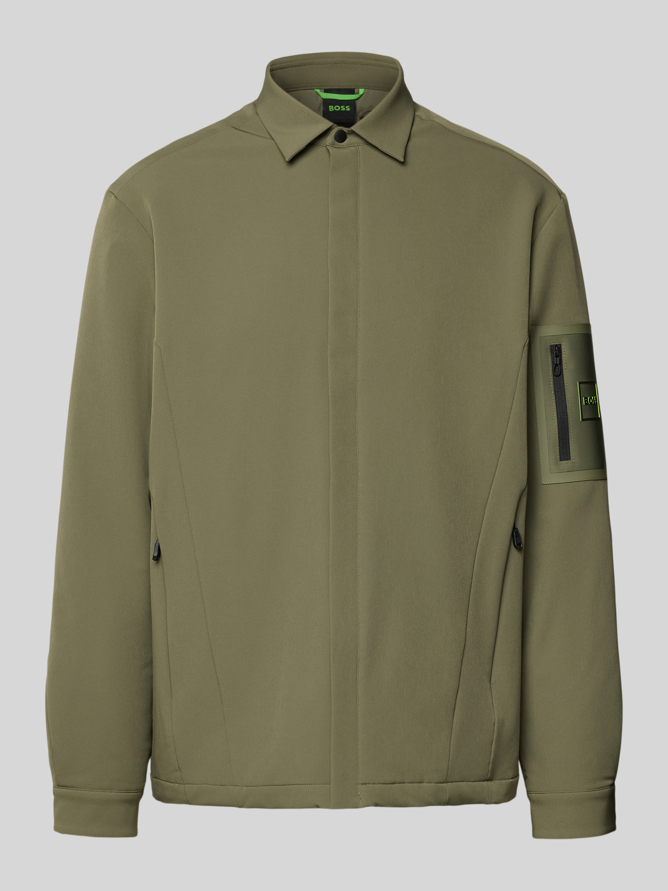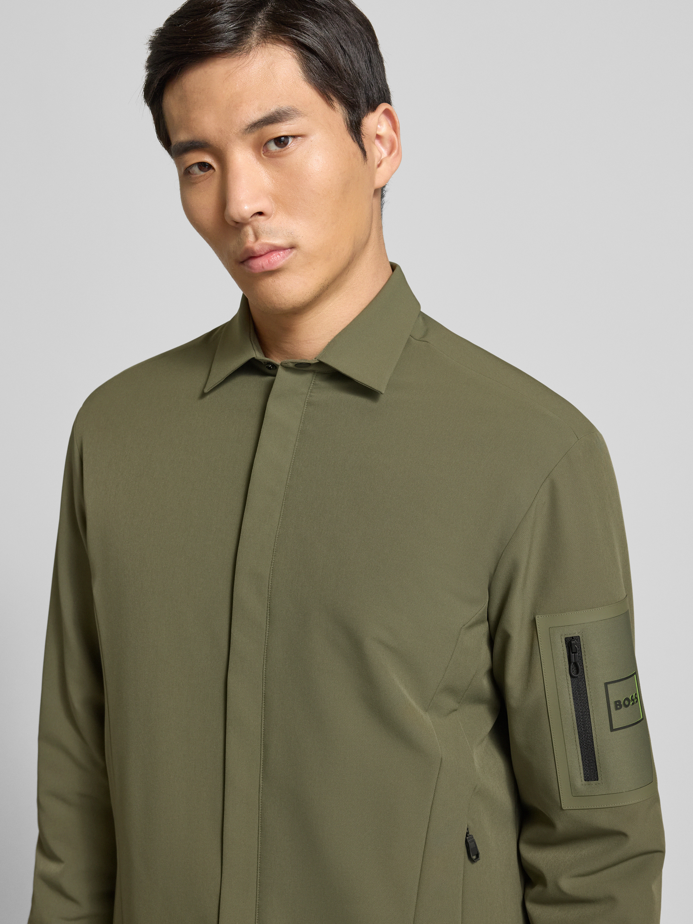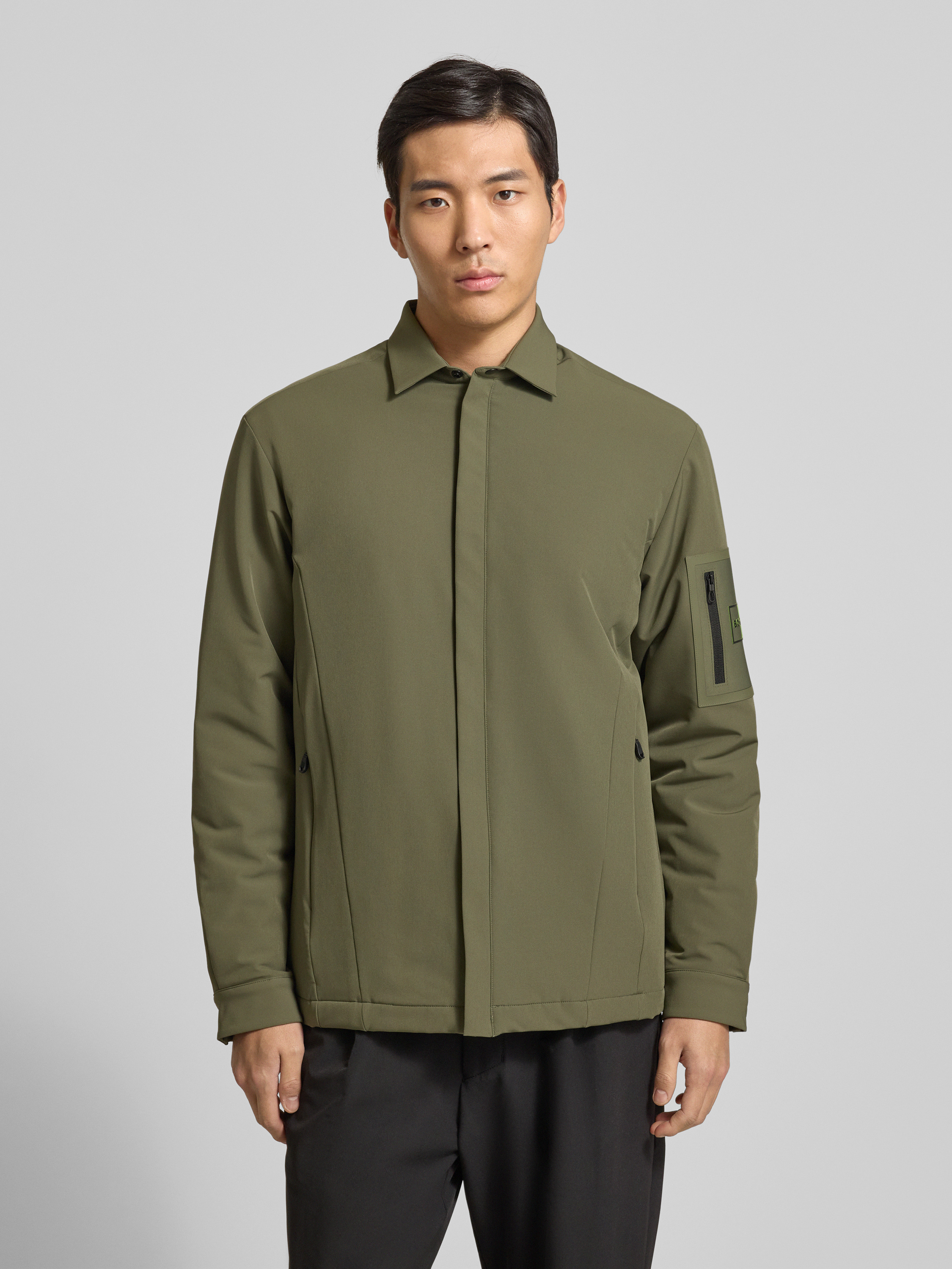 Die Herren Funktionsjacke von BOSS Green, Modell ST_Expedit Padded L, fällt durch ihre unifarbene Optik und die Regular-Fit Passform angenehm leger aus. Das wasserabweisende Material fühlt sich leicht an, schützt vor Nässe und trocknet nach einem Schauer zügig. Praktisch zeigt sich der Umlegekragen und die intelligente Aufteilung der Taschen, sodass unterwegs alles griffbereit bleibt.