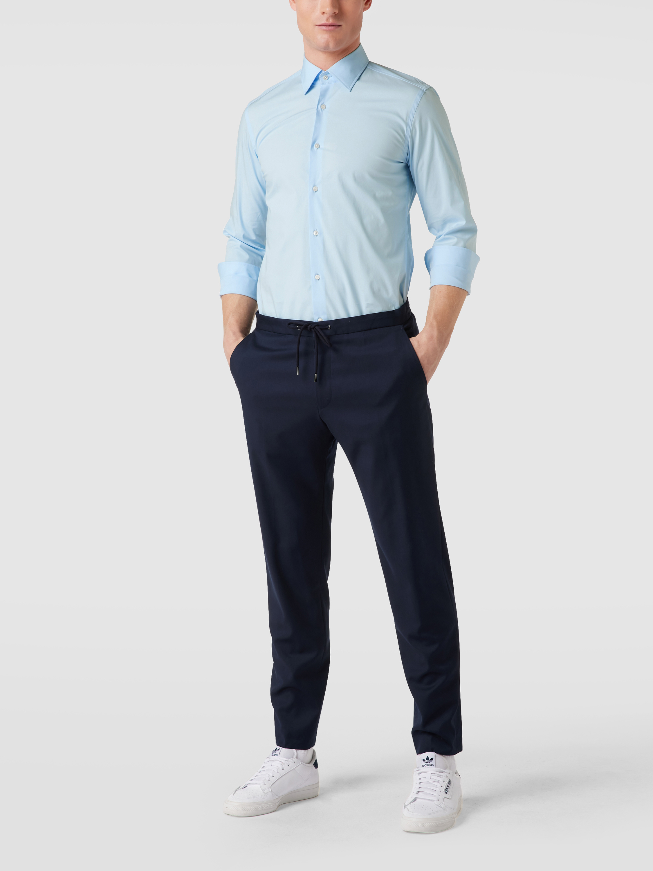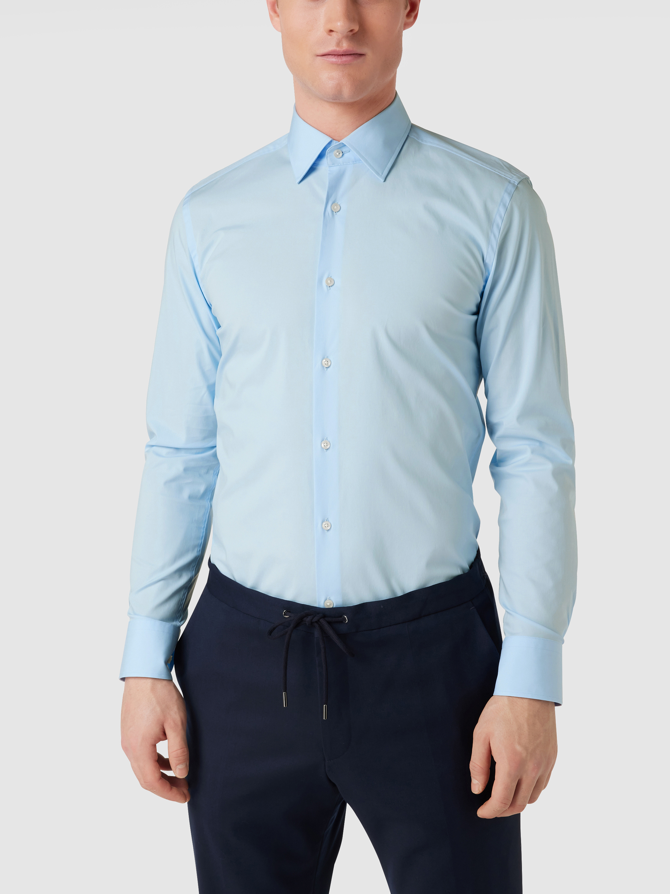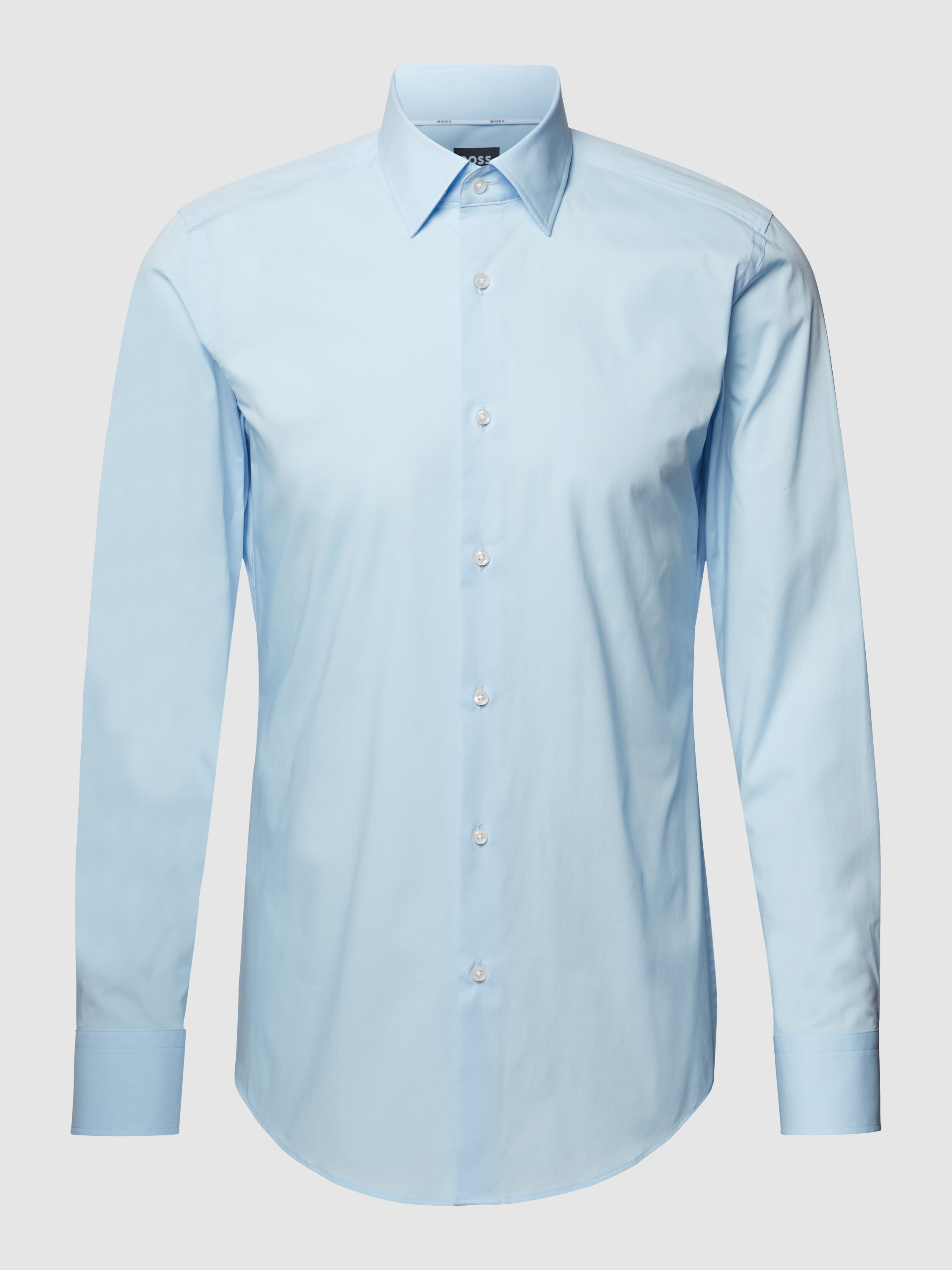 Das BOSS Businesshemd kombiniert einen eleganten Kentkragen mit einer schmalen Slim Fit Passform, die durch den Baumwoll-Elasthan-Mix Bewegungsfreiheit bietet. Durch die Easycare-Ausstattung wird die Pflege erleichtert, während der abgerundete Saum einen modernen Look schafft. Sportmanschetten runden das Design stilvoll ab.