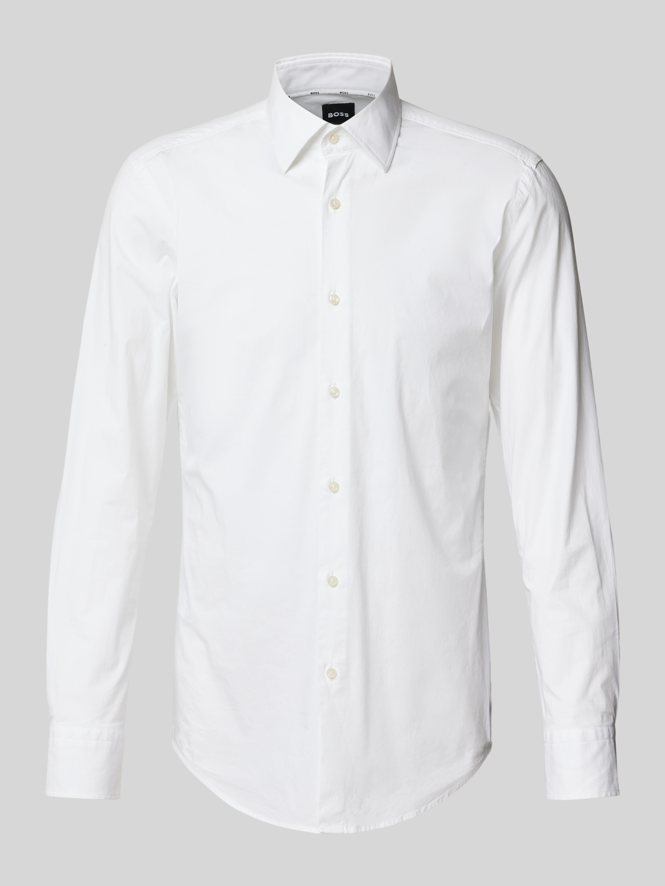 Das BOSS Businesshemd kombiniert einen eleganten Kentkragen mit einer schmalen Slim Fit Passform, die durch den Baumwoll-Elasthan-Mix Bewegungsfreiheit bietet. Durch die Easycare-Ausstattung wird die Pflege erleichtert, während der abgerundete Saum einen modernen Look schafft. Sportmanschetten runden das Design stilvoll ab.