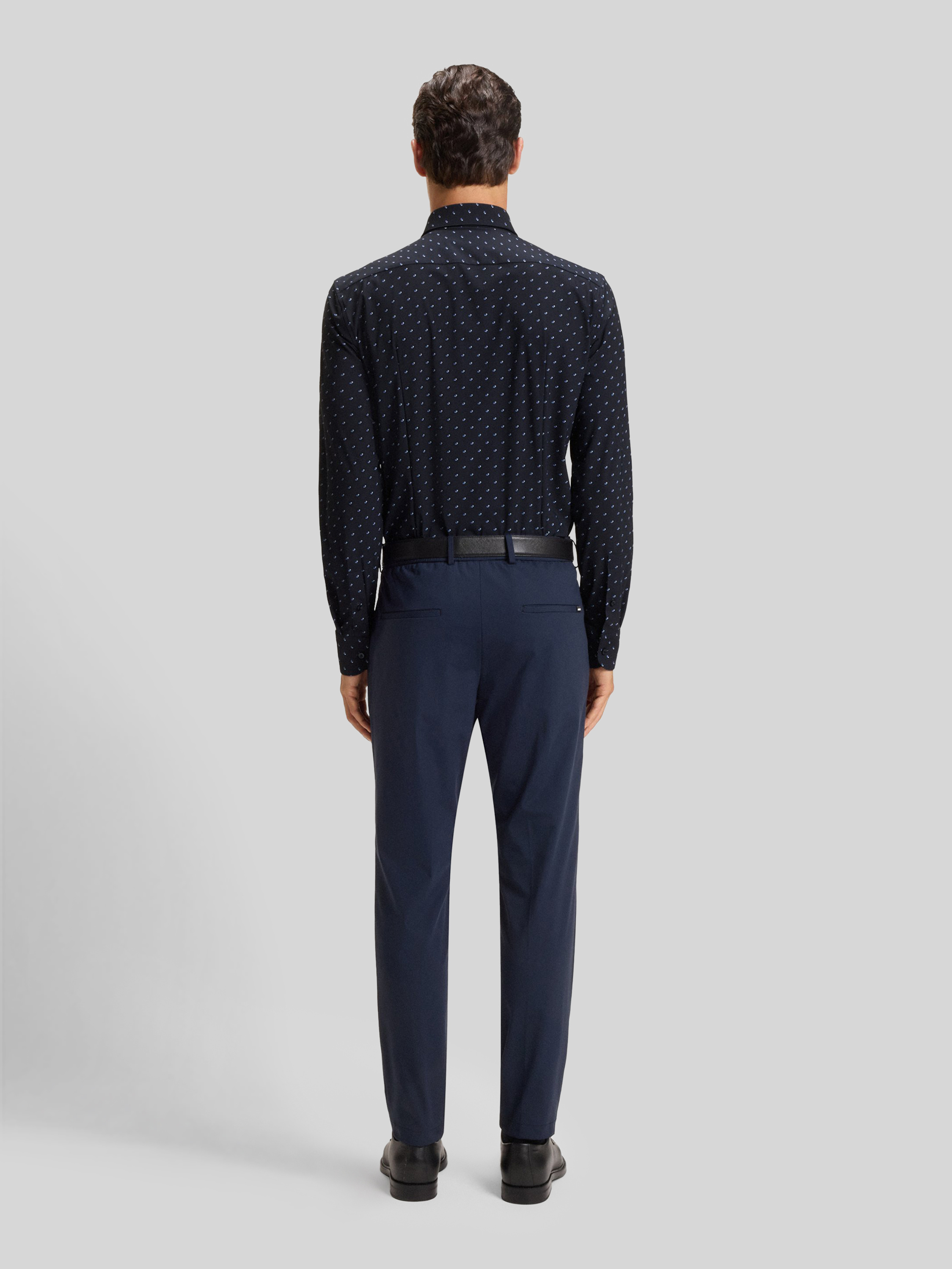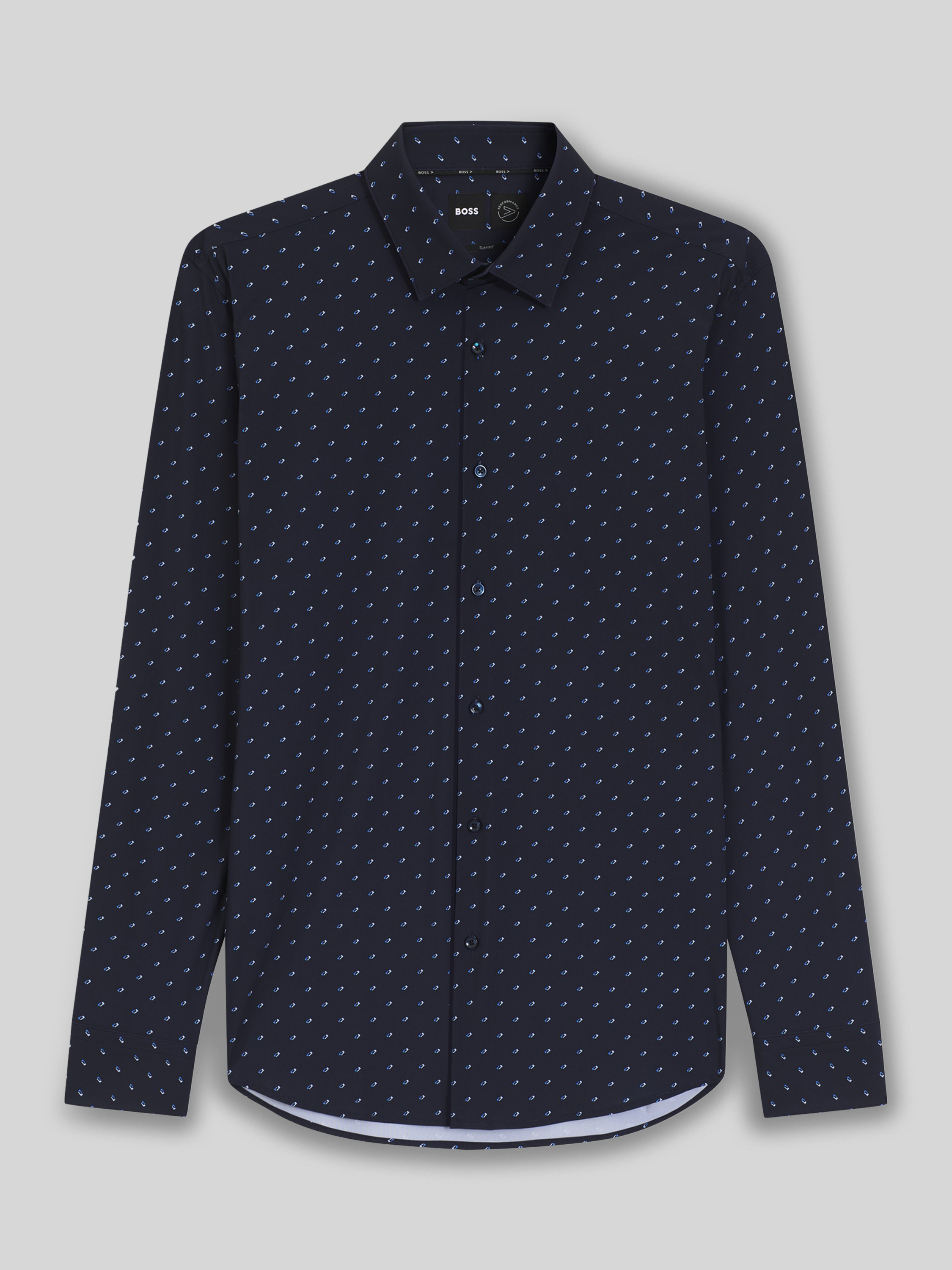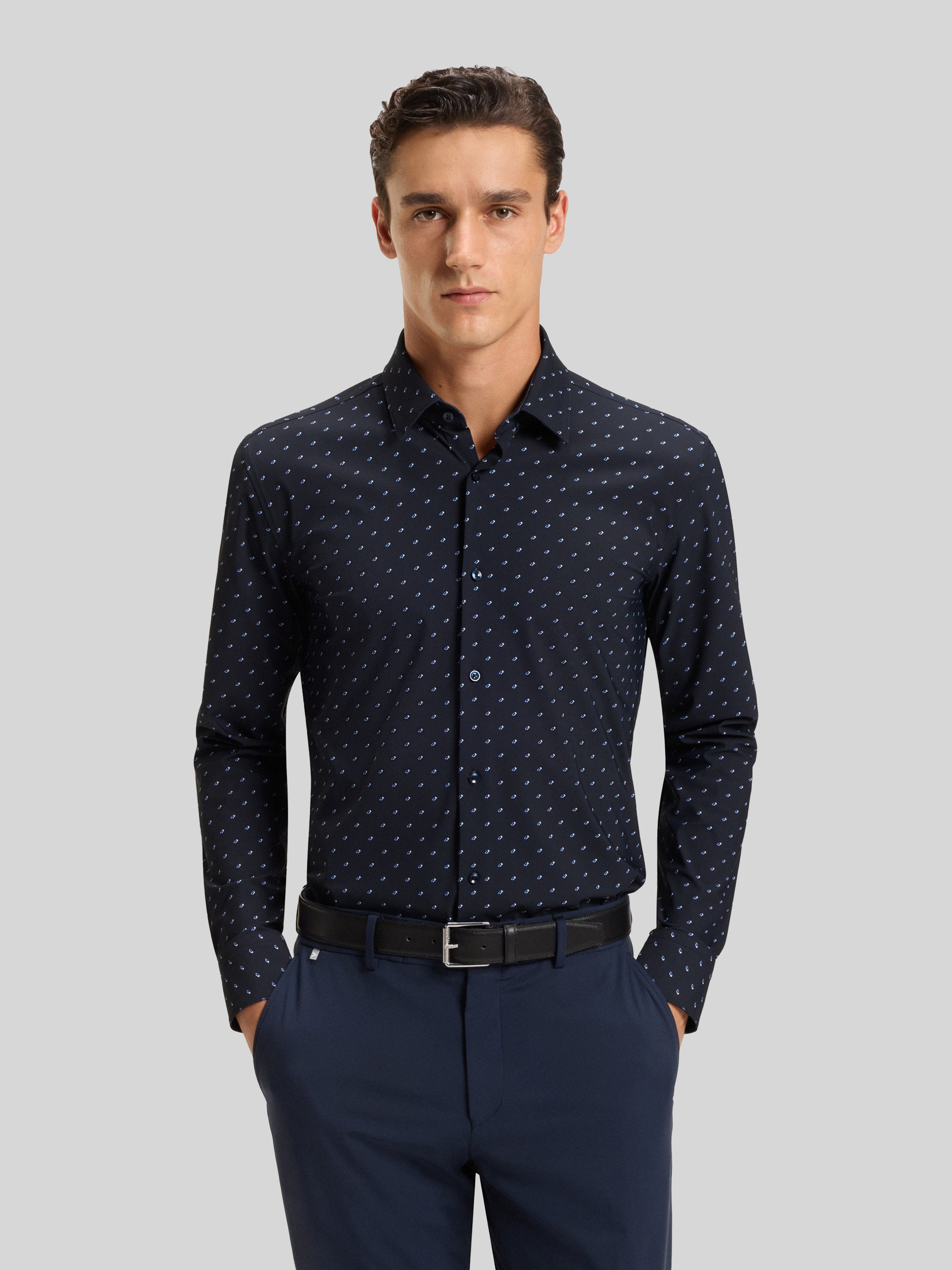Das Herrenhemd von BOSS, Modell Slim-Fit Hemd aus Stretch-Jersey, präsentiert sich mit dezentem Allover-Muster und schmaler Passform. Durch den flexiblen Jersey trägt es sich angenehm und bleibt den ganzen Tag über formbeständig. Ein Kentkragen und lange Ärmel runden den modernen Look ab.