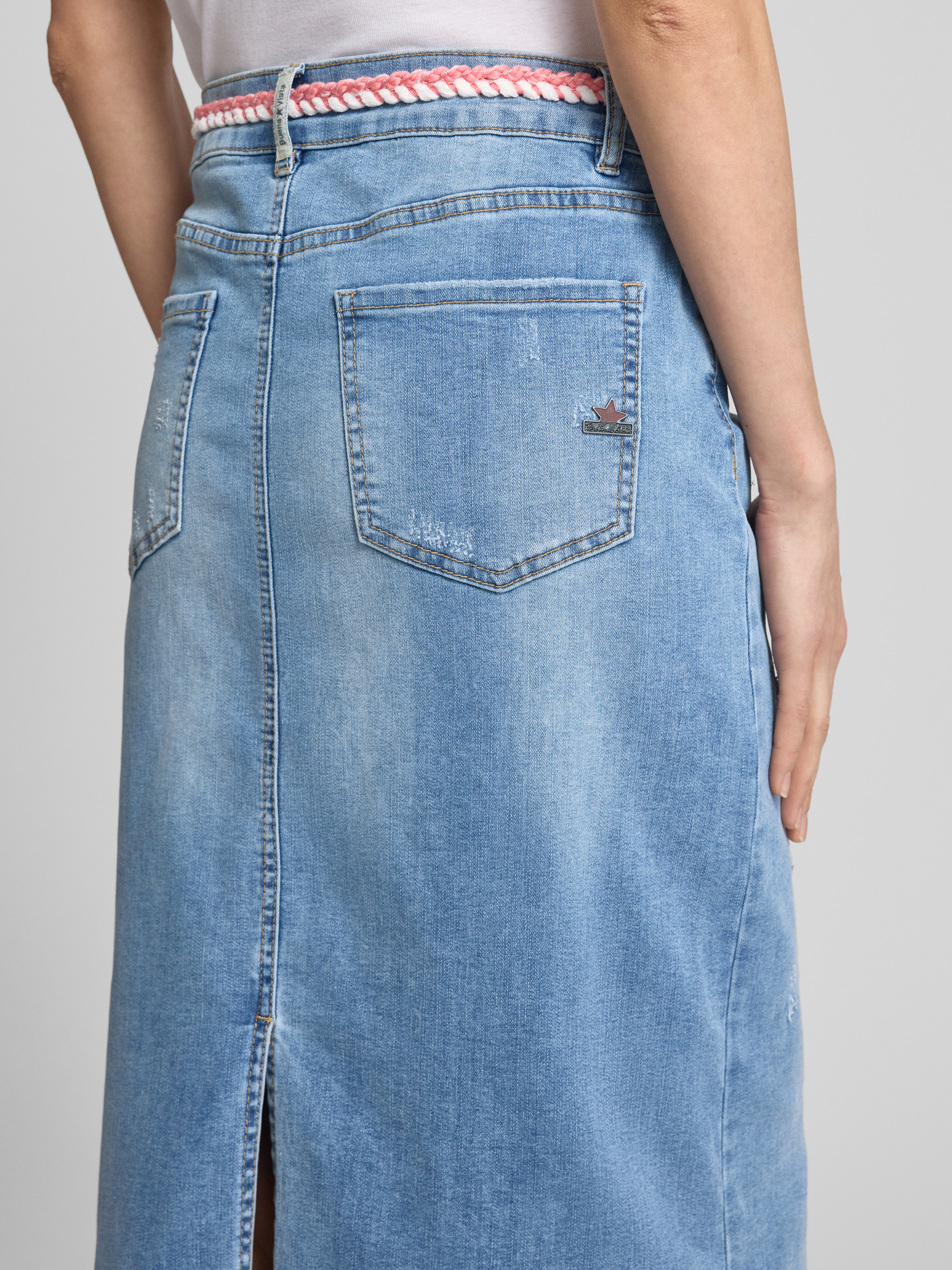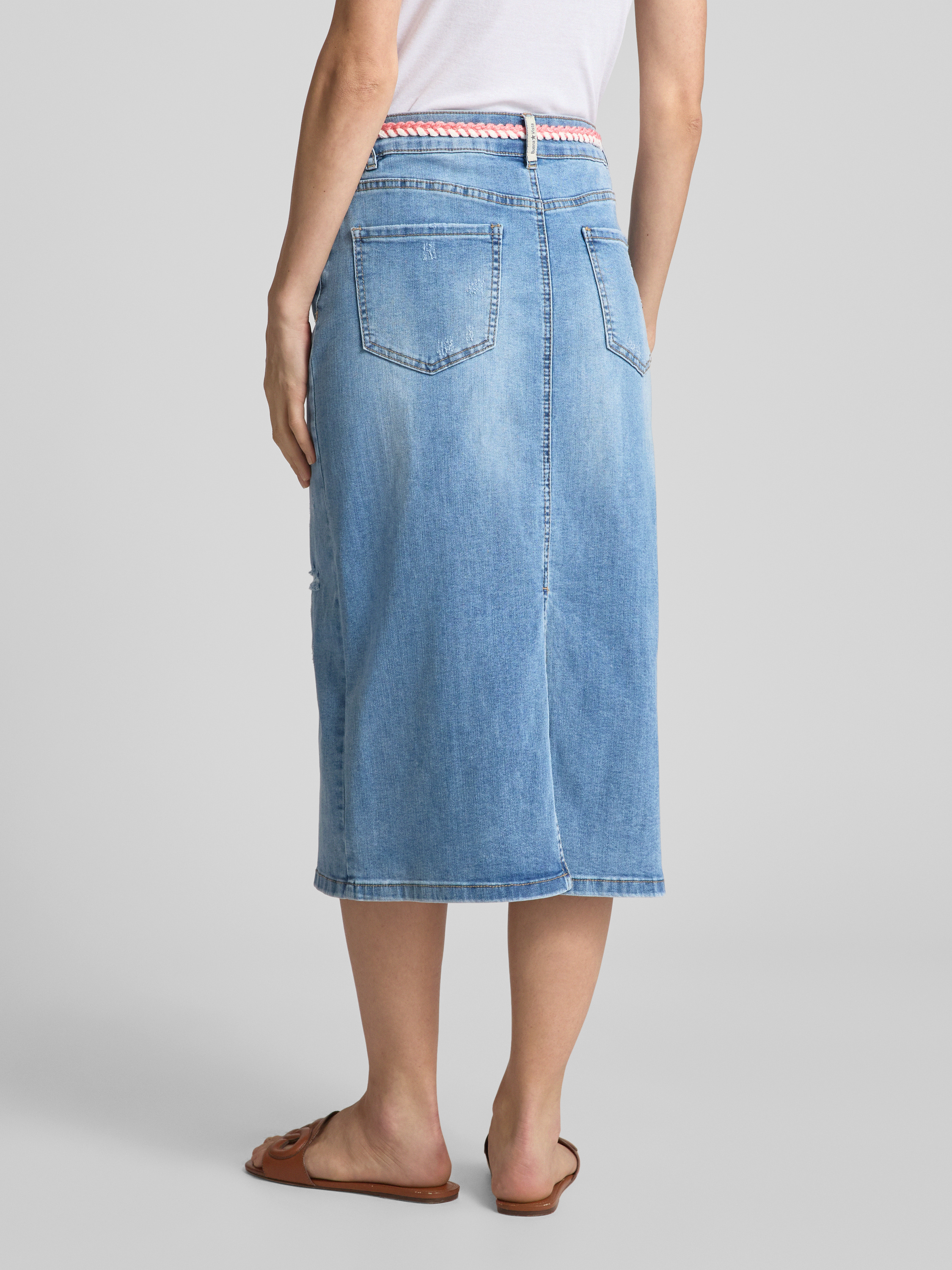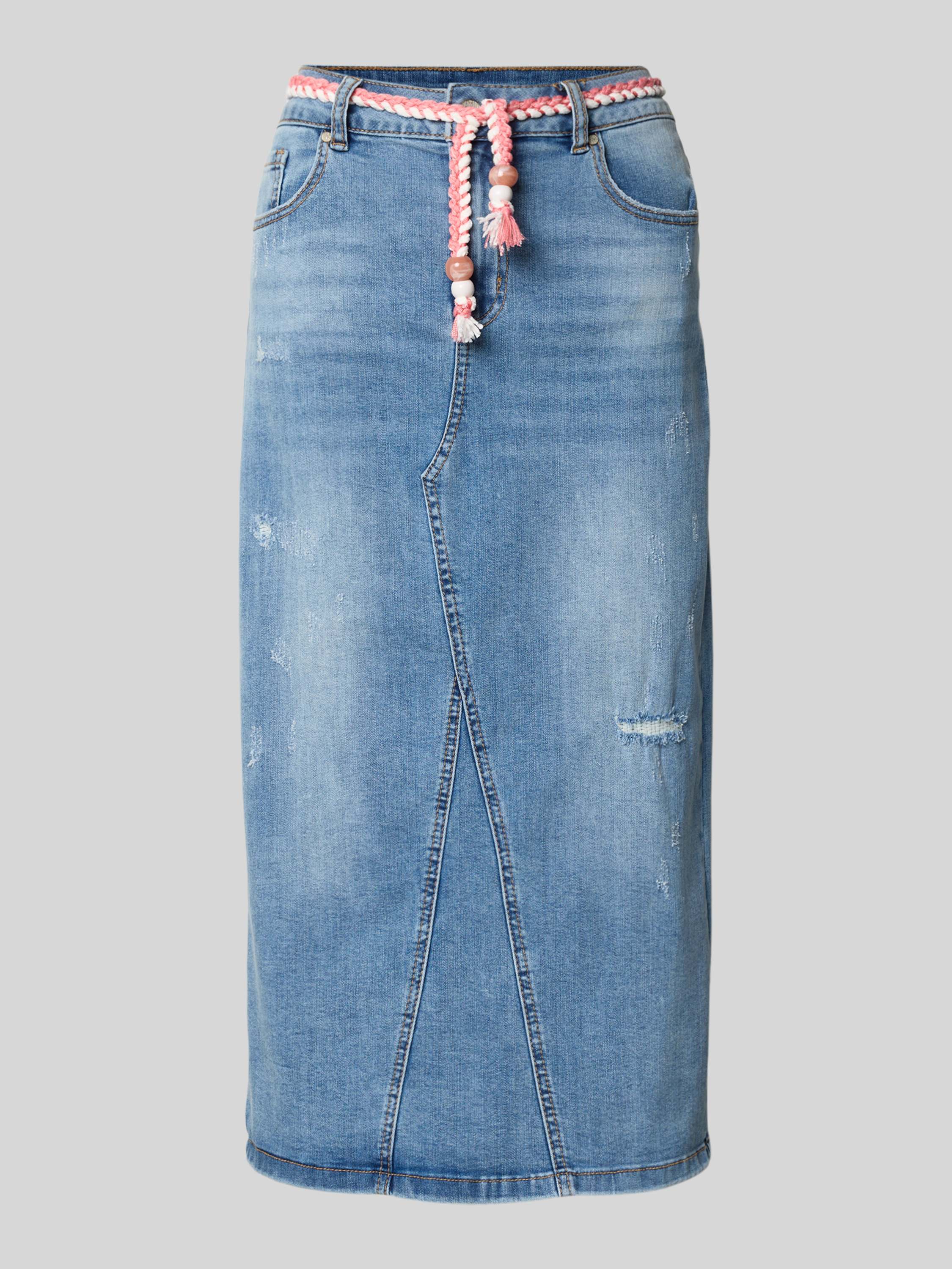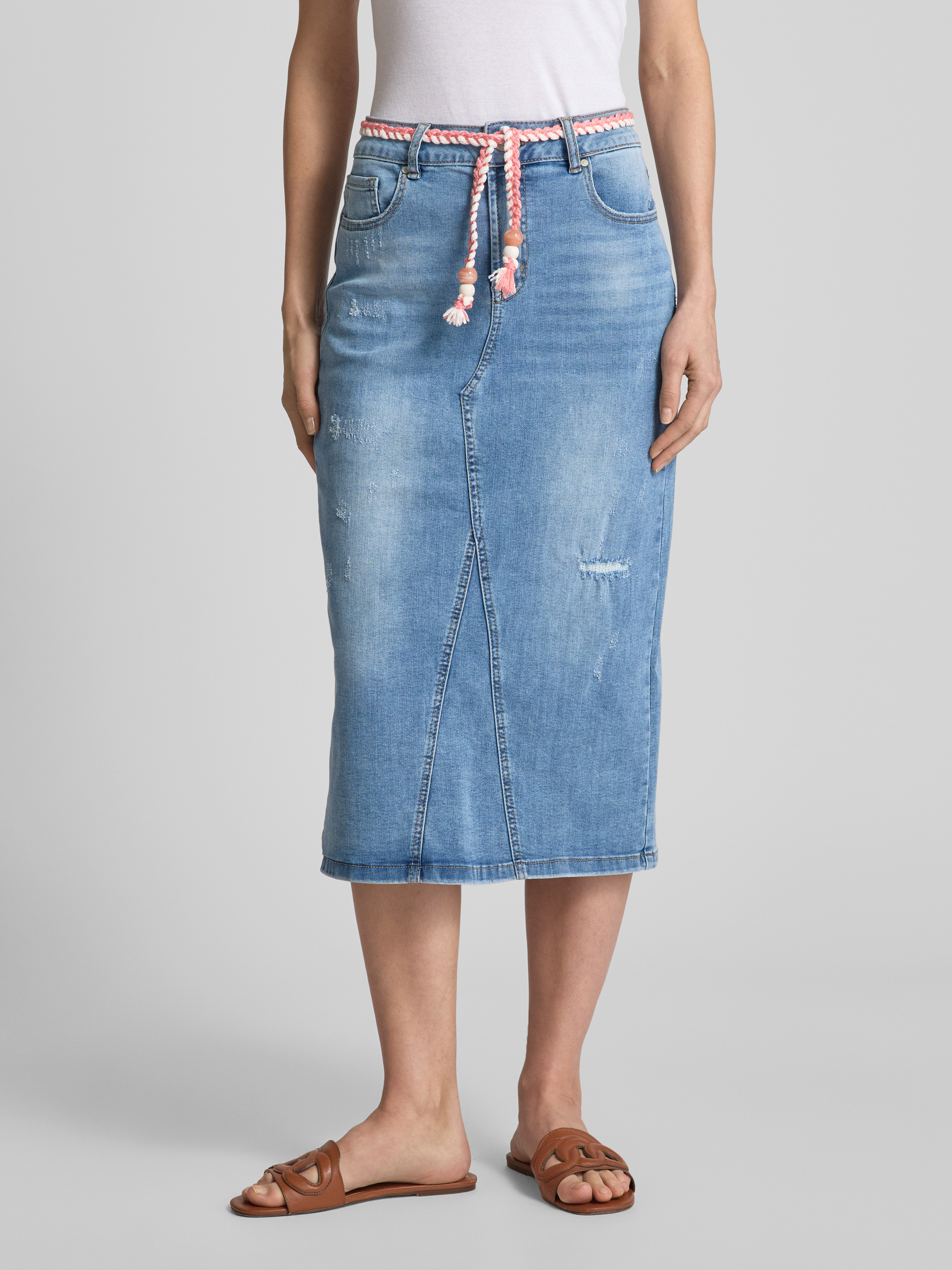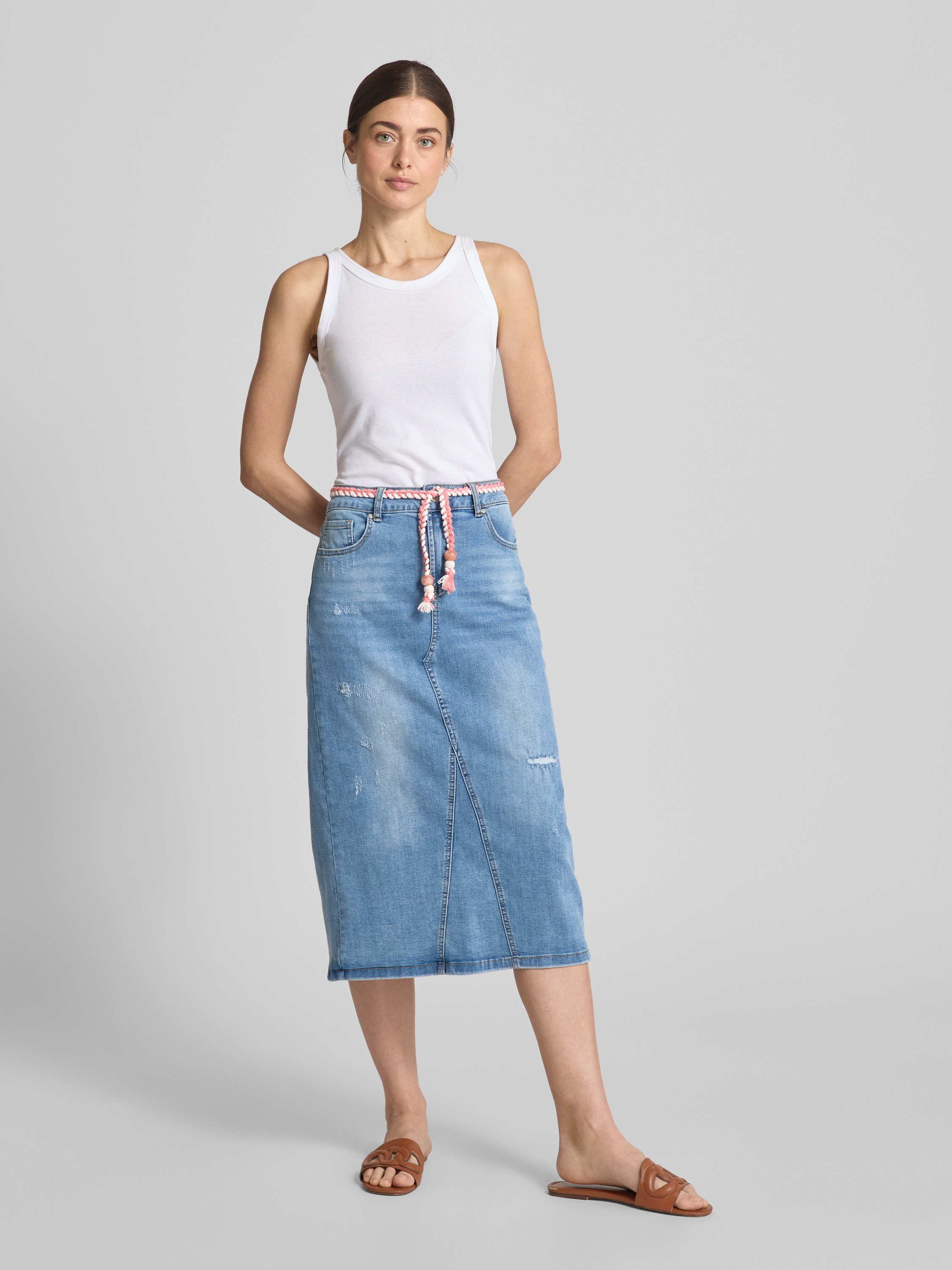 Der Jeansrock im Destroyed-Look von Buena Vista kombiniert einen elastischen Baumwoll-Mix mit Viskose-Anteil, was für angenehmen Tragekomfort sorgt. Dank des geraden Schnitts und des 5-Pocket-Designs eignet er sich hervorragend für vielseitige Outfits. Der Bindegürtel verleiht dem Midirock eine individuelle Note.