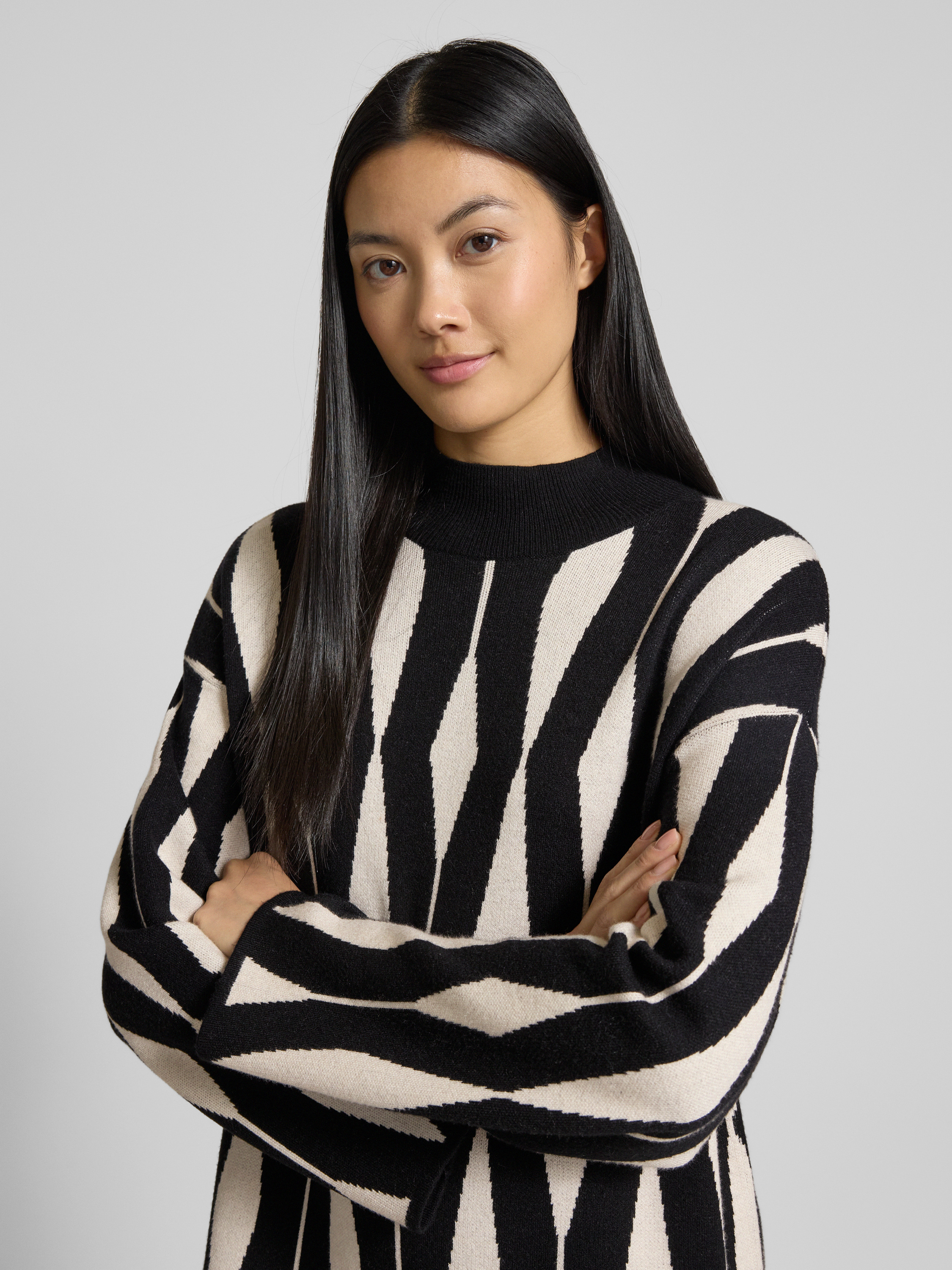 Das Strickkleid Otari von B.Young fällt durch den geraden Schnitt angenehm locker und erreicht eine knielange Silhouette, die vielseitig kombinierbar bleibt. Der Stehkragen sorgt an kühleren Tagen für angenehme Wärme, während der Viskose-Mix mit Stretch-Anteil Bewegungsfreiheit unterstützt. So entsteht ein unkompliziertes Kleidungsstück, das sich für viele Anlässe eignet.