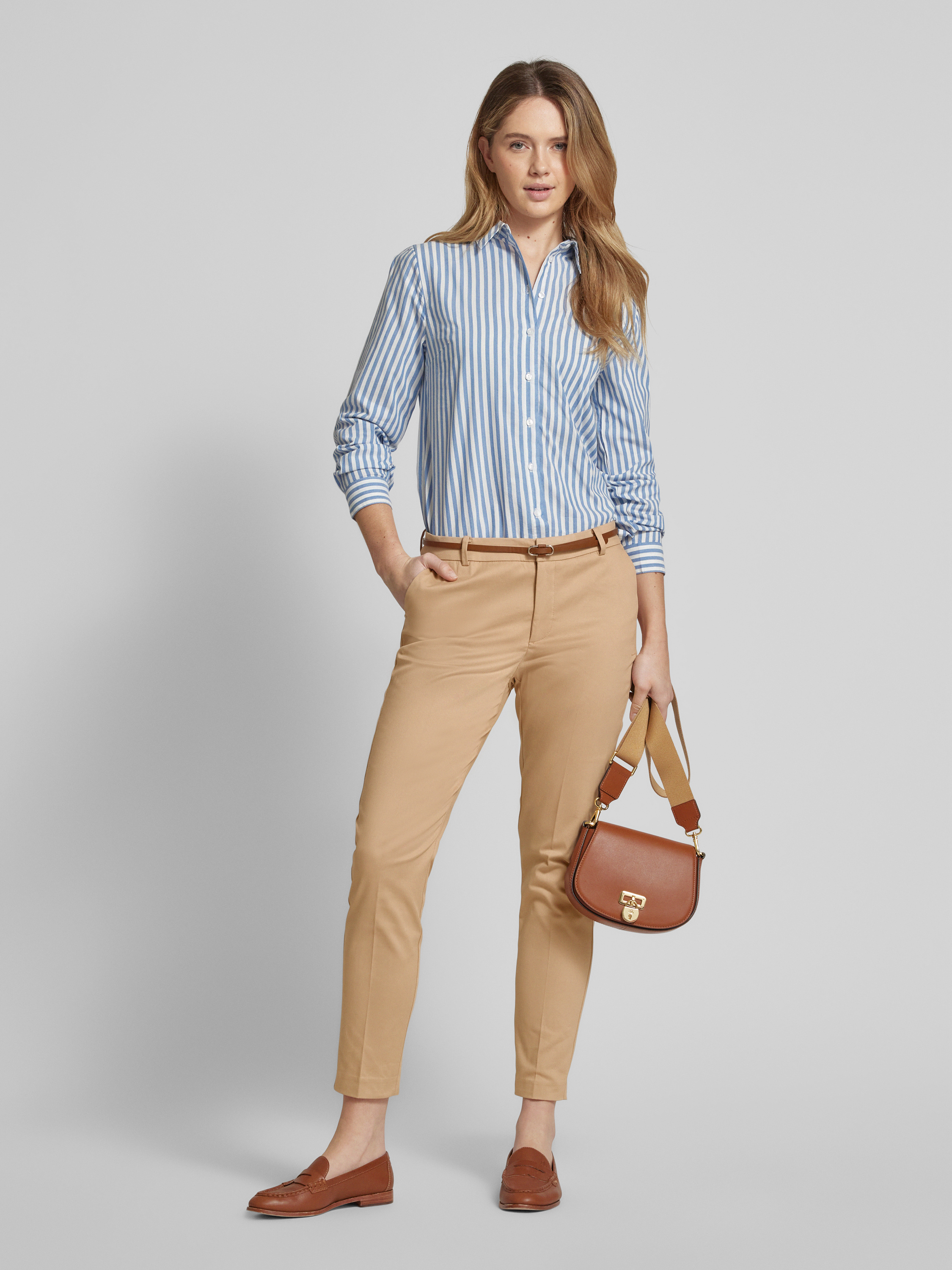 Die Tapered Fit Hose 'DAYS' von b.young präsentiert sich in einem Baumwoll-Elasthan-Mix, der für angenehmen Tragekomfort sorgt. Der verkürzte Schnitt und die Bügelfalten verleihen der Hose eine moderne Silhouette. Ein passender Gürtel ergänzt das Design funktional und stilvoll.