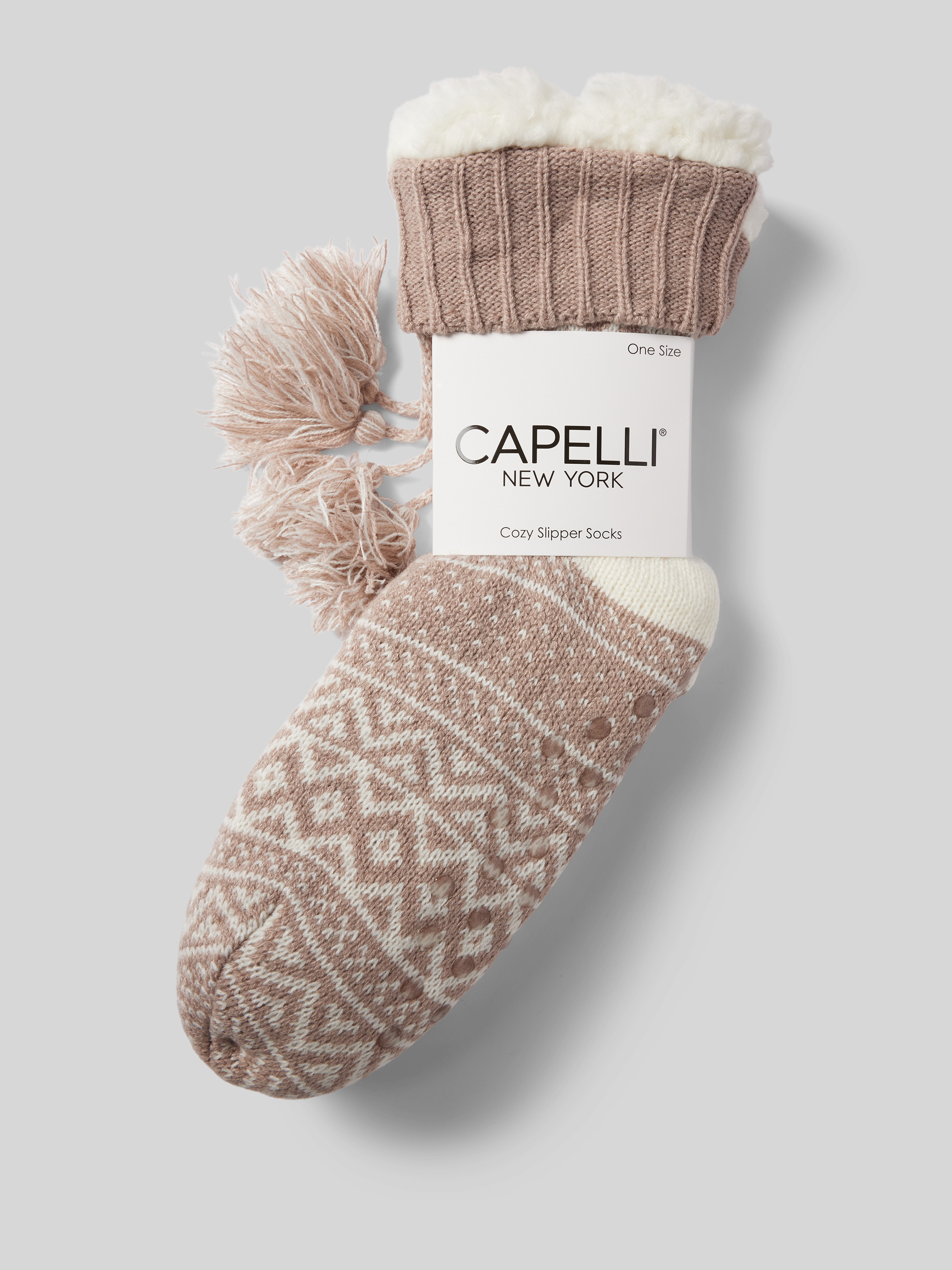 Die Damen Socken von Capelli New York, Modell 'Home', vereinen Komfort und Stil auf harmonische Weise. Mit weichem Teddyfellbesatz und verspielten Bommeln halten sie die Füße warm und verleihen dem Loungewear-Look eine charmante Note. Elastische Bündchen sorgen für angenehmen Tragekomfort.