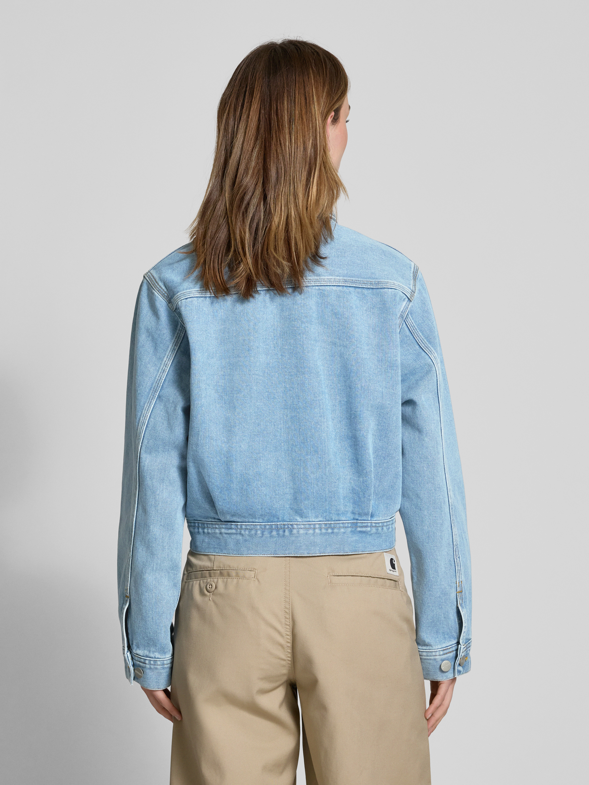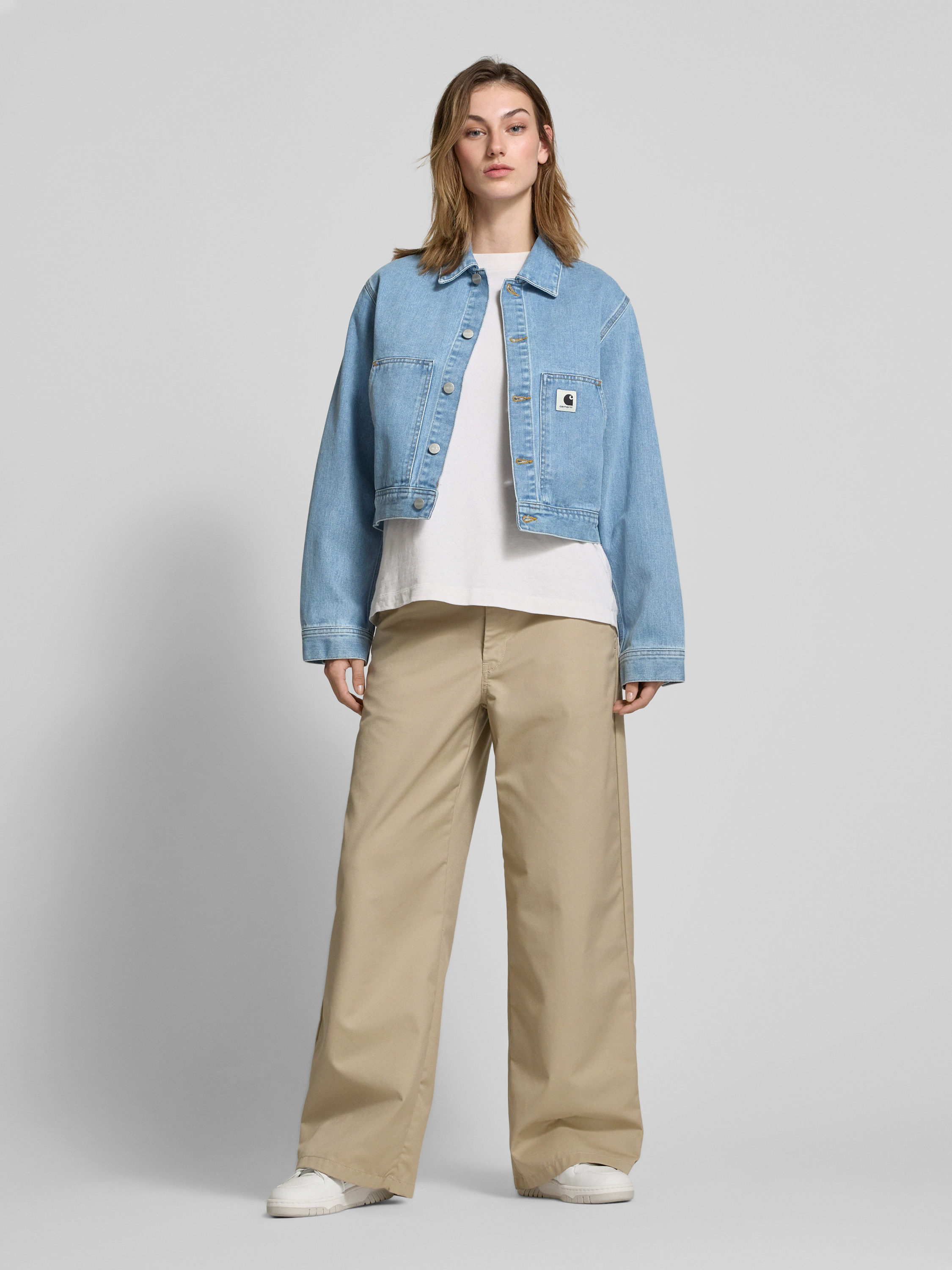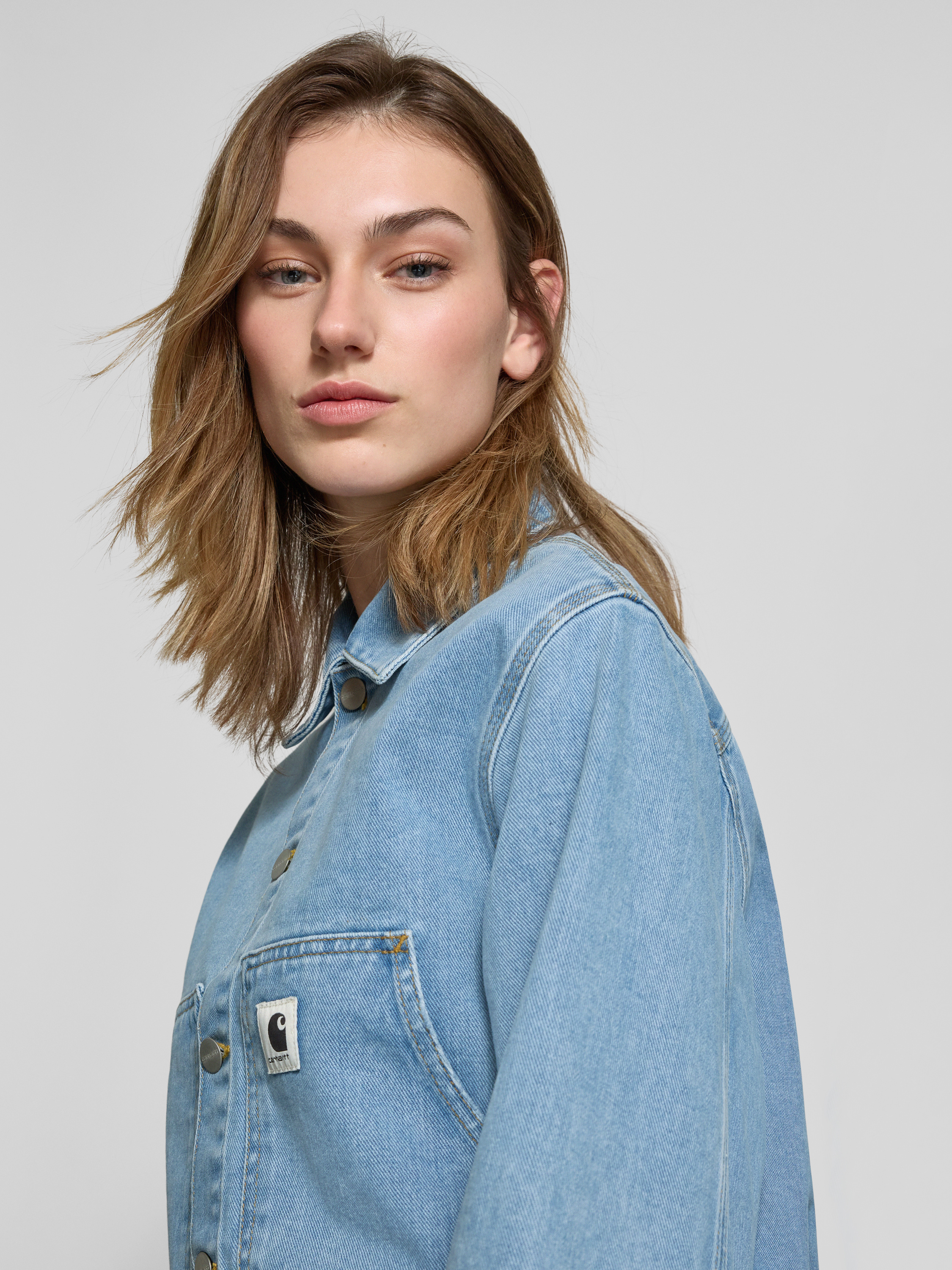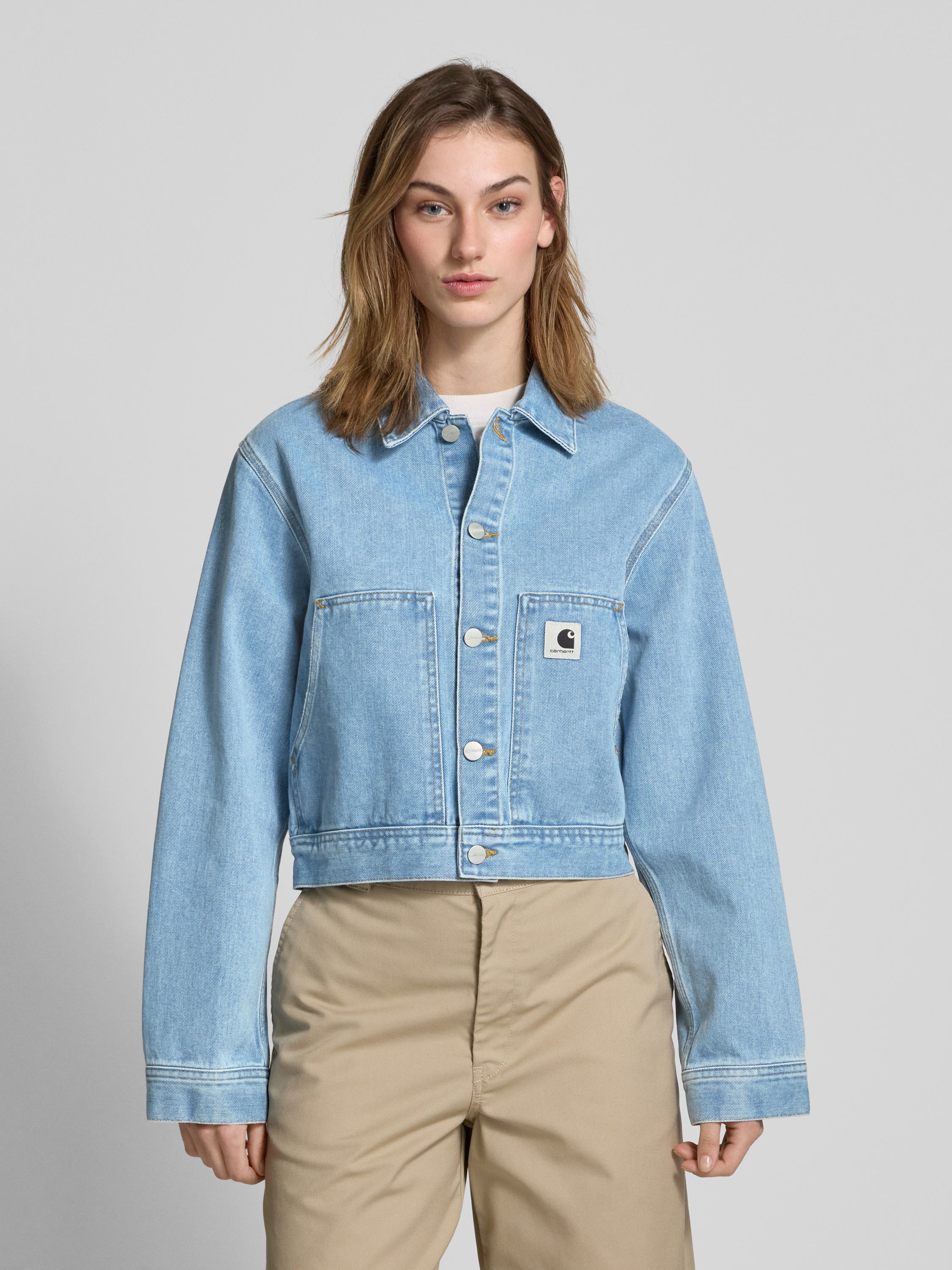 Die Damen Jeansjacke 'Arca' von Carhartt Work In Progress präsentiert sich in einem lockeren Schnitt aus reiner Bio-Baumwolle, die für angenehmen Tragekomfort sorgt. Ein klassischer Kentkragen ergänzt die Knopfleiste stilvoll, während Eingrifftaschen praktische Details hinzufügen. Das dezente Label-Detail rundet das Design ab.