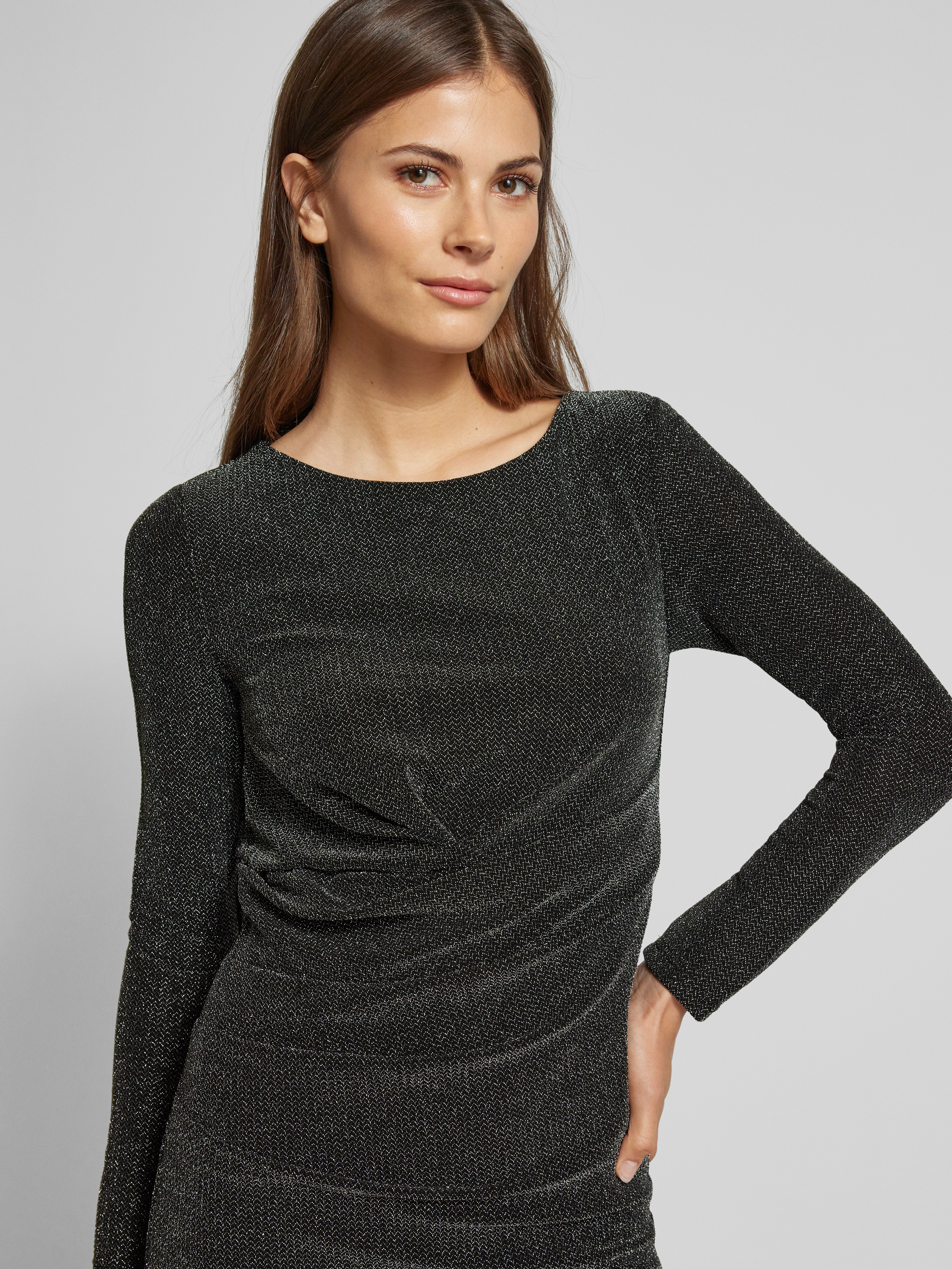 Das knielange Kleid von Christian Berg Woman Selection kombiniert einen schimmernden Glitter-Effekt mit einem raffinierten U-Boot-Ausschnitt, was dem Kleid eine elegante Note verleiht. Durch den Material-Mix mit Stretch-Anteil bietet es eine körpernahe Passform, die Bewegungsfreiheit gewährleistet. Raffungen unterstreichen geschickt die feminine Silhouette.