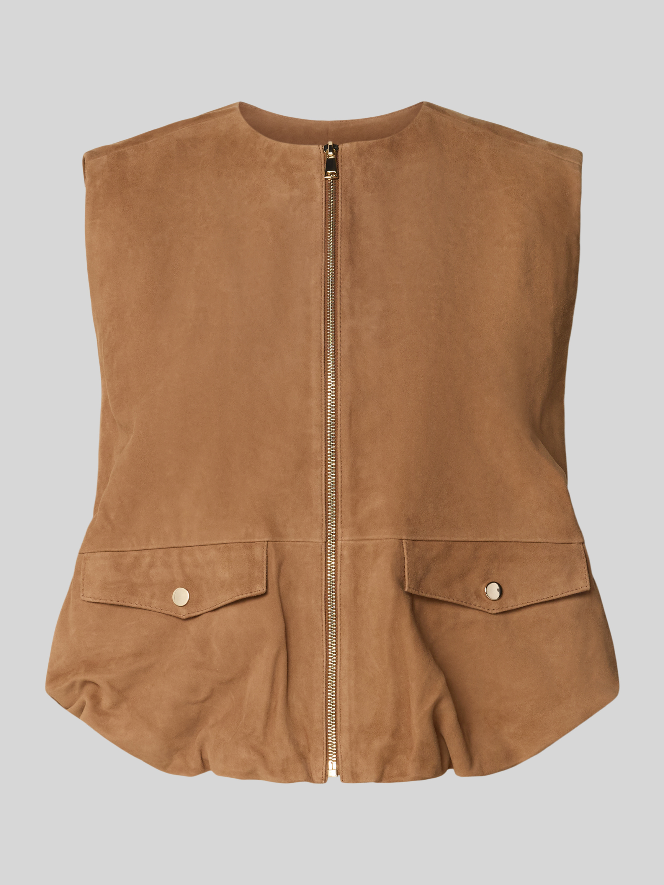 Die Weste von Christian Berg Woman Selection vereint Stil und Funktionalität mit ihrem echten Ziegenvelours und dem Regular Fit. Der Rundhalsausschnitt sorgt für eine klassische Note, während die praktischen Pattentaschen für zusätzlichen Stauraum sorgen. Ideal für vielfältige Anlässe geeignet.