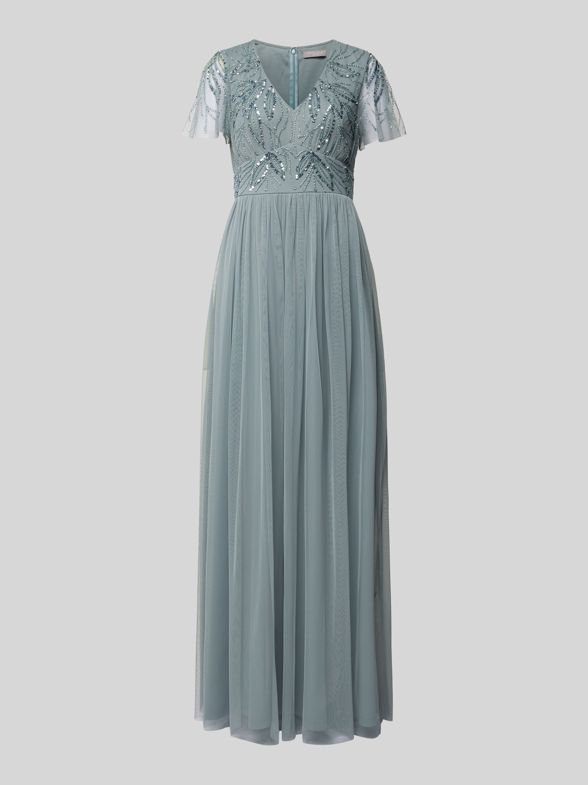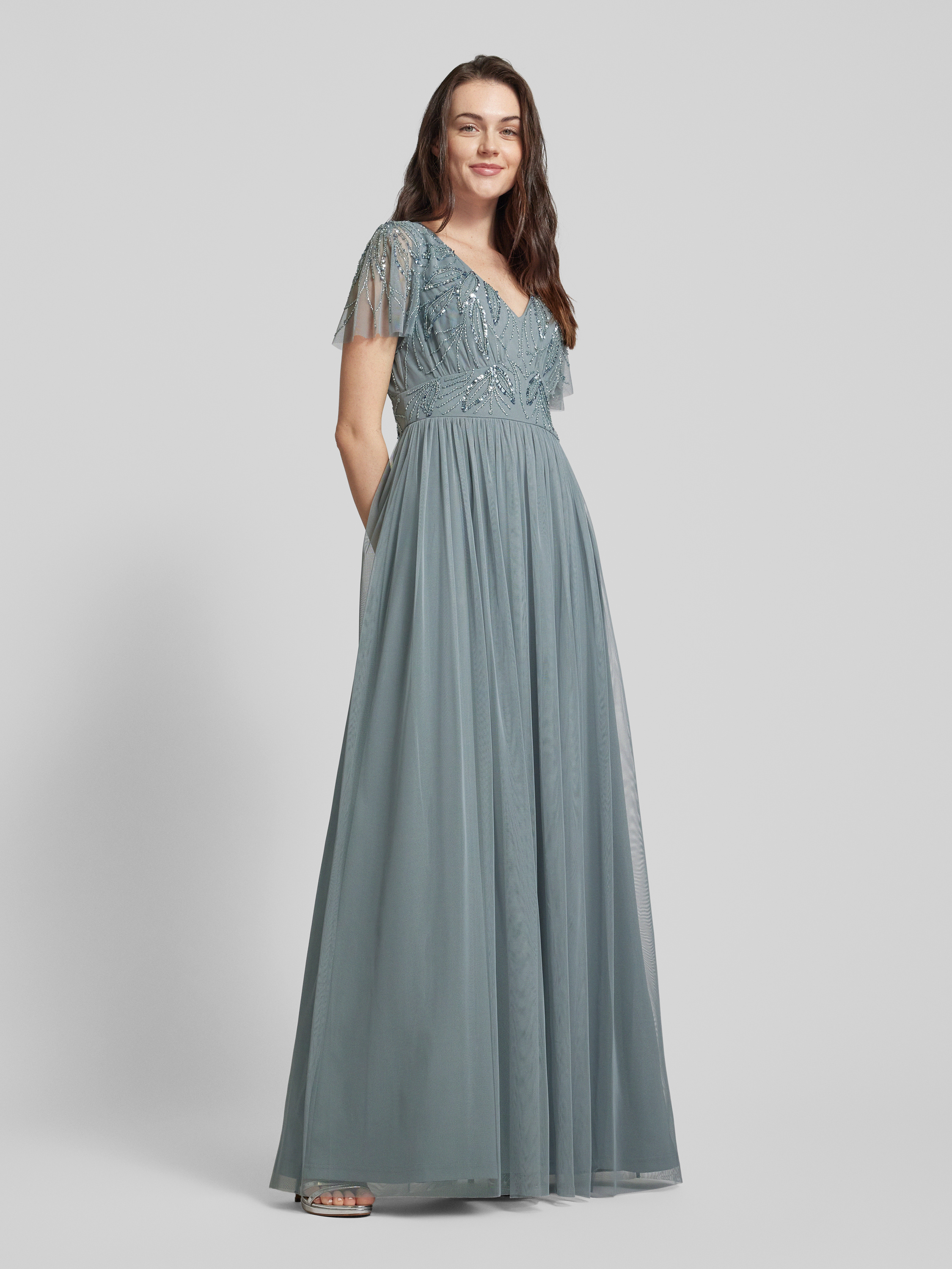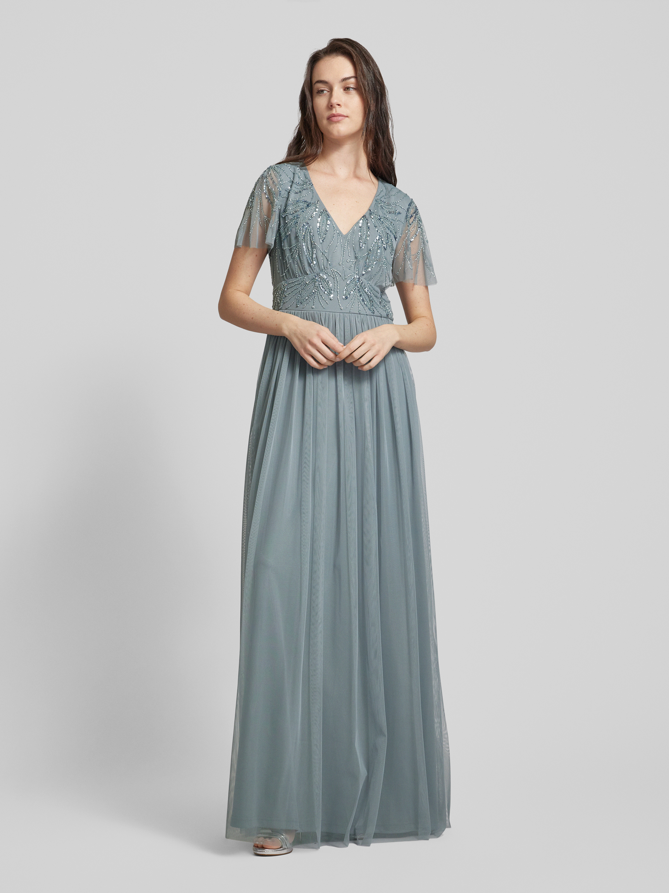 Das Damen Abendkleid von Christian Berg Cocktail setzt mit seinem taillierten Schnitt und dem langen Tüllrock auf eine elegante Silhouette. Pailletten am Oberteil verleihen dem Maxikleid eine dezente Raffinesse, während der V-Ausschnitt für einen stilvollen Akzent sorgt. So eignet sich das unifarbene Modell für festliche Anlässe.