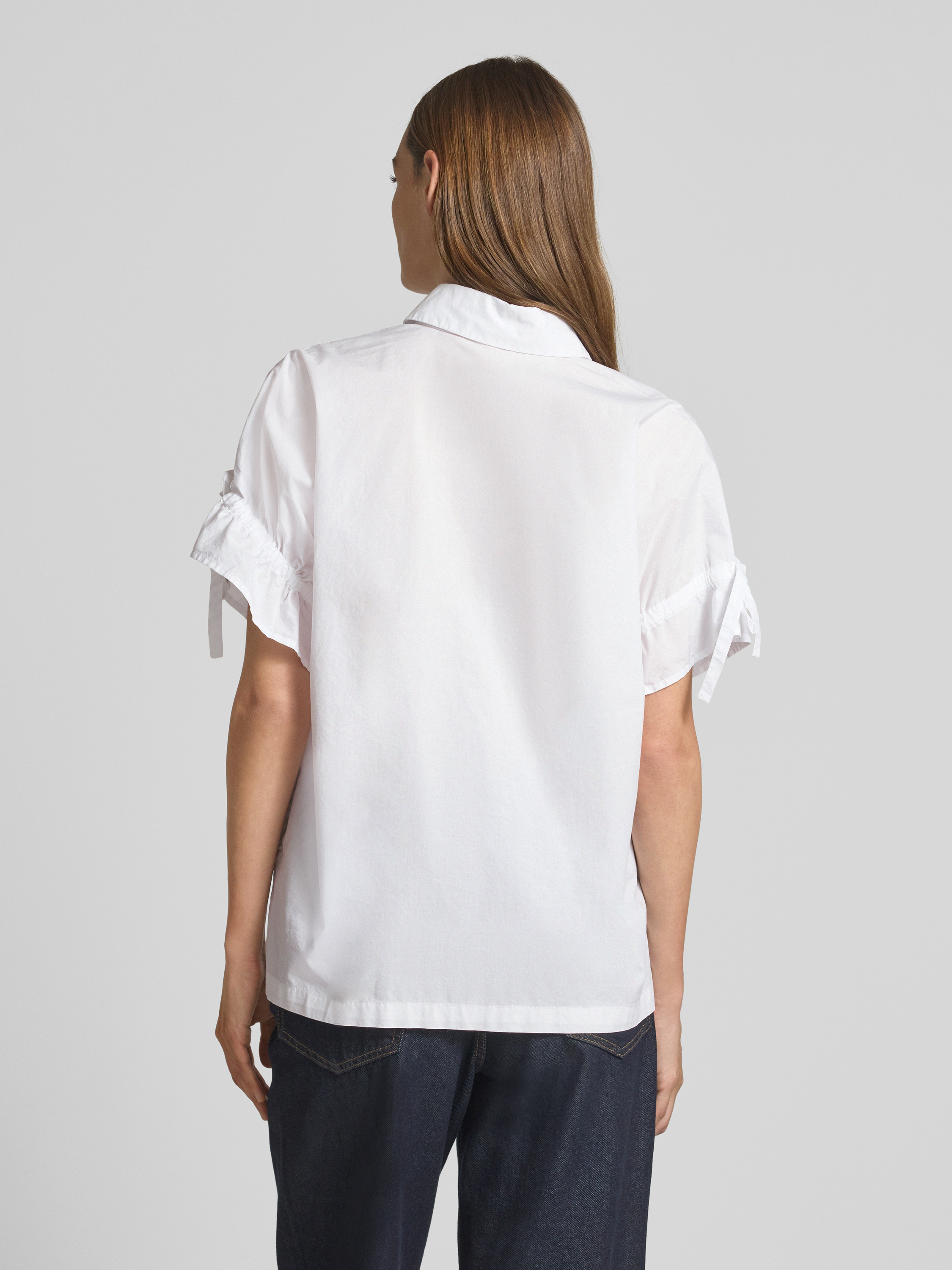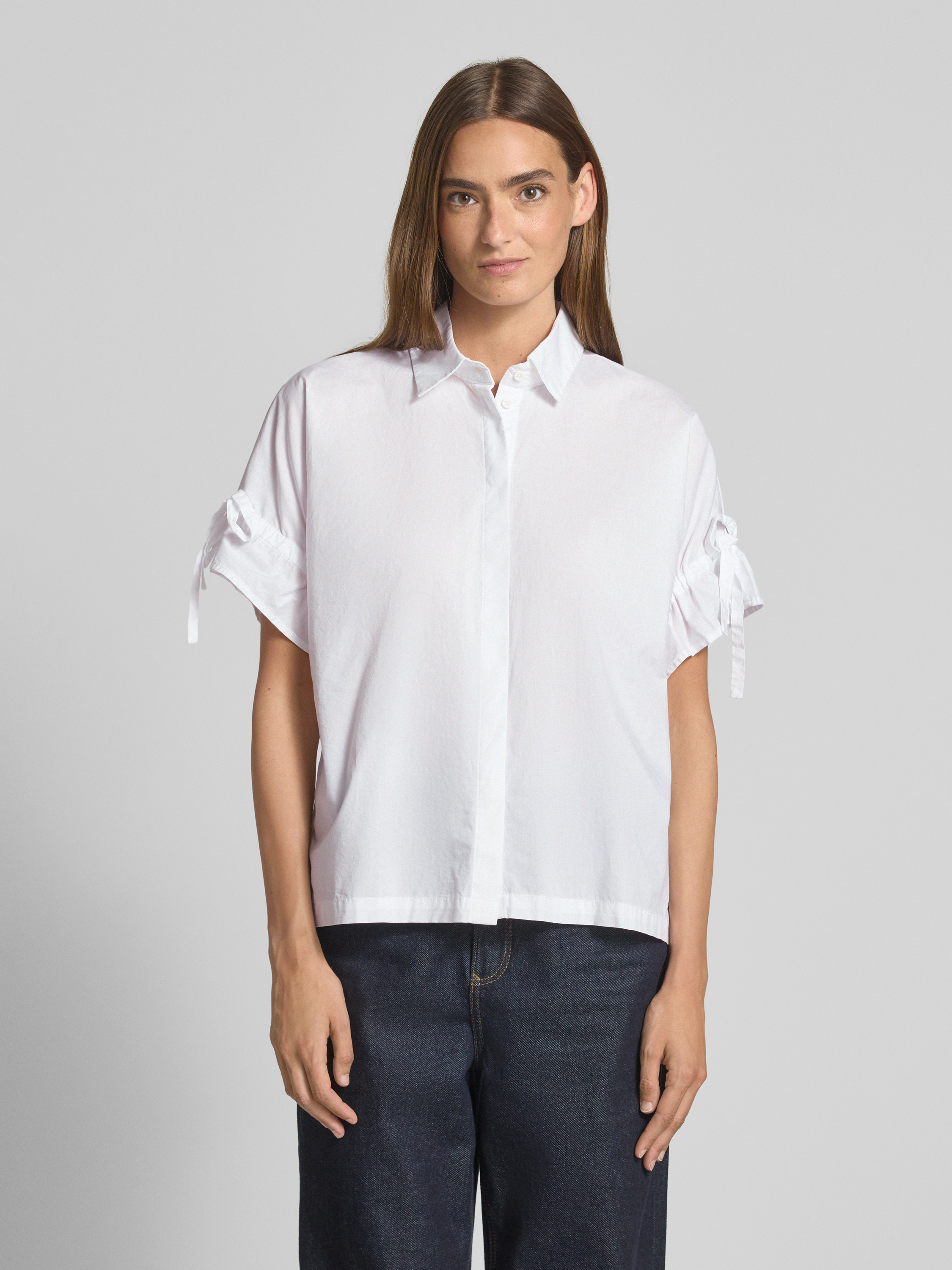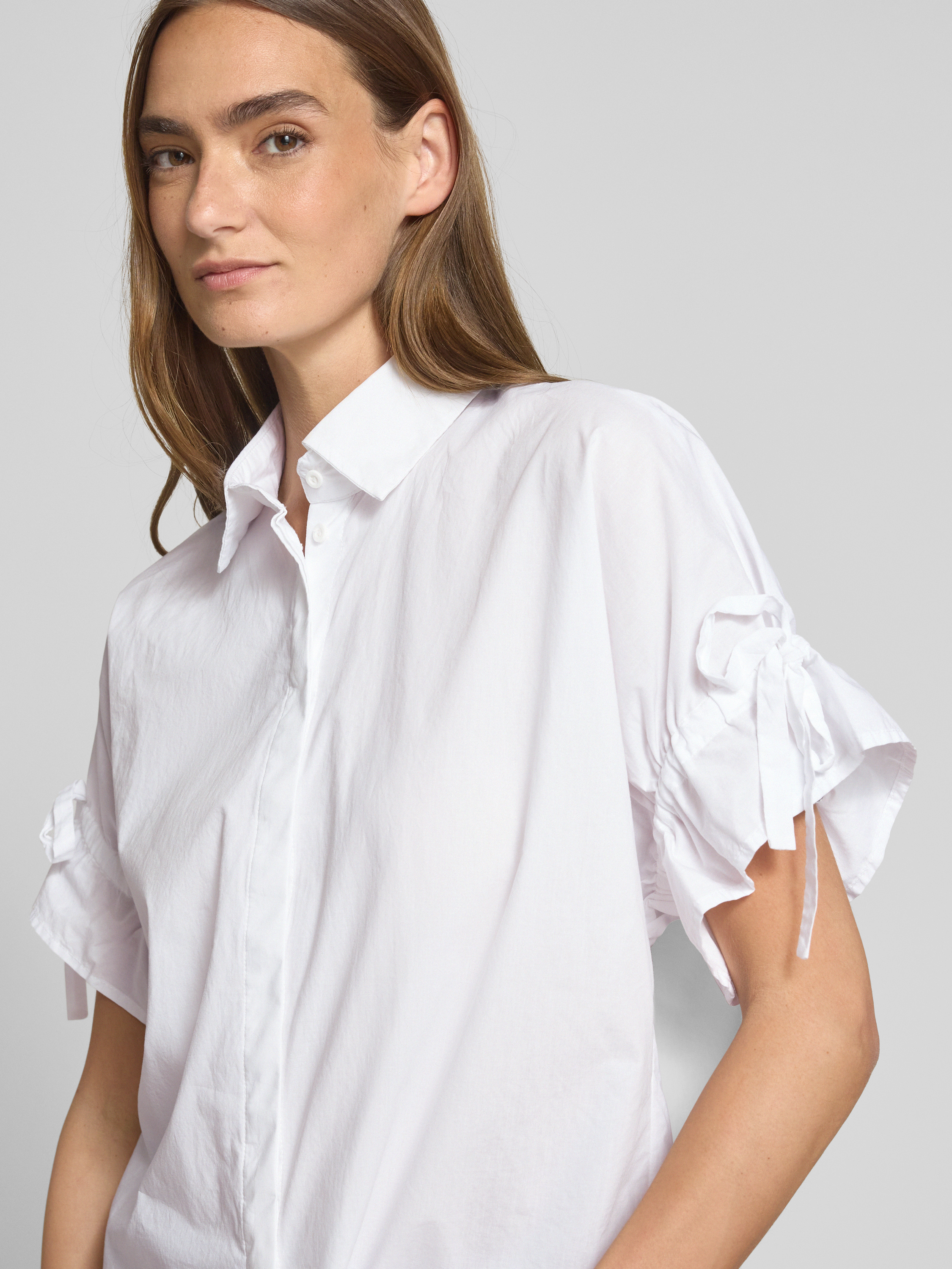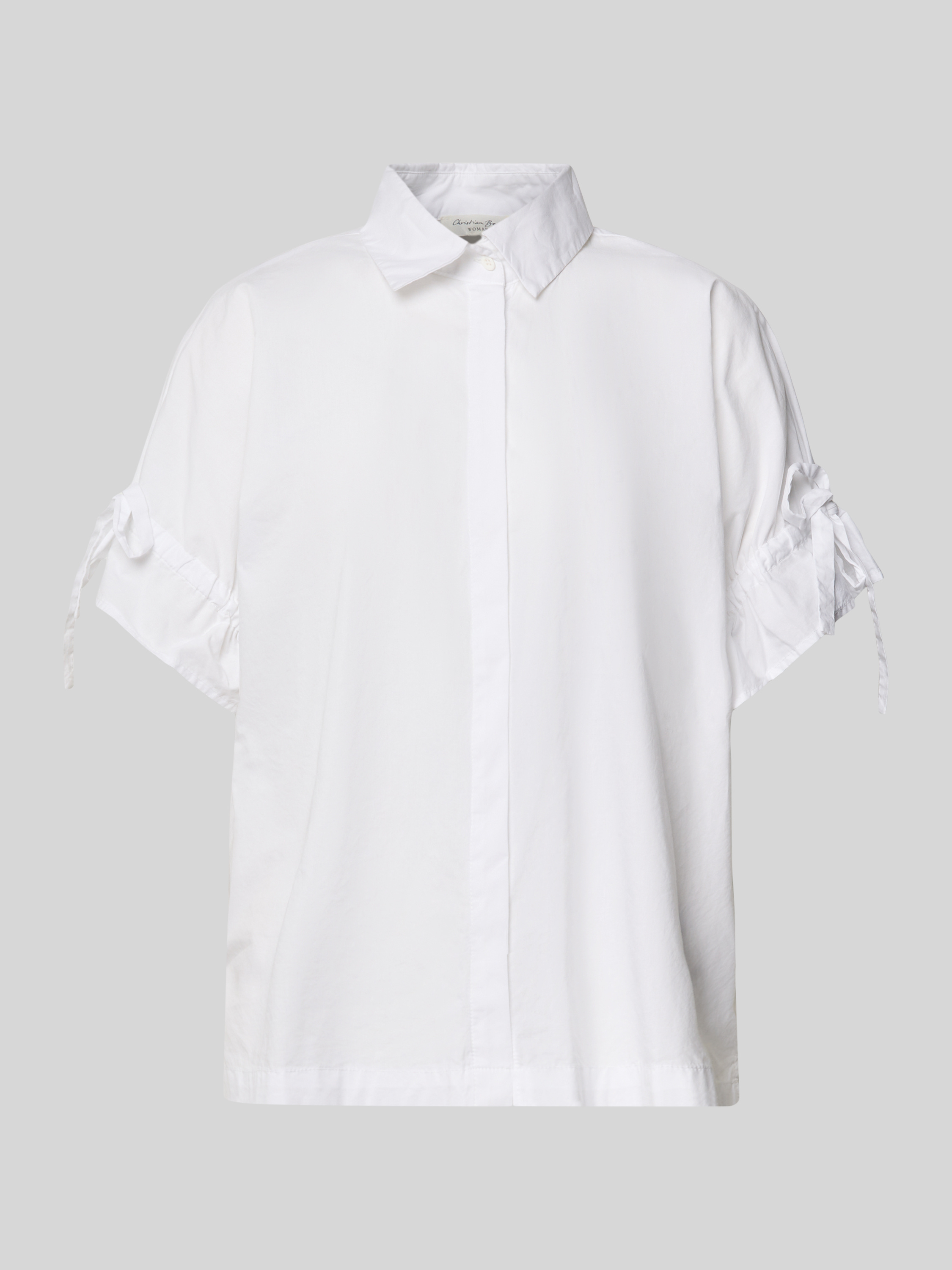 Die Christian Berg Woman Hemdbluse aus reiner Baumwolle kombiniert einen lockeren Schnitt mit einem klassischen Hemdblusenkragen. Das kurzärmelige Design mit Schleifen-Details sorgt für eine entspannte Eleganz, die sich ideal für warme Tage eignet. Eine vielseitige Wahl, die Komfort und Stil vereint.
