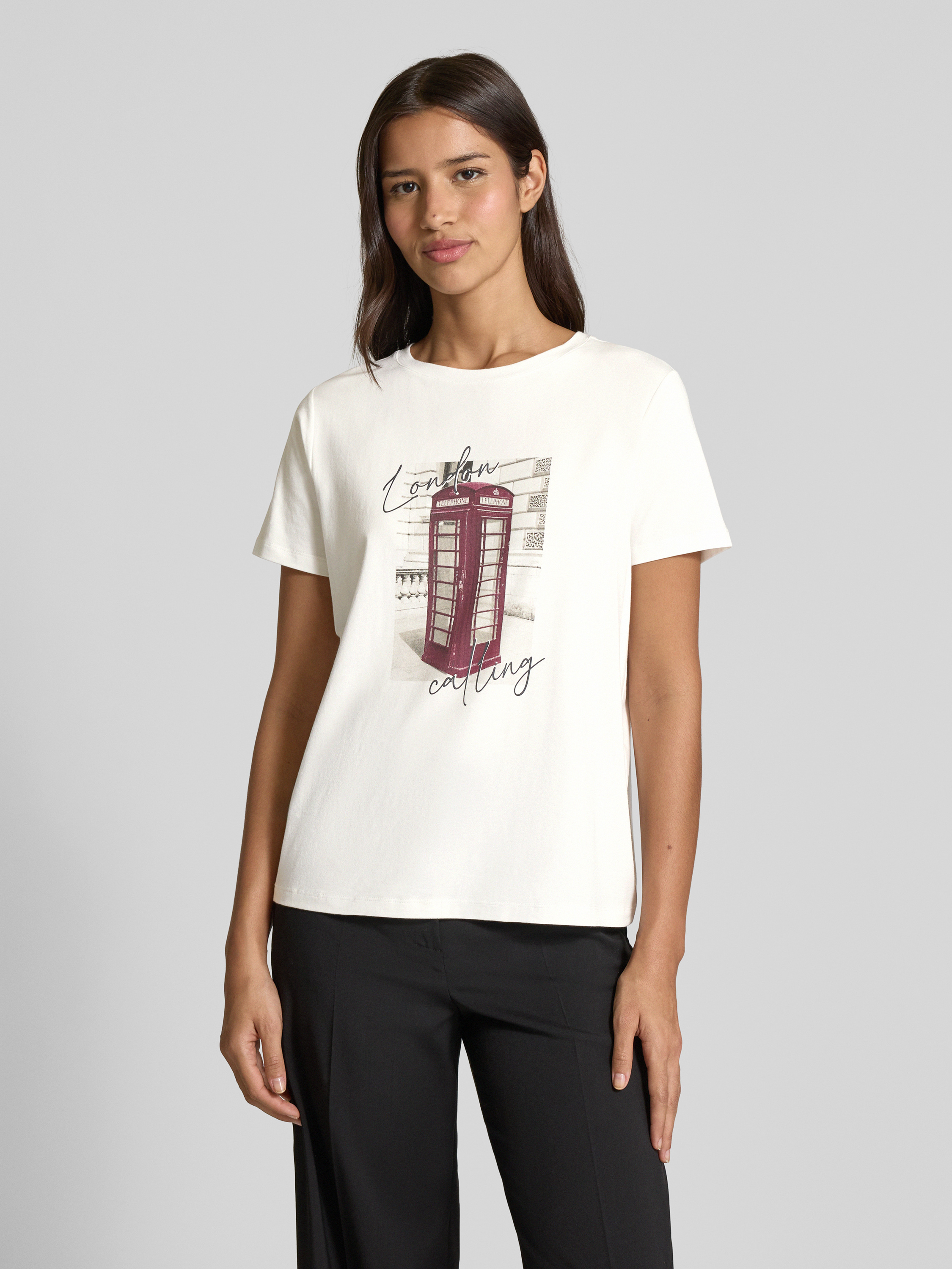 Das Damen-T-Shirt von comma kombiniert einen angenehmen Baumwoll-Modal-Mix mit einem dezenten Stretch-Anteil, wodurch es sich geschmeidig an den Körper anpasst. Der gerade Schnitt und der klassische Rundhalsausschnitt sorgen für einen entspannten Sitz. Ein lebendiger Motiv-Print lockert das Gesamtbild wirkungsvoll auf.