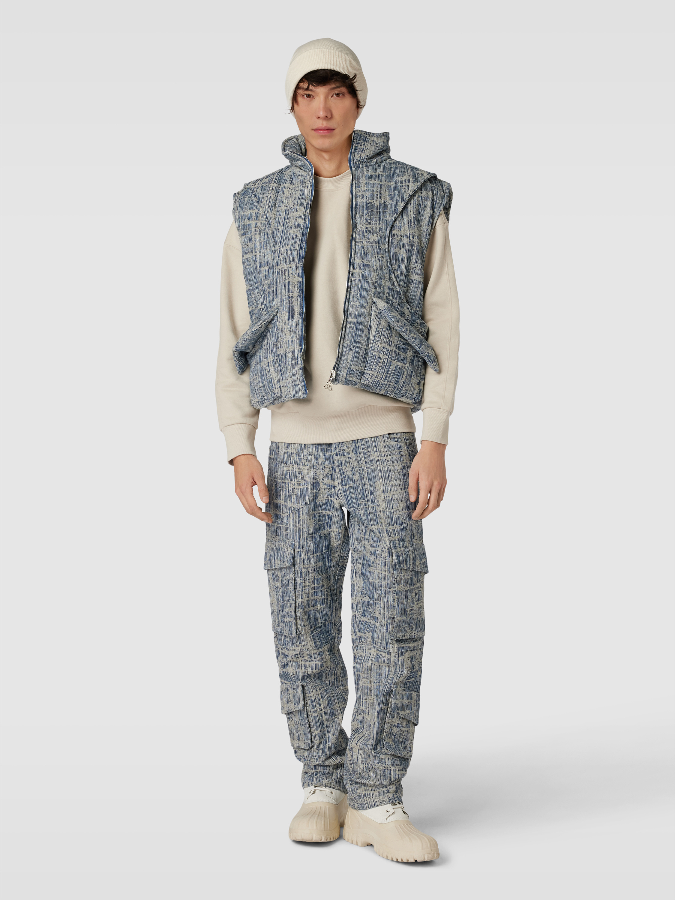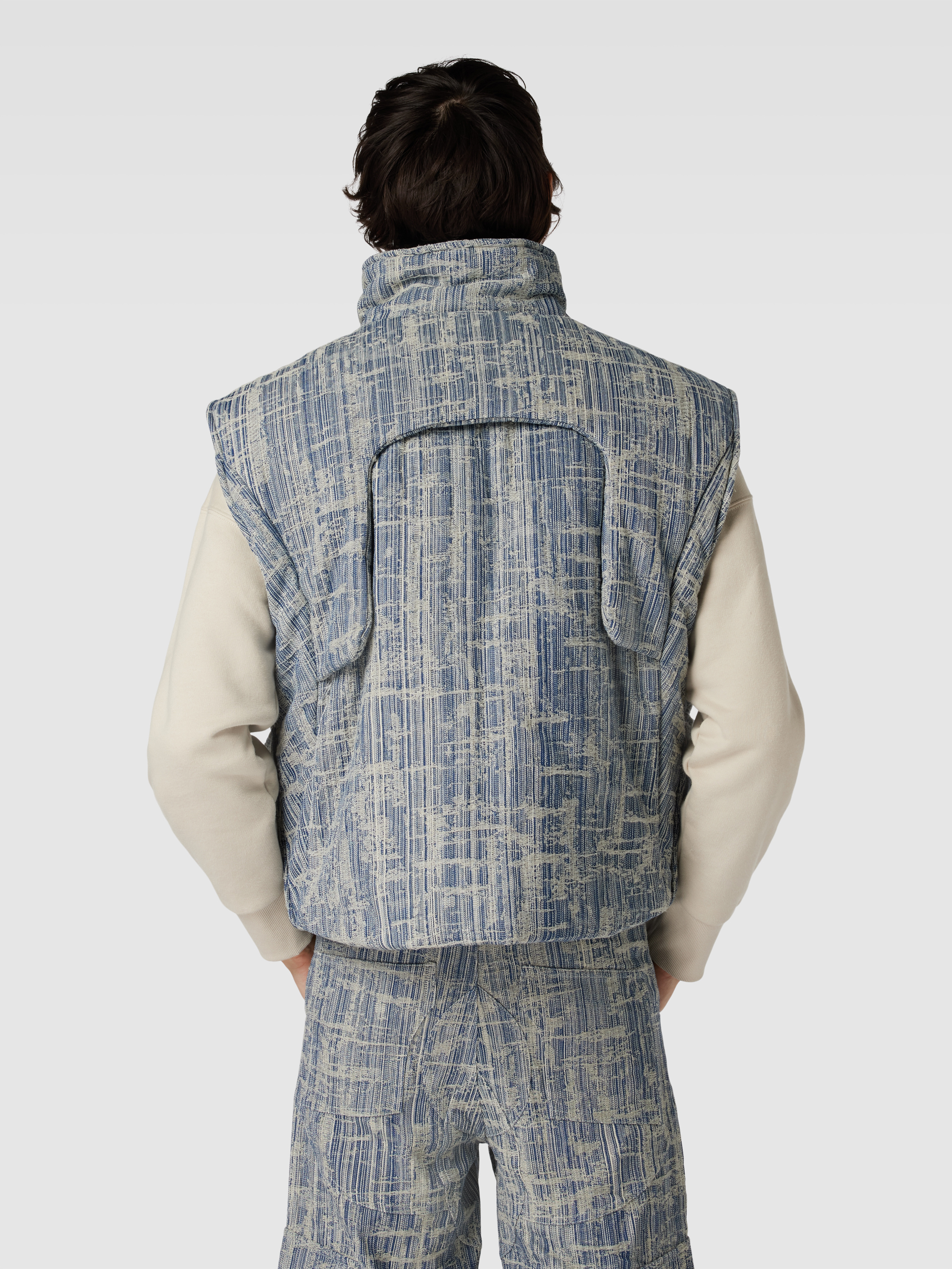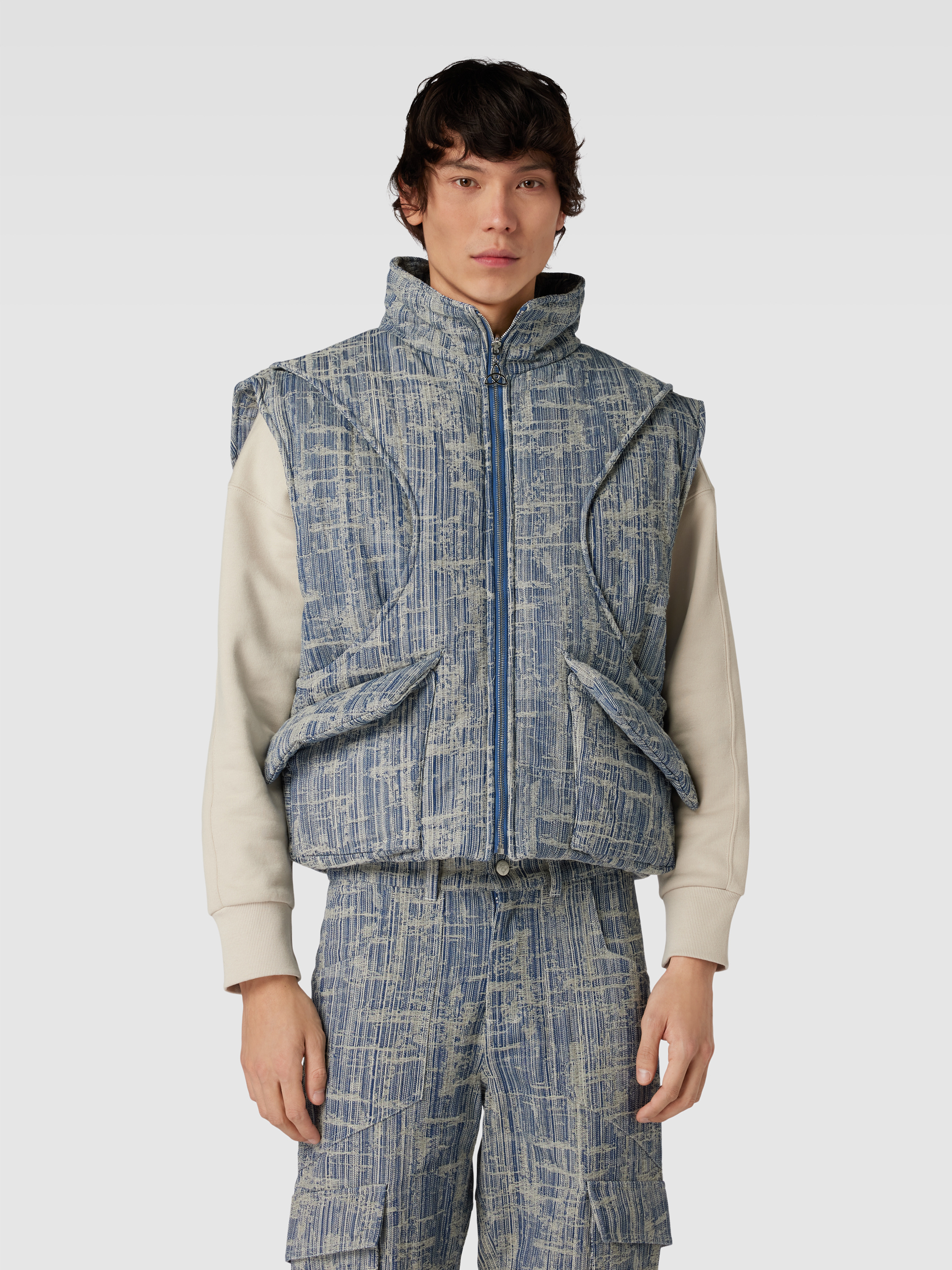 Die Herren Weste von Divention, Modell 'ENTITY', zeichnet sich durch ihren geraden Schnitt und das Allover-Muster aus, das jedem Outfit eine besondere Note verleiht. Der Baumwoll-Mix sorgt für angenehmen Tragekomfort, während die praktischen Pattentaschen zusätzlichen Stauraum bieten. Ein Stehkragen rundet das Design stilvoll ab.