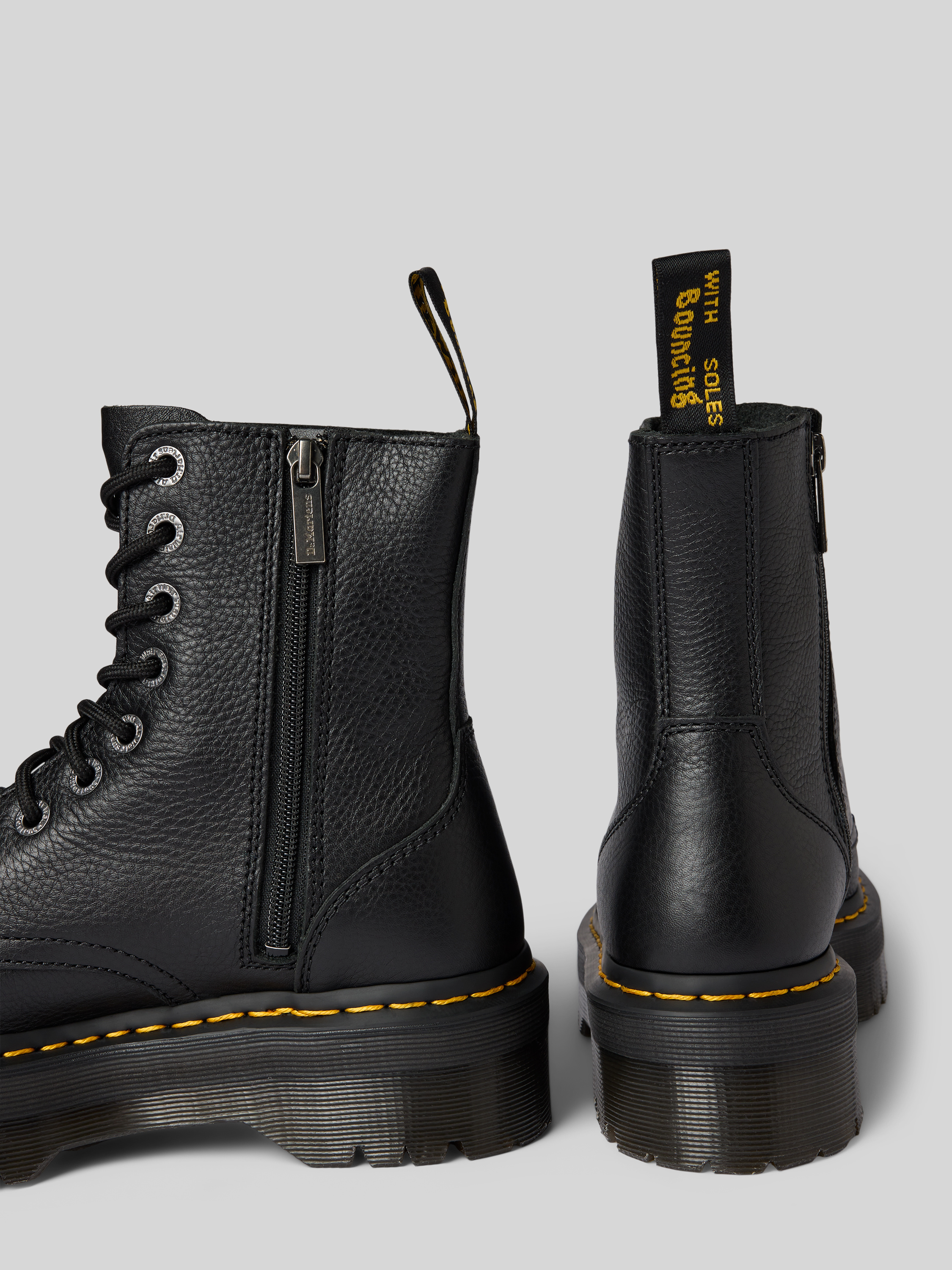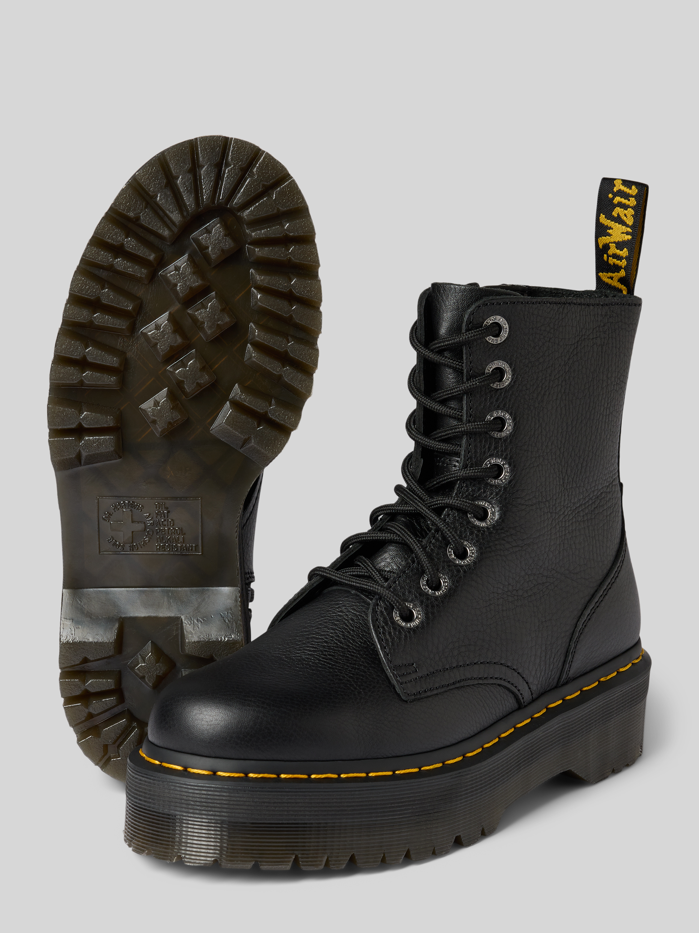 Die Damen Boots von Dr. Martens im Modell Jadon III aus echtem Leder zeigen sich mit einer abgerundeten Spitze und fallen durch ihre markante Silhouette auf. Durch den festen Sitz eignen sie sich ideal für längere Strecken. Das hochwertige Material sorgt für ein angenehmes Tragegefühl.