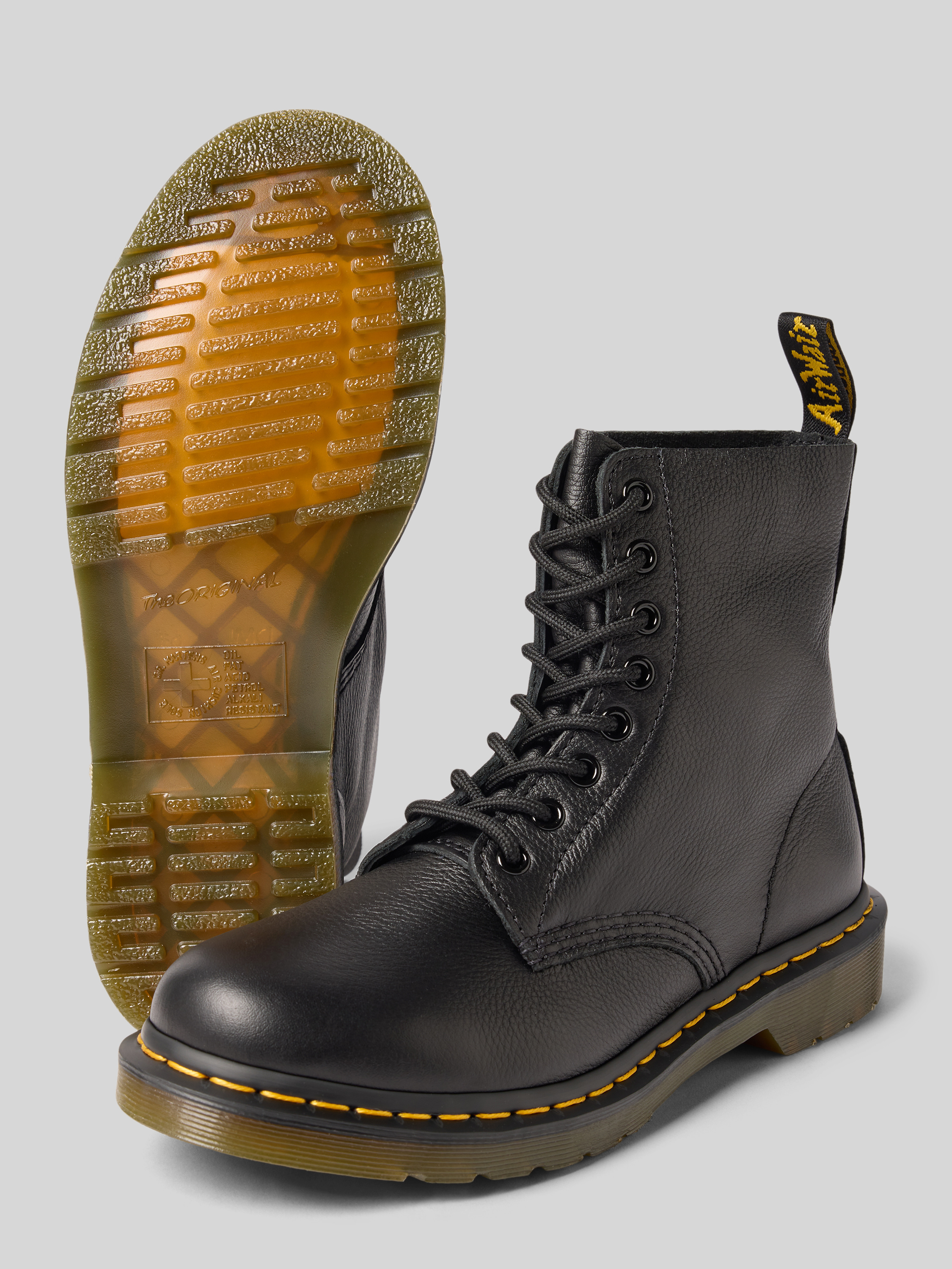 Der Damen-Schnürstiefel von Dr. Martens Modell Eye fällt durch seine abgerundete Passform auf, die für angenehmen Tragekomfort sorgt. Dank der profilierten Sohle erhält man einen sicheren Stand, während der dezente Logo-Patch einen markanten Akzent im Gesamtbild setzt.