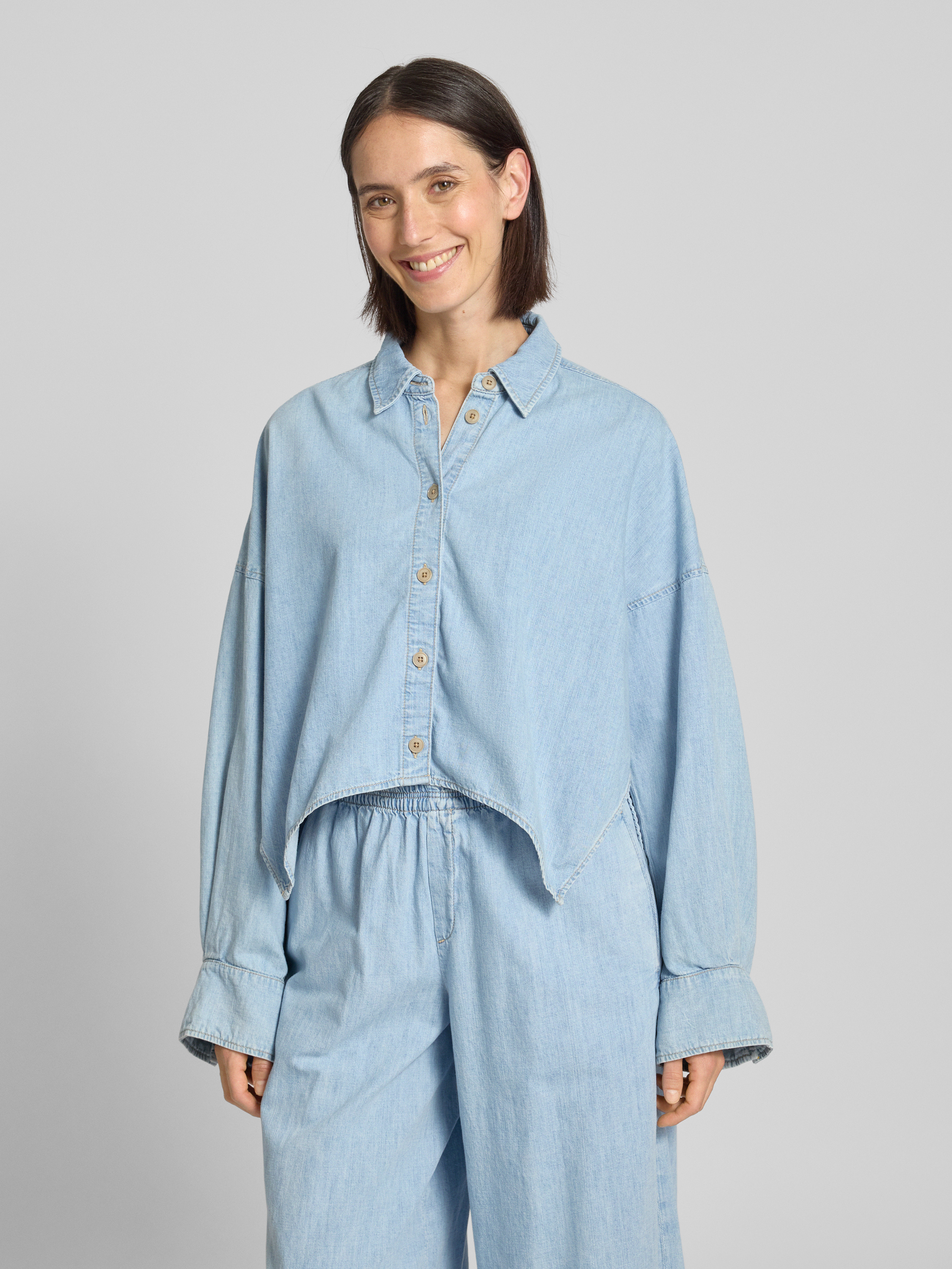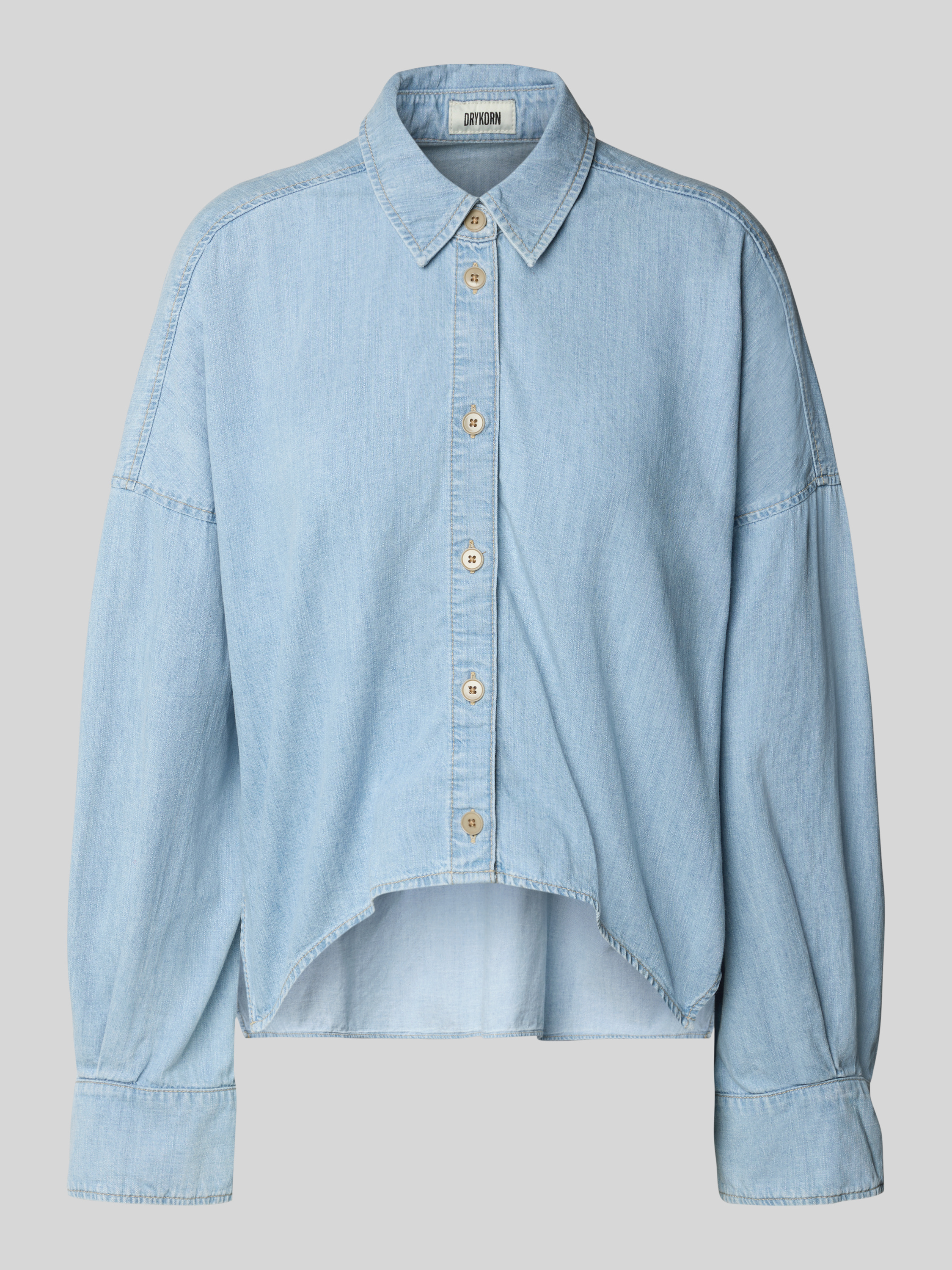 Die Jeansbluse von Drykorn im Modell 'OSHIA' bietet mit ihrem entspannten Schnitt einen angenehmen Tragekomfort. Gefertigt aus reiner Baumwolle, sorgt sie für ein luftiges Gefühl auf der Haut. Der Umlegekragen und die überschnittenen Schultern verleihen der Bluse einen lässigen Look.