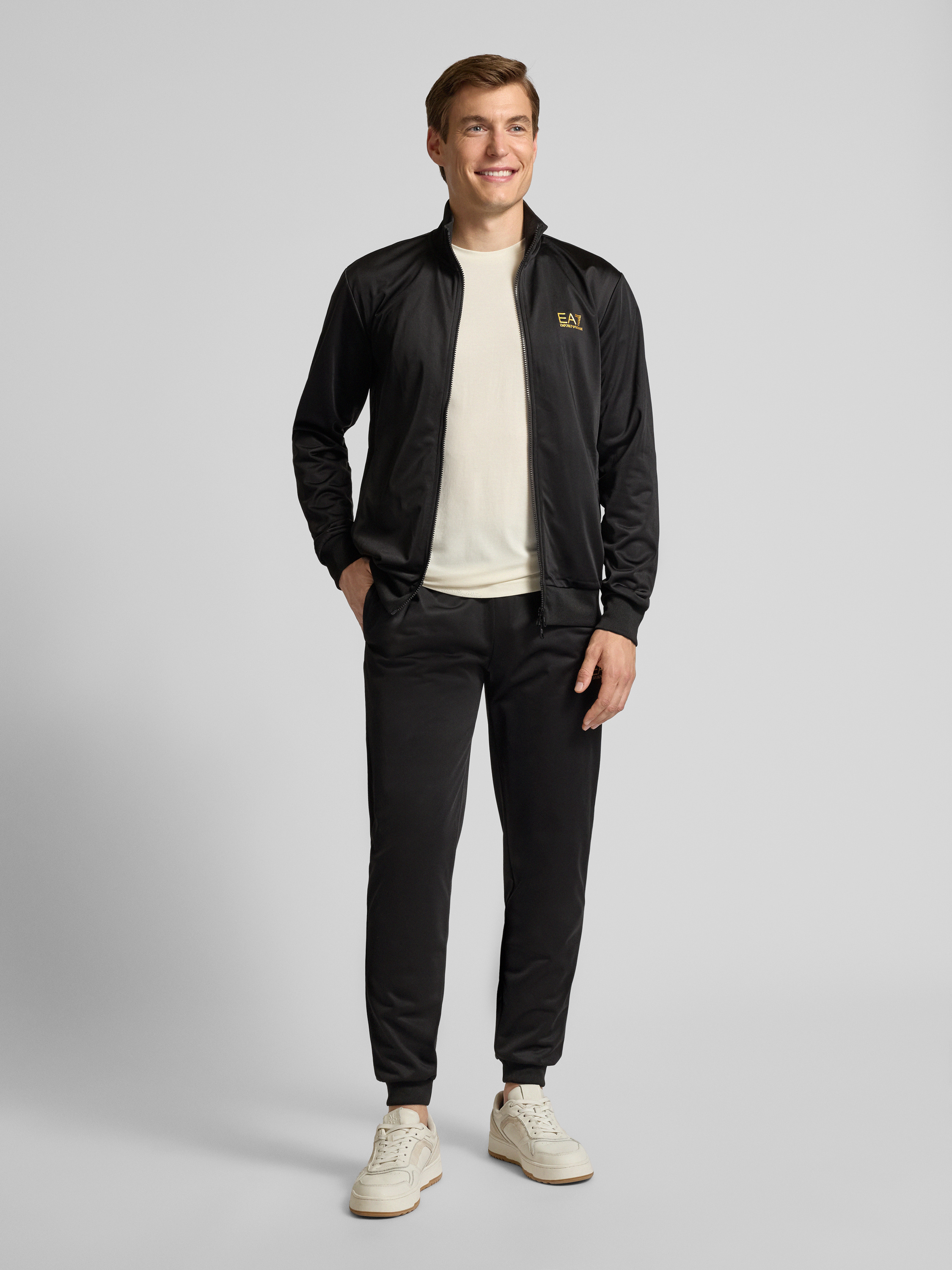 Der Herren Trainingsanzug von EA7 Emporio Armani zeichnet sich durch seinen Regular Fit und den eleganten Stehkragen aus. Der Label-Print verleiht dem Anzug eine stilvolle Note, während die Eingrifftaschen praktische Funktionalität bieten. Hochwertige Materialien sorgen für angenehmen Tragekomfort.