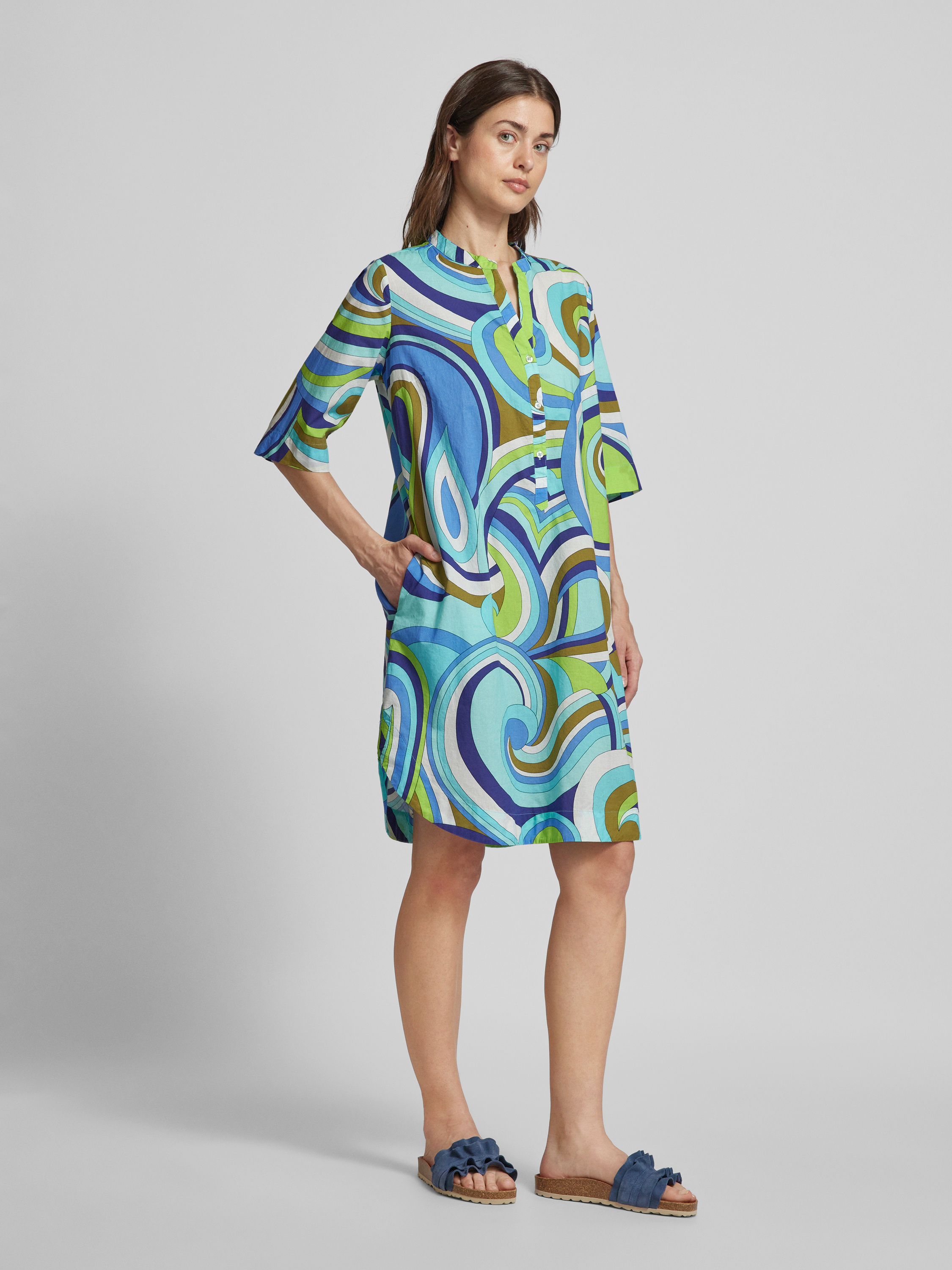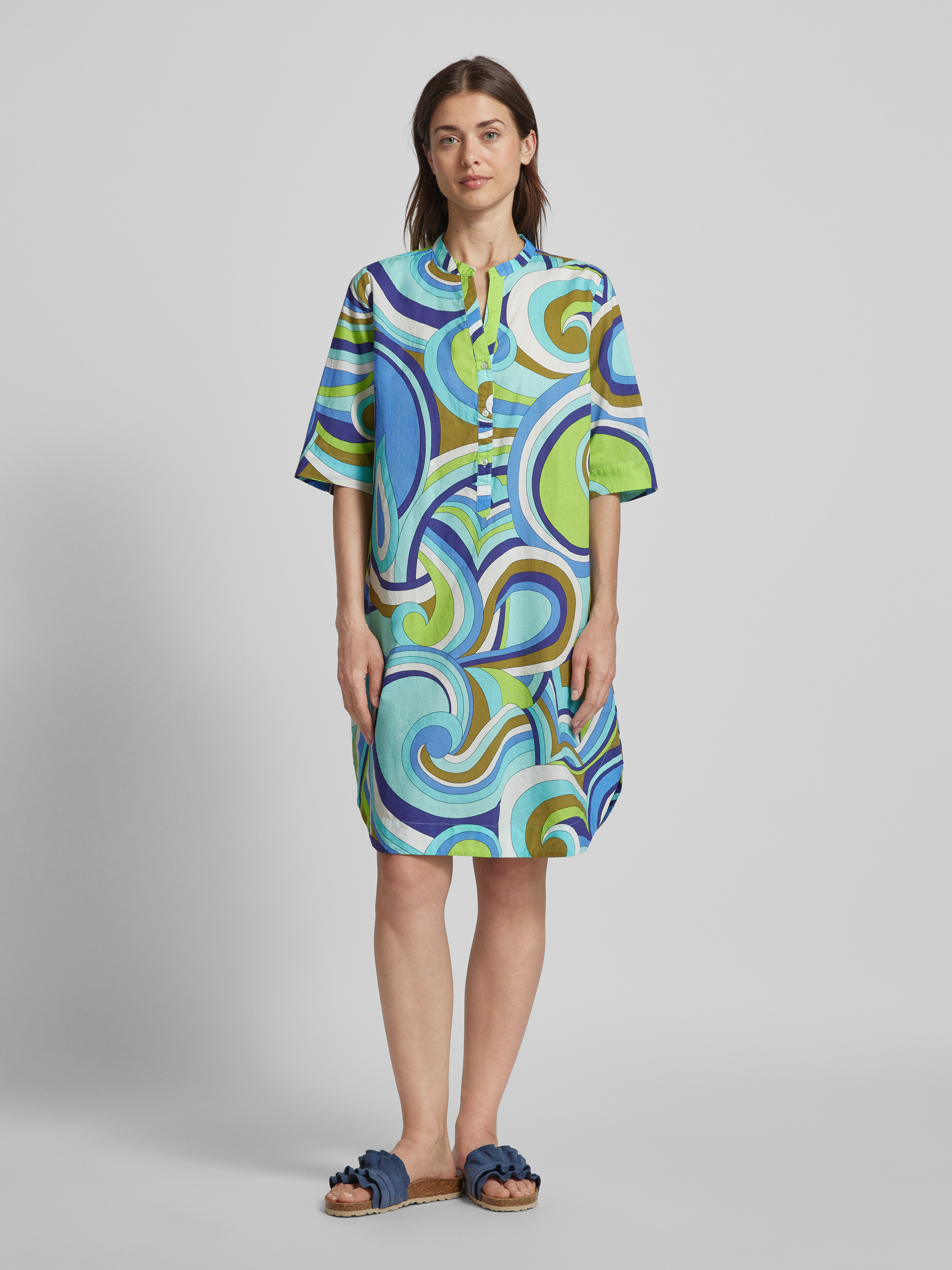 Das Damen Kleid von Emily Van den Bergh fällt durch seinen lockeren Schnitt angenehm leicht und sorgt in reiner Baumwolle für ein entspanntes Tragegefühl. Der Maokragen ergänzt das knielange Design mit einem modernen Akzent, während der Allover-Print dem Outfit Lebendigkeit verleiht. So eignet sich das knielange Kleid mit Allover-Print vielseitig für verschiedene Anlässe und wirkt zugleich unkompliziert.