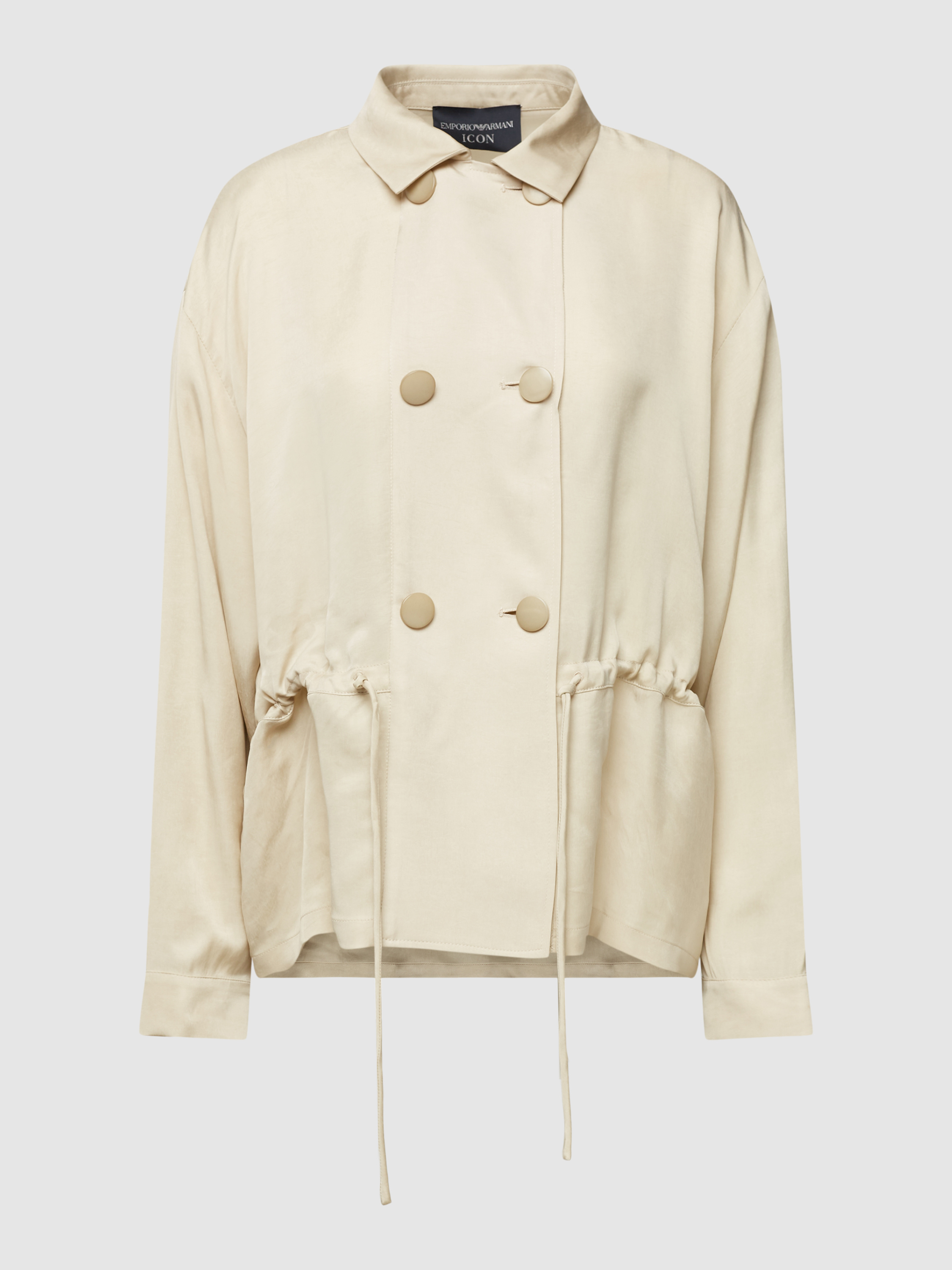 Der Blazer mit Taillengürtel von Emporio Armani zeichnet sich durch seinen taillierten Schnitt aus, der eine elegante Silhouette formt. Aus reinem Cupro gefertigt, bietet er ein angenehmes Tragegefühl. Der Kragen und die zweireihige Knopfleiste verleihen einen klassischen Touch.