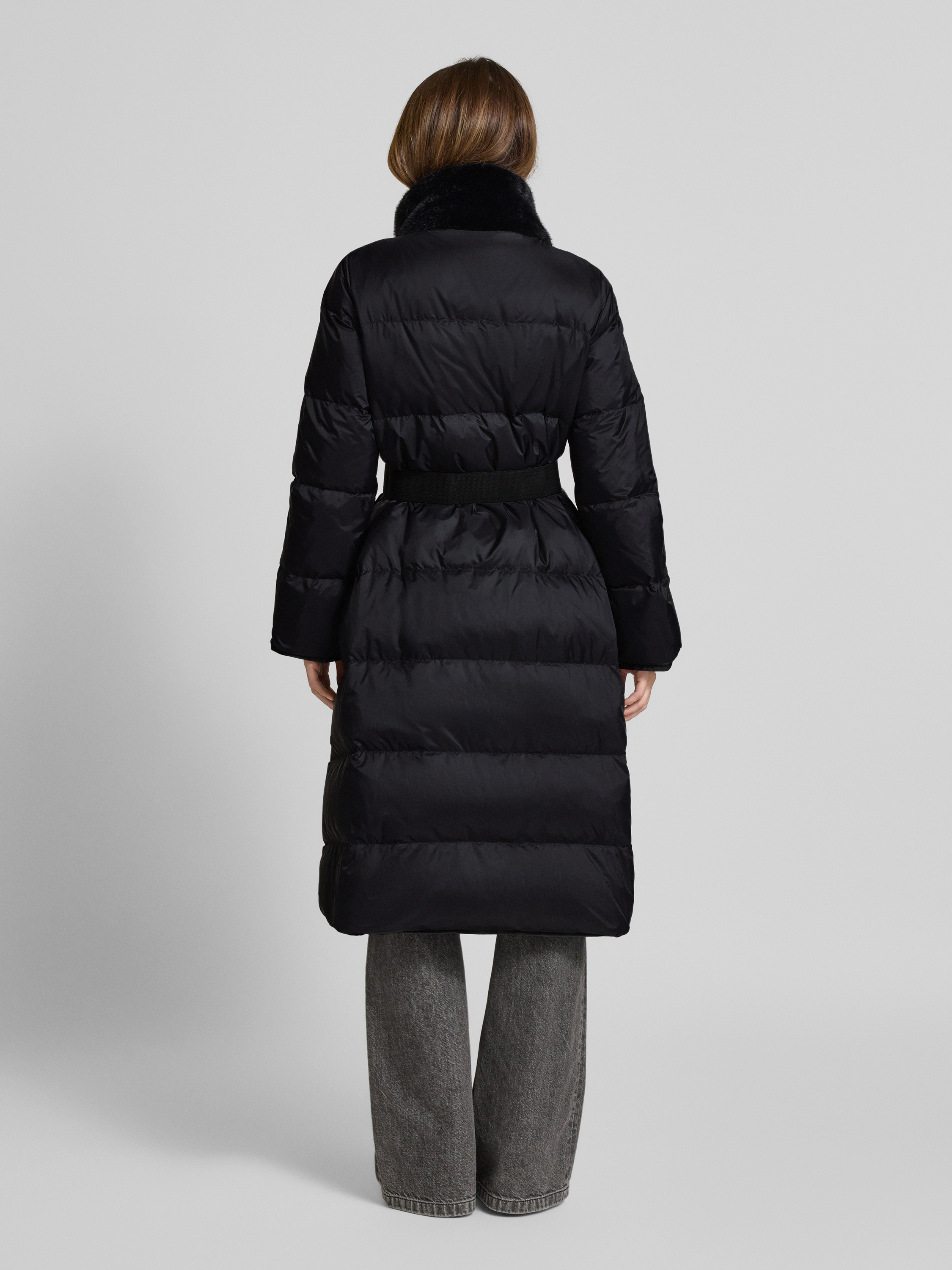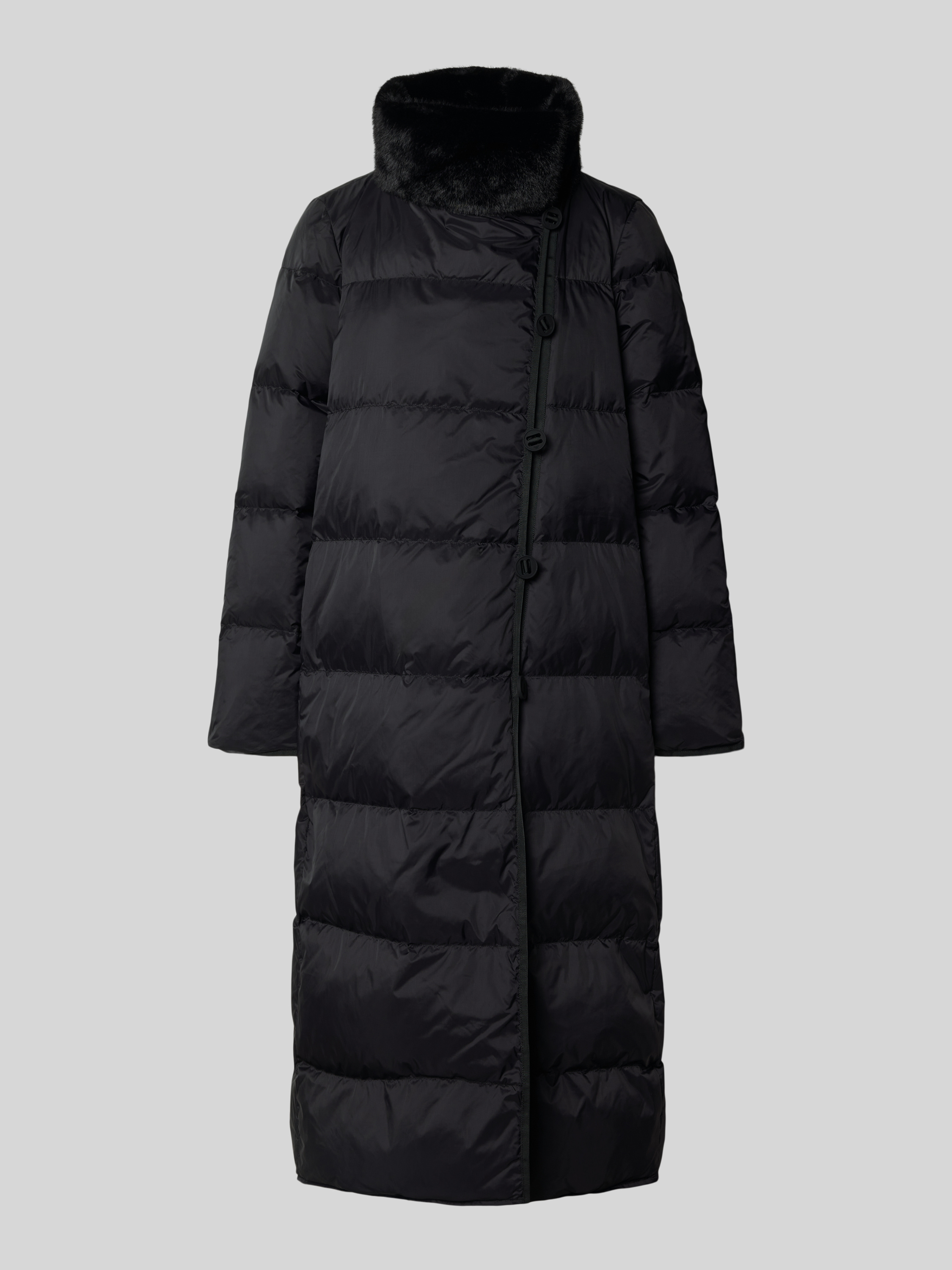 Der Damenmantel von Emporio Armani fällt durch seinen lockeren Schnitt und den Stehkragen aus Kunstfell angenehm auf. Daunen sorgen dabei für eine spürbar leichte Wärme, während die Steppnähte für eine dezente Struktur sorgen. Mit der Knopfleiste lässt sich das Modell unkompliziert schließen.