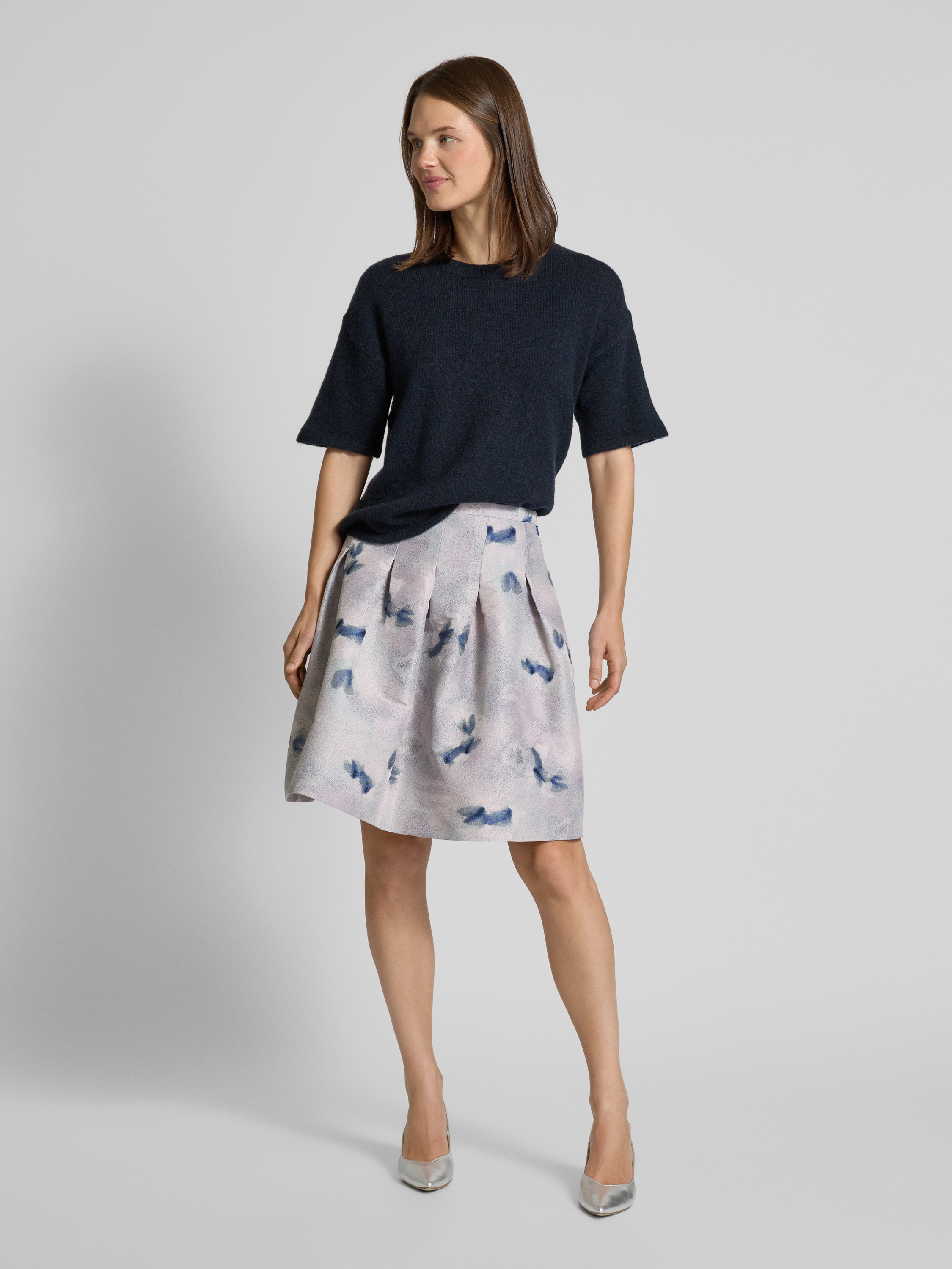 Der knielange Rock von Emporio Armani präsentiert sich in einer eleganten A-Linie, die durch stilvolle Kellerfalten ergänzt wird. Das Design sorgt für eine schmeichelhafte Silhouette, während der weiche Stoff angenehm auf der Haut liegt. Ideal für vielseitige Kombinationen im Alltag und zu besonderen Anlässen.