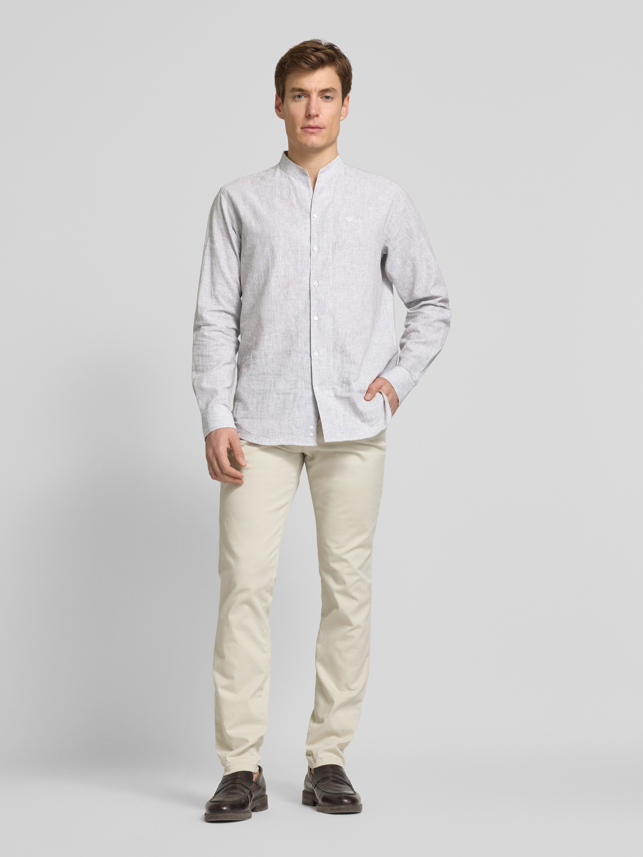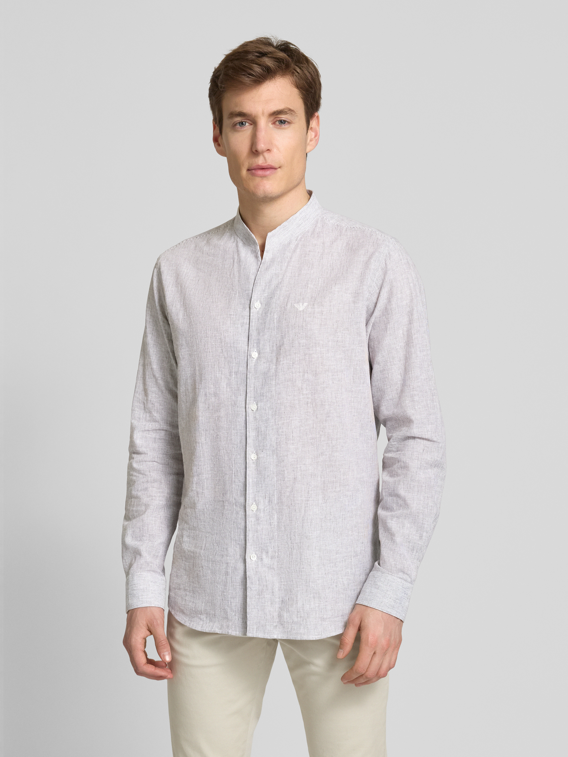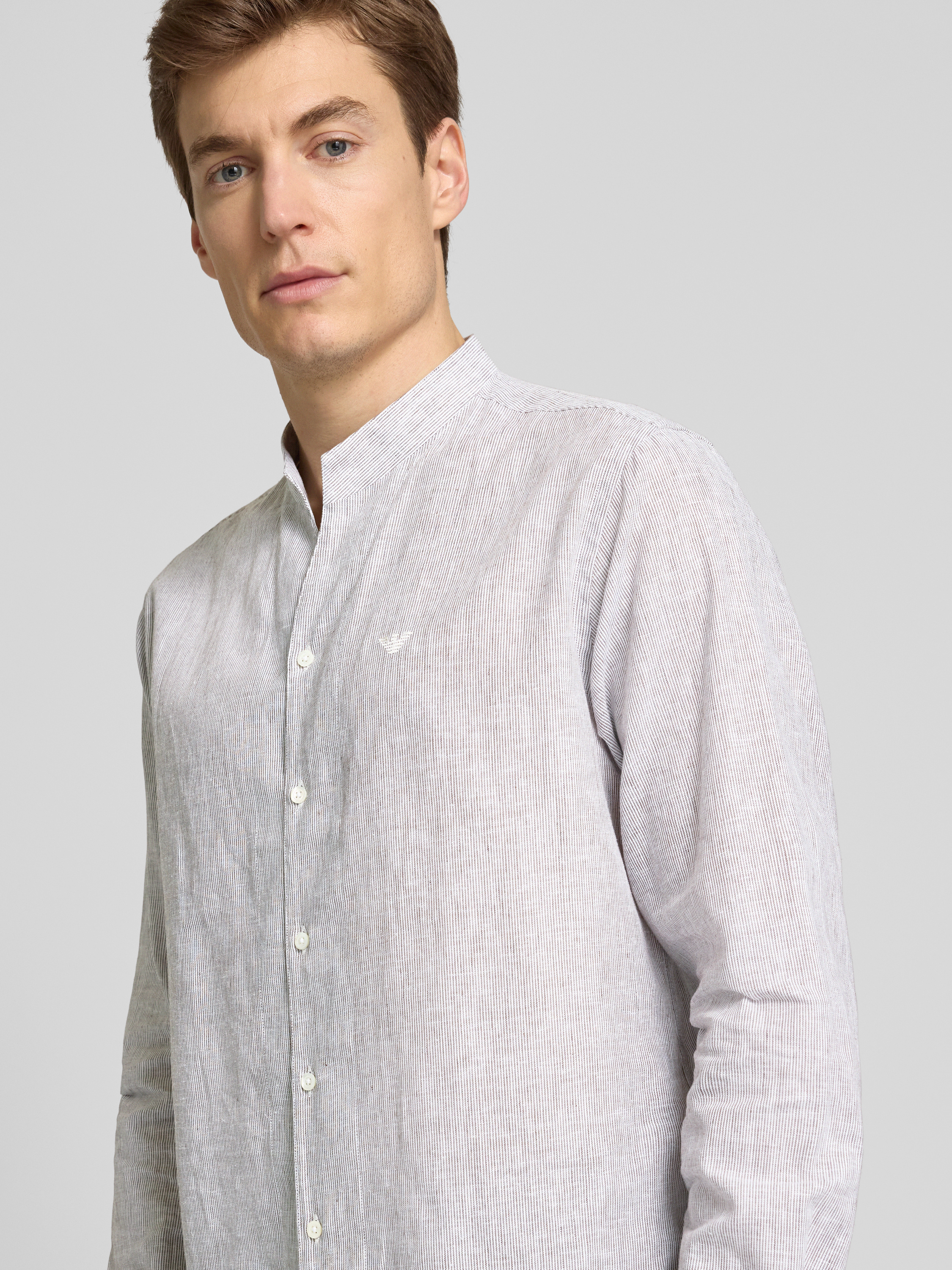 Das Herren Freizeithemd von Emporio Armani kombiniert einen angenehmen Leinen-Baumwoll-Mix mit einem modernen Regular Fit. Der Stehkragen verleiht dem Hemd eine elegante Note, während die dezente Knopfleiste und das Label-Stitching für subtile Details sorgen. Ideal für lässige Anlässe.