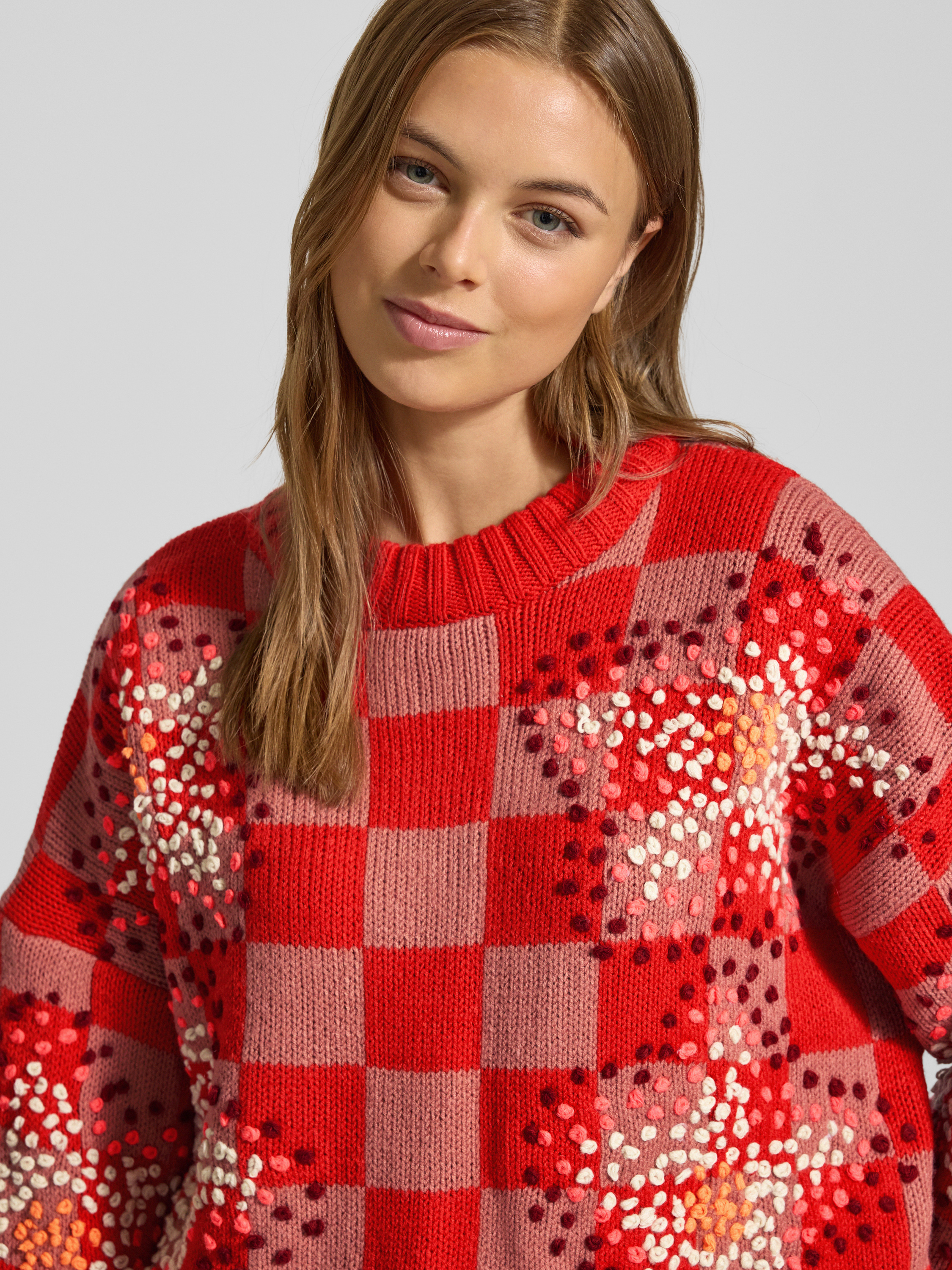 Der Damen Pullover von Essentiel Antwerp verbindet Loose-Fit-Passform mit einem auffälligen Allover-Muster und Motiv-Stitching, wodurch sich ein lässiger Stil ergibt. Durch den Schurwoll-Mix fühlt sich das Strickmaterial angenehm an und wärmt zuverlässig an kühleren Tagen. Überschnittene Schultern und ein Rundhals runden das entspannte Gesamtbild ab.