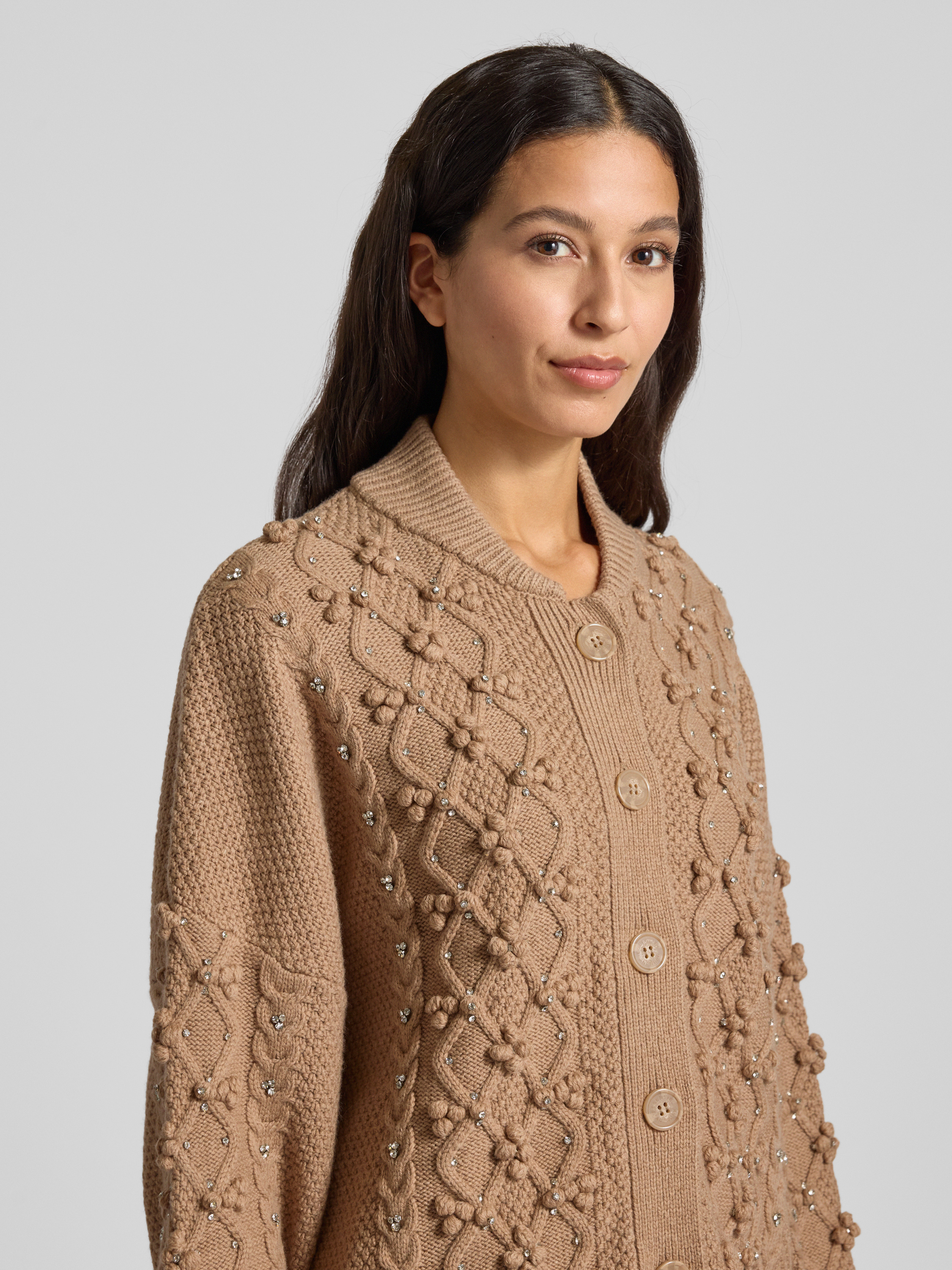 Essentiel AntwerpLoose Fit Strickjacke aus Woll-Mix mit Strasssteinbesatz Modell 'ILTIMATE' in camel