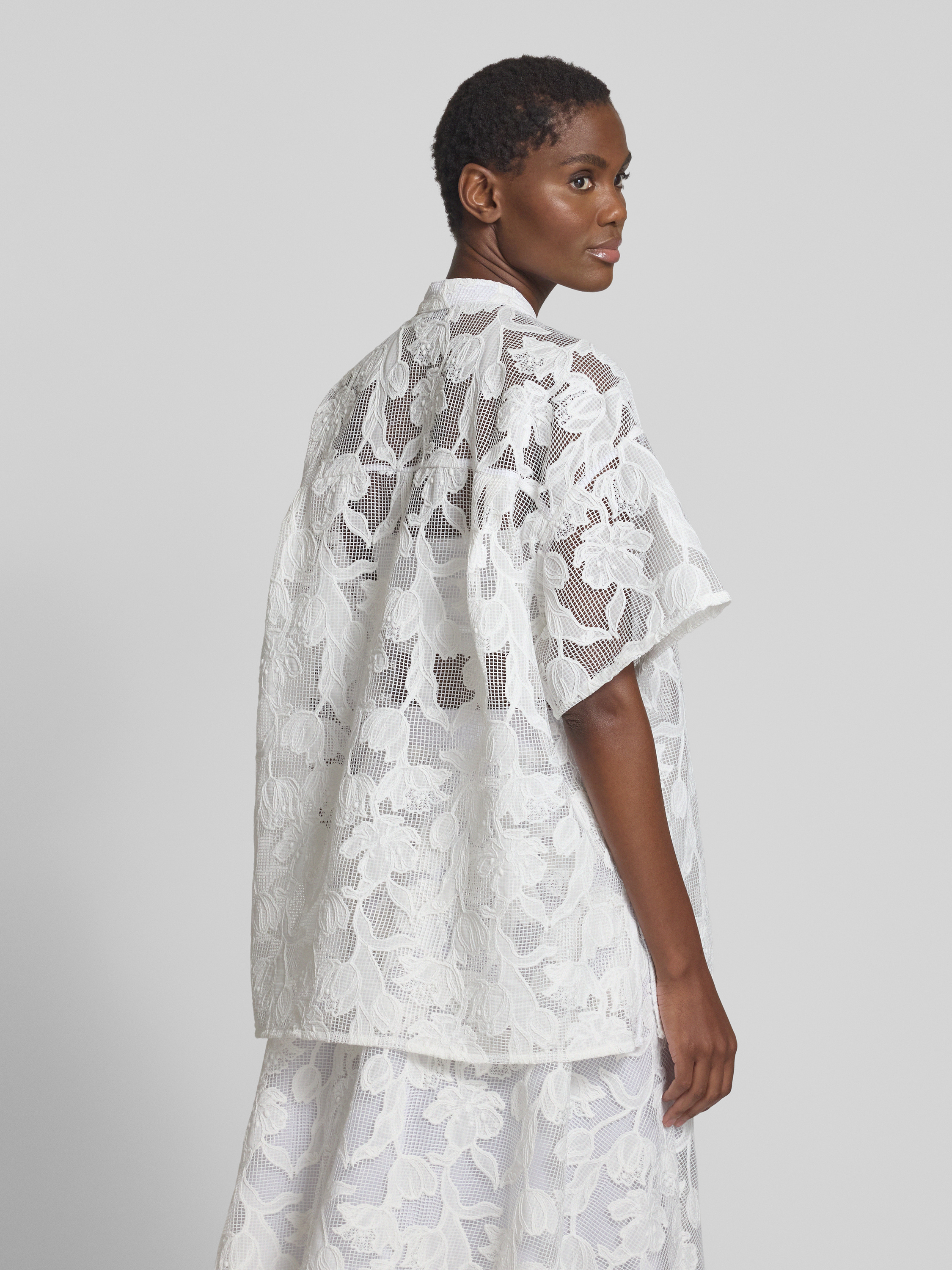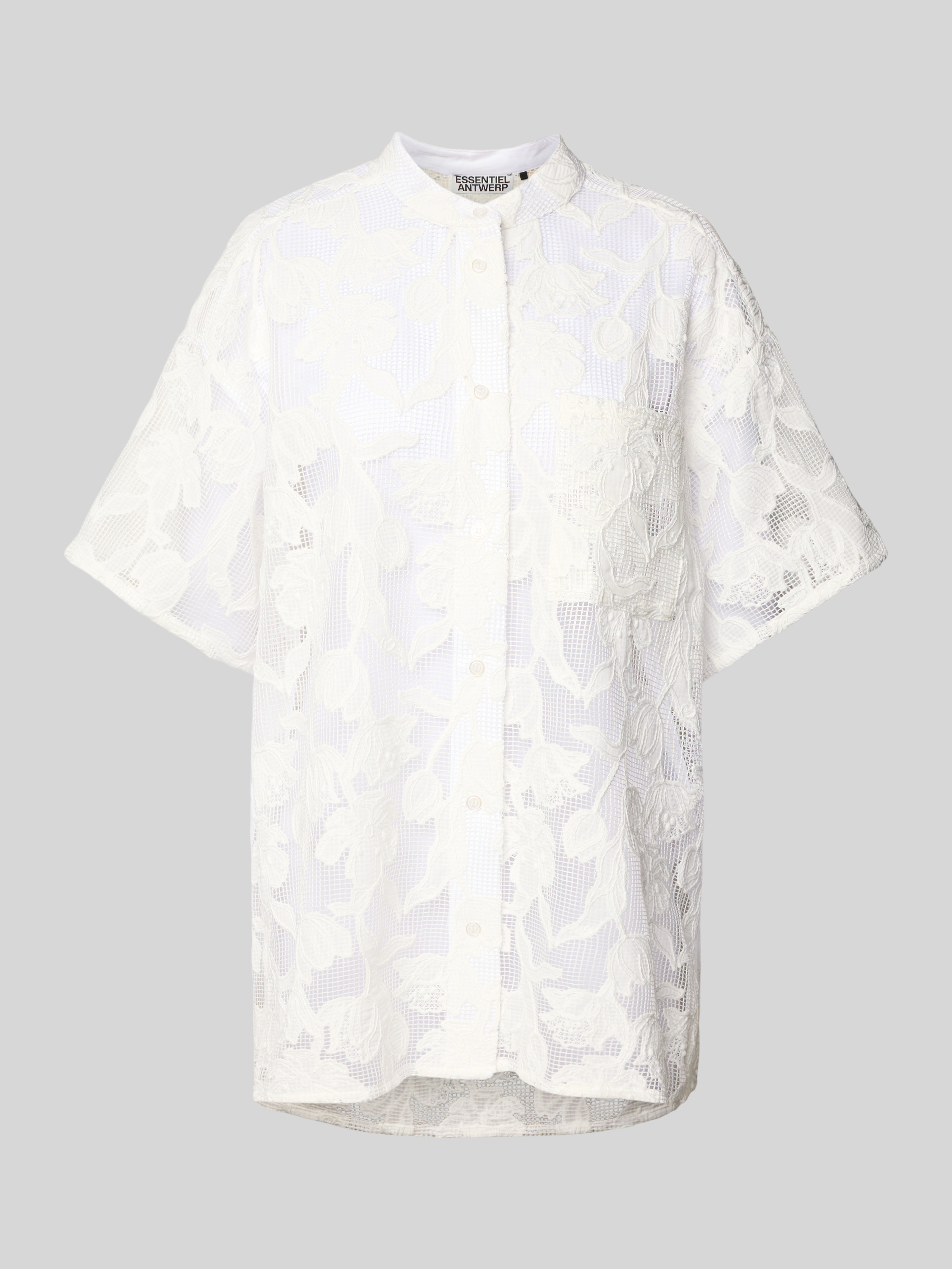 Die Oversized Hemdbluse 'HOK' von Essentiel Antwerp zeichnet sich durch ihren entspannten Schnitt und den eleganten Manderinkragen aus. Das semitransparente Design und die feinen Spitzenstickereien verleihen ihr eine besondere Leichtigkeit, während überschnittene Schultern und kurze Ärmel für Komfort sorgen. Perfekt für stilvolle Auftritte.