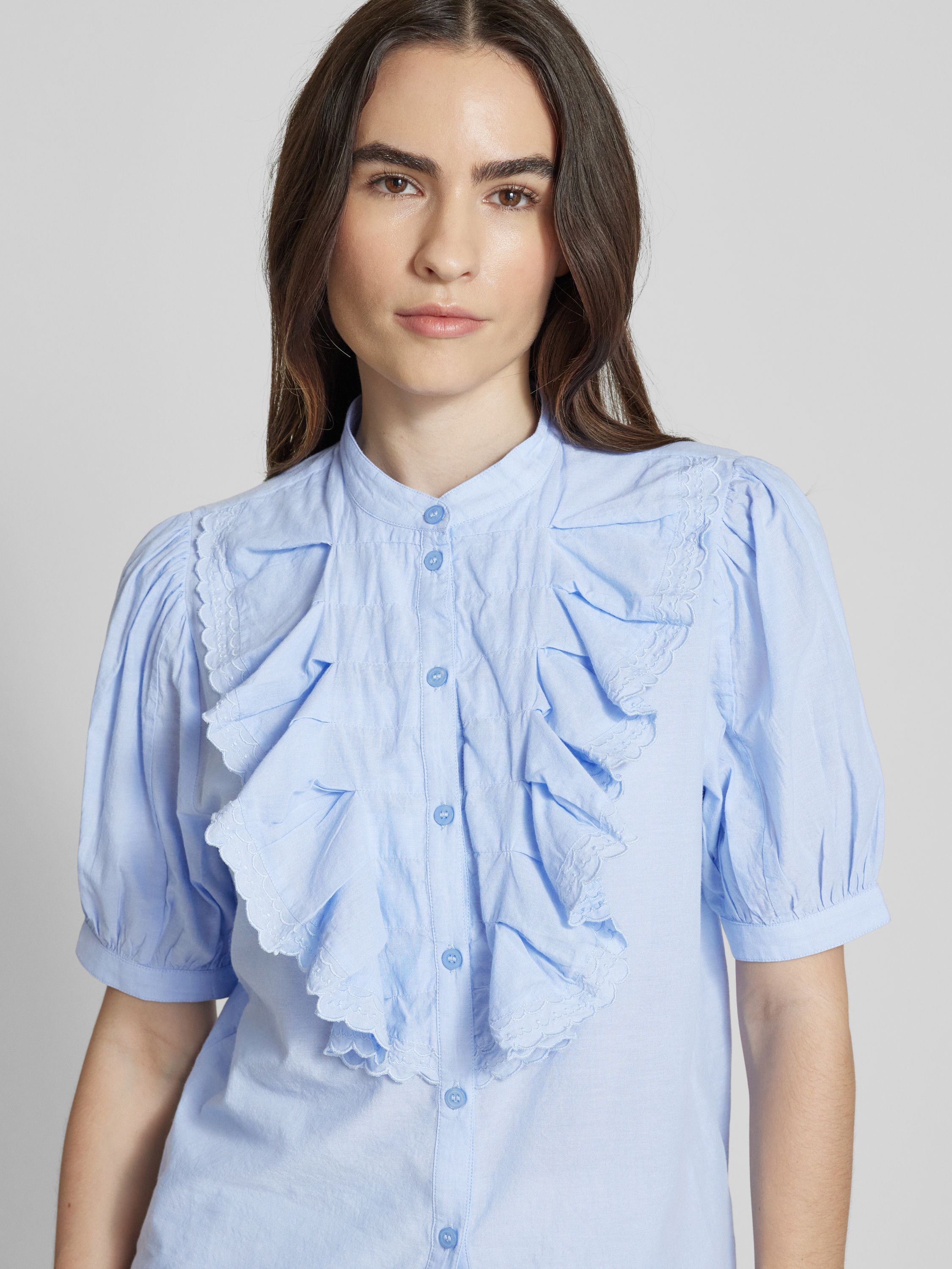 Die Damen Hemdbluse von Essentiel Antwerp im Regular-Fit präsentiert sich mit einem Maokragen und setzt durch feine Volants dezente Akzente. Reine Baumwolle sorgt für ein angenehmes Tragegefühl und unterstützt die luftige Wirkung des 1/2-Arms. Modell 'Hamadeus' eignet sich vielseitig für entspannte oder gepflegte Outfits.