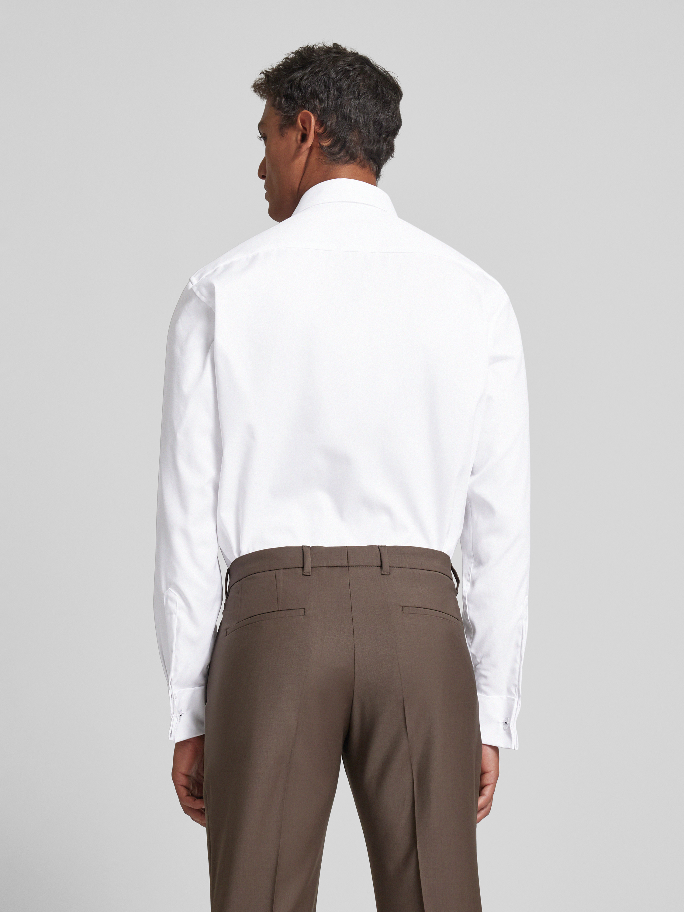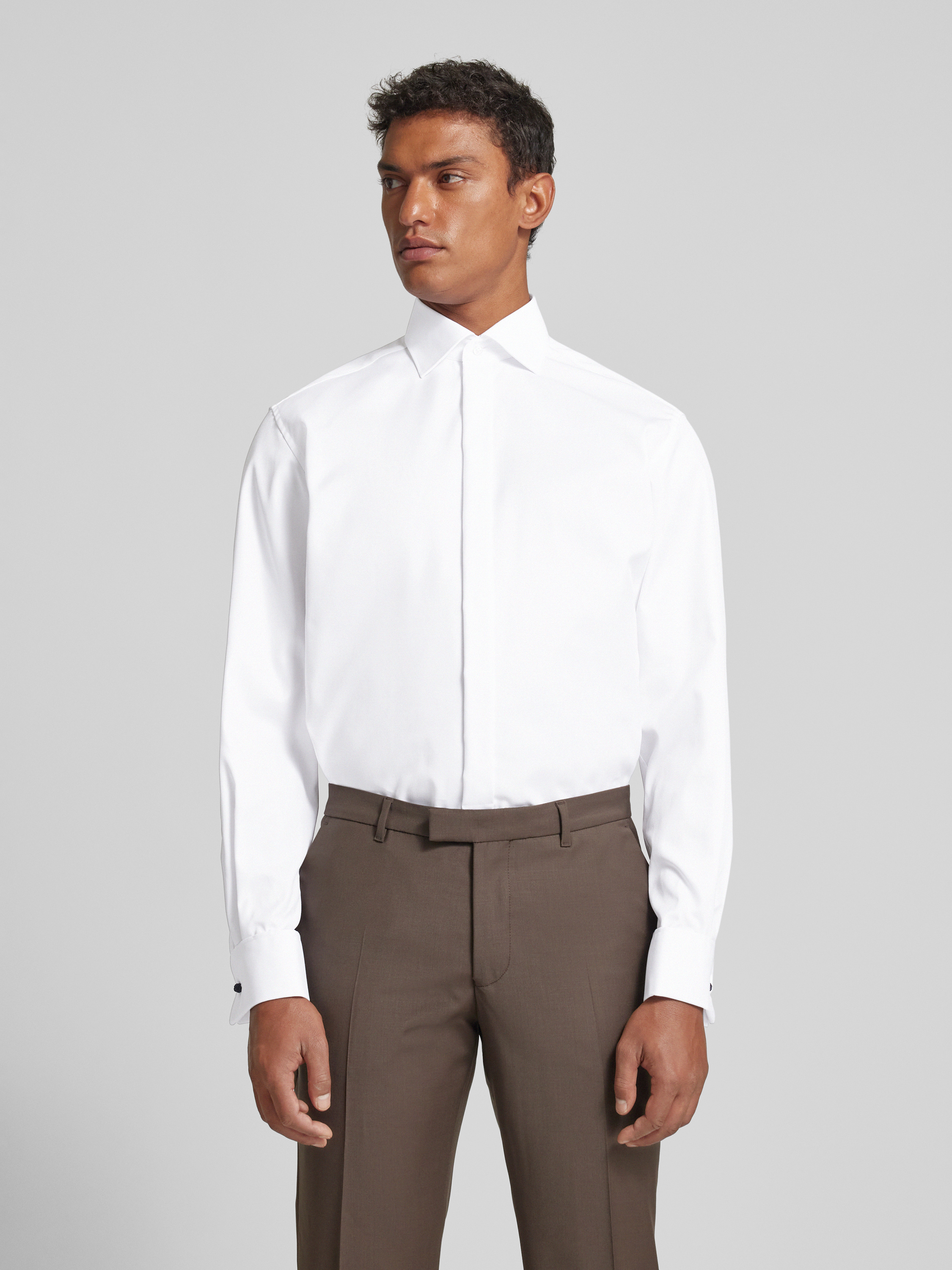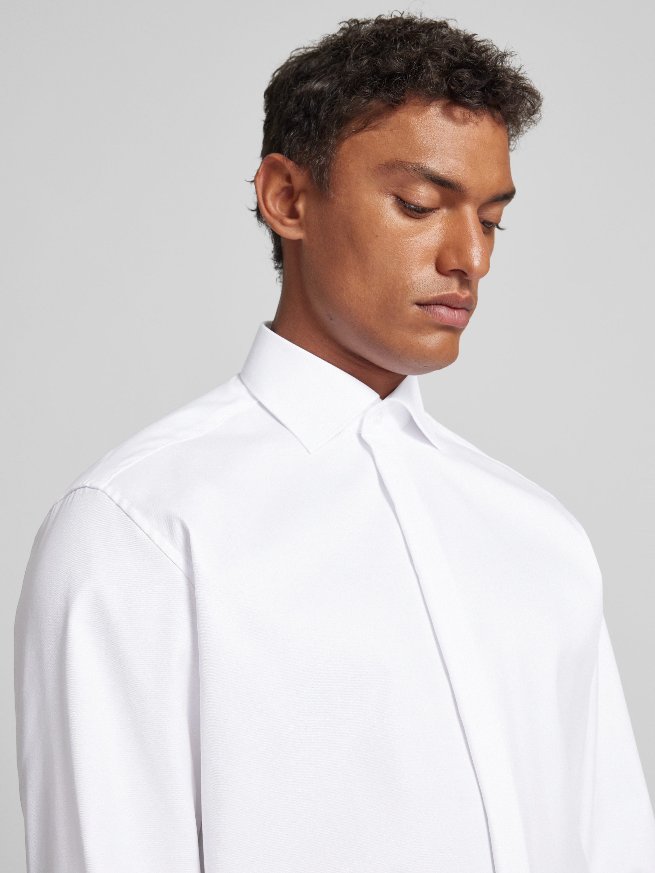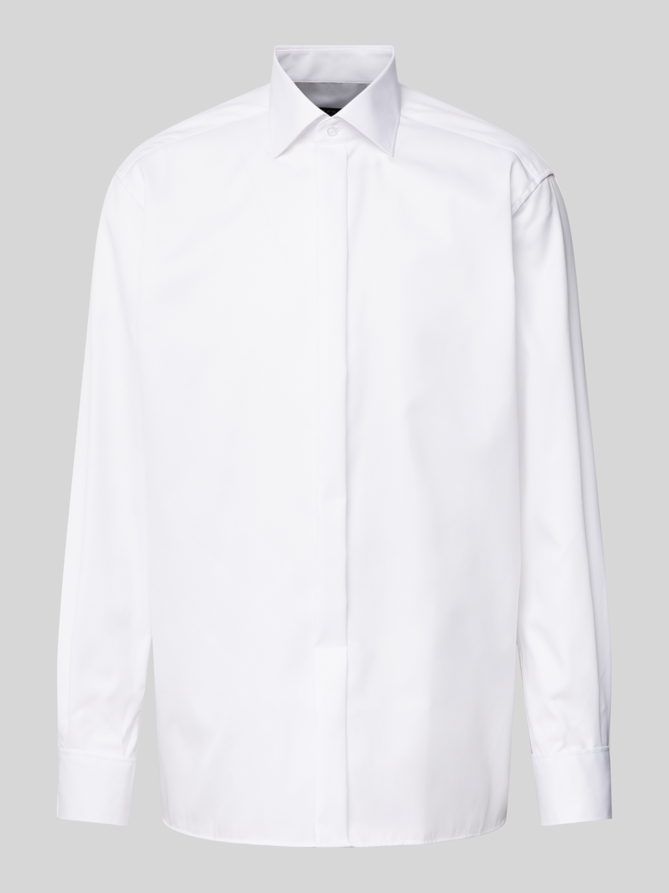 Das ETERNA Smokinghemd in Comfort Fit aus feiner Baumwolle verbindet stilvolle Eleganz mit praktischer Pflegeleichtigkeit. Der Kentkragen und die verdeckte Knopfleiste sorgen für einen klassischen Look, während die bügelfreie Eigenschaft den Alltag erleichtert. Ideal für formelle Anlässe geeignet.