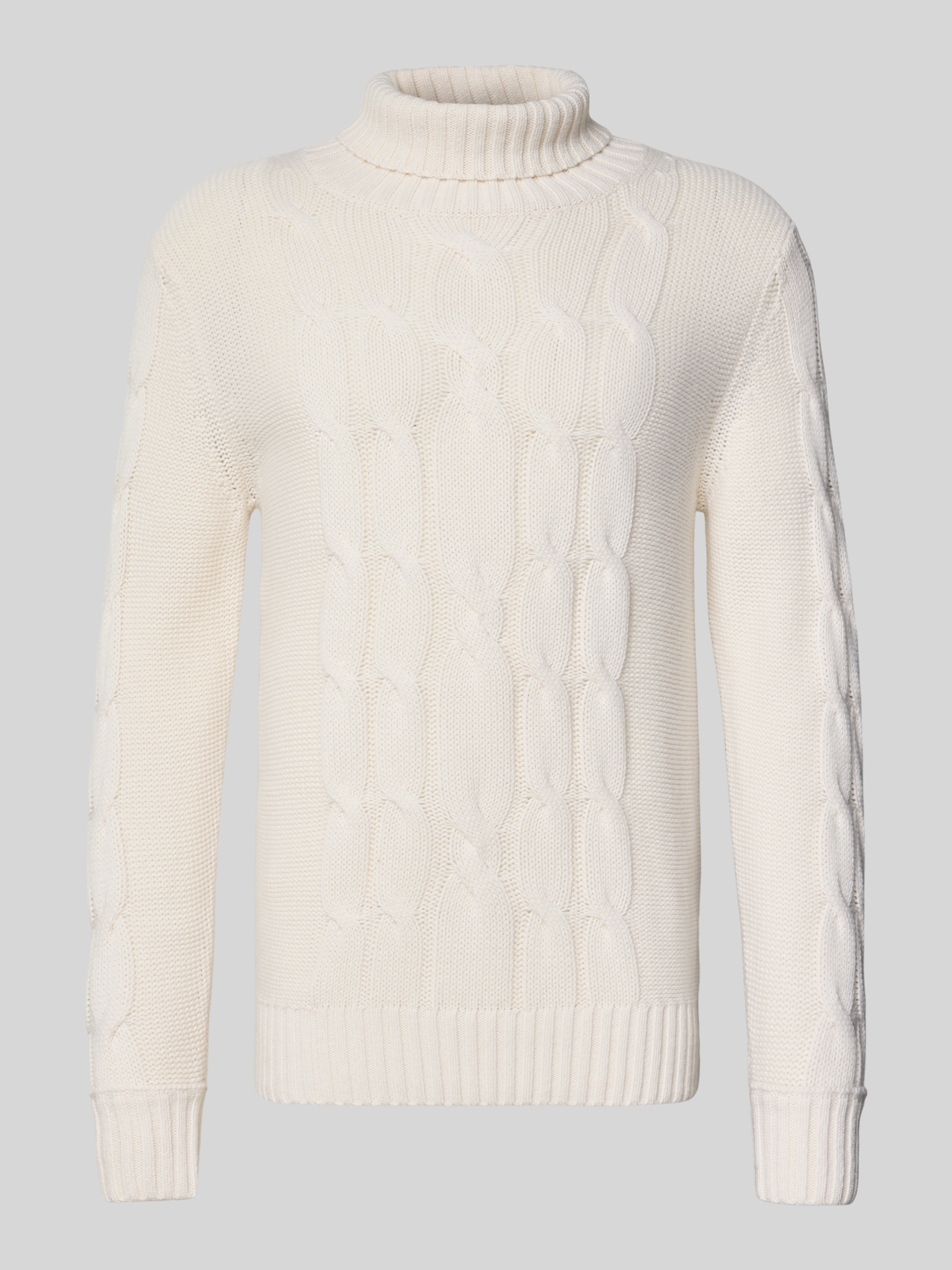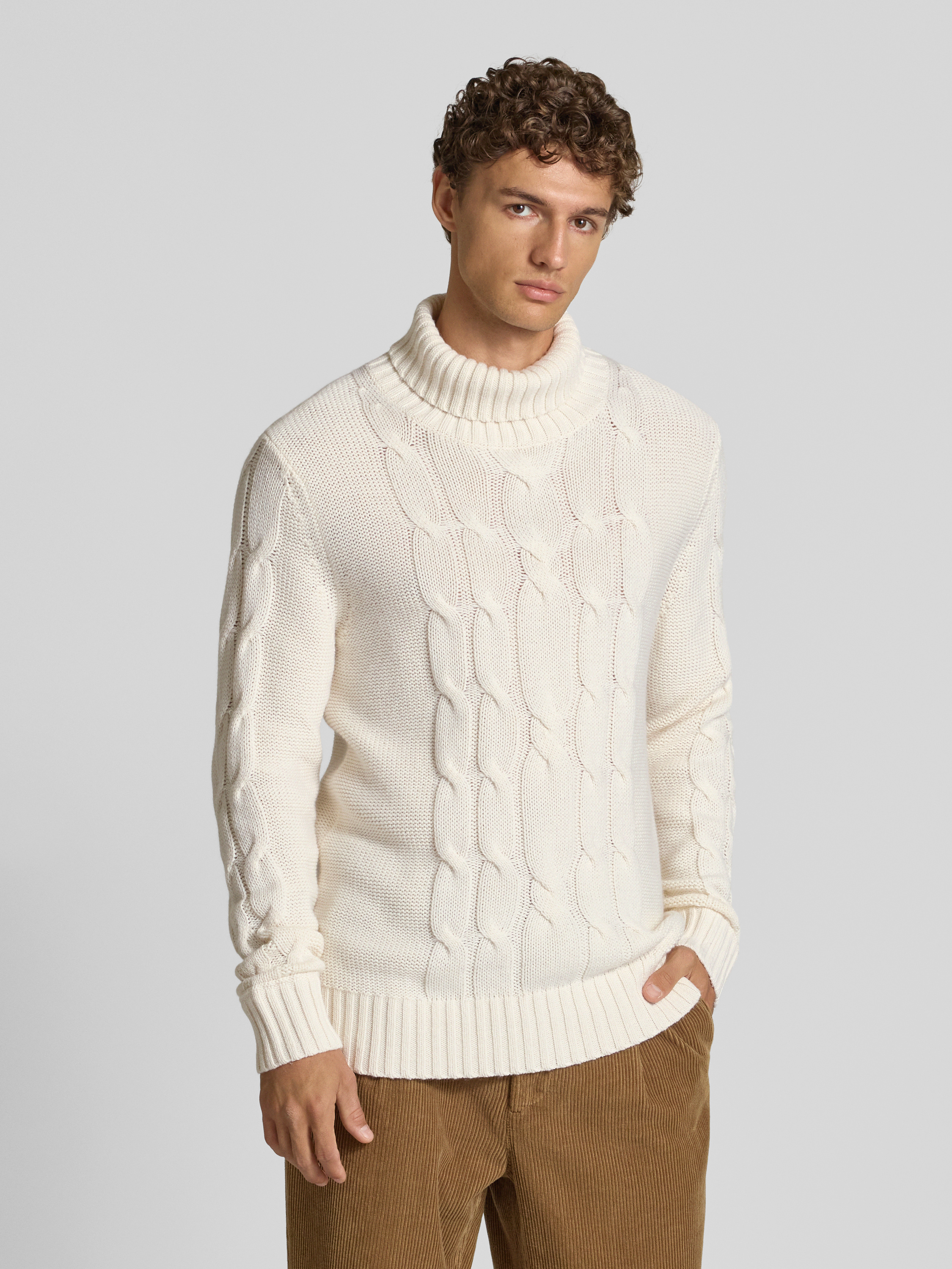 Der Herren Strickpullover von FTC-Cashmere kombiniert einen angenehm weichen Baumwoll-Kaschmir-Mix mit einem klassischen Zopfmuster und einem Rollkragen. Durch die körpernahe Passform schmiegt sich das Modell bequem an, ohne einzuengen. So eignet sich der Pullover für verschiedenste Anlässe im Alltag.