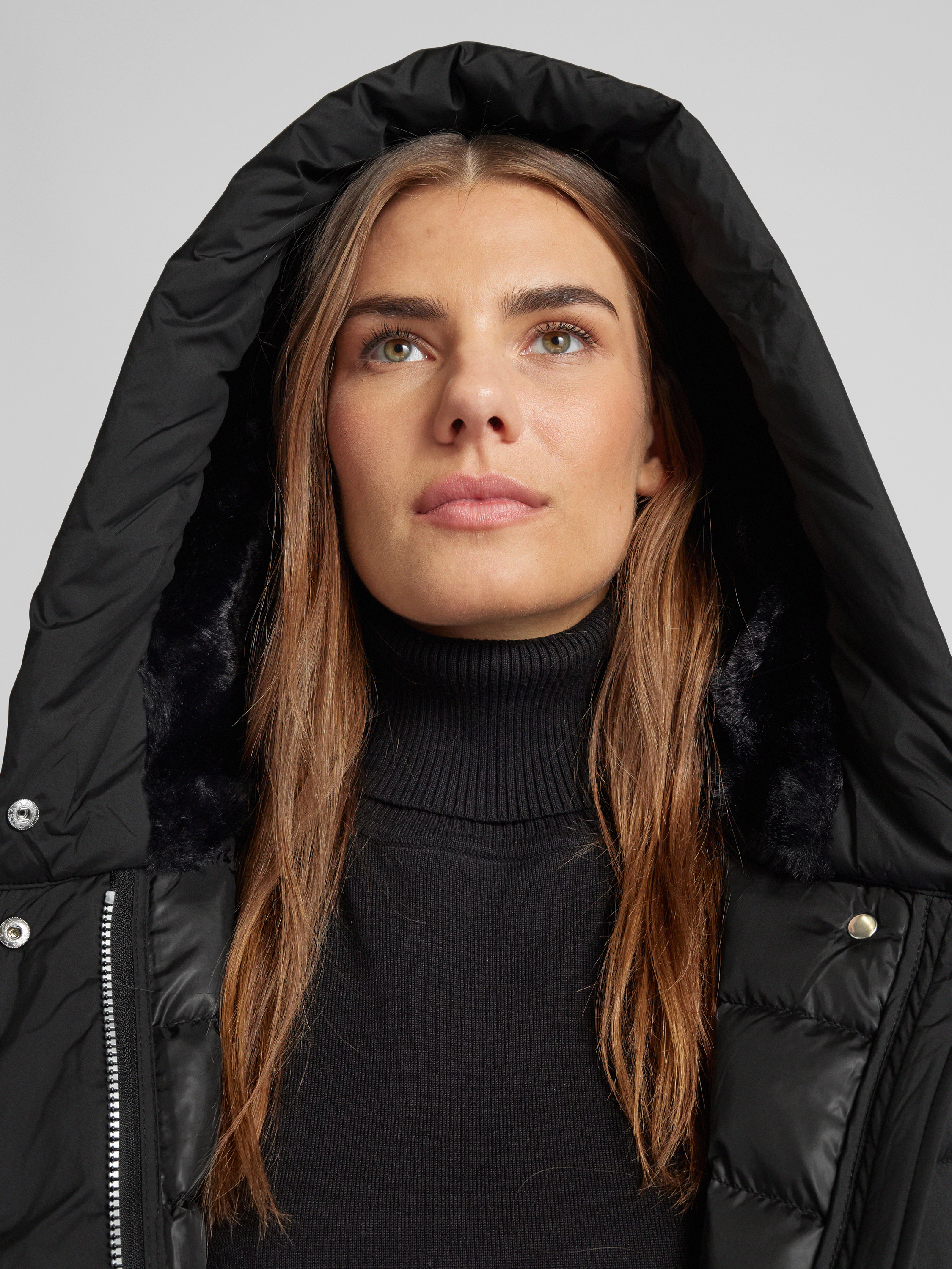 Der Fuchs & Schmitt Steppmantel ist ein eleganter Damenmantel, der durch seinen geraden Schnitt und die feinen Steppnähte besticht. Das Kunstfellfutter sorgt für angenehme Wärme, während die Kapuze bei wechselhaftem Wetter zusätzlichen Schutz bietet. Ideal für stilvolle Auftritte an kühleren Tagen.