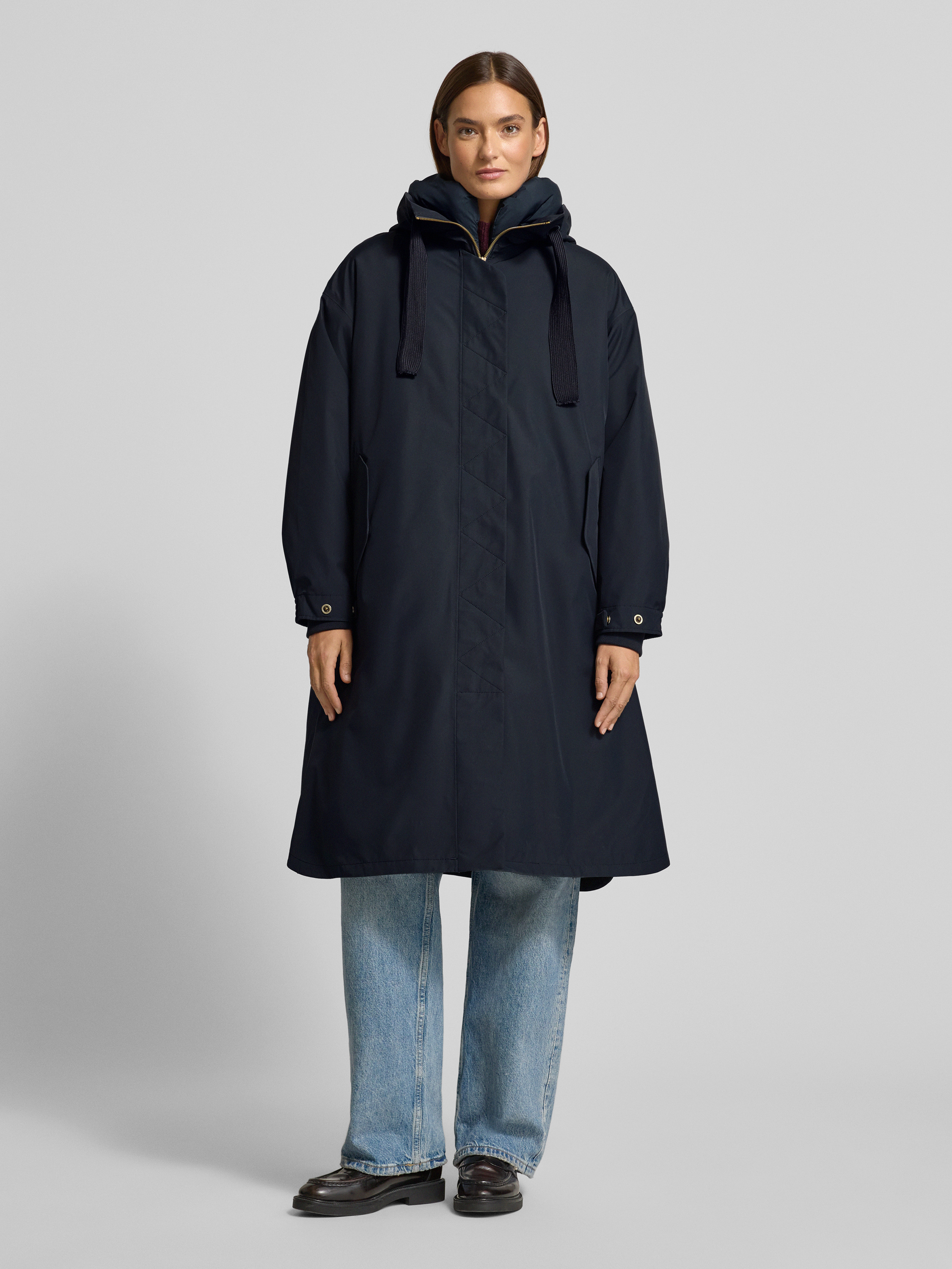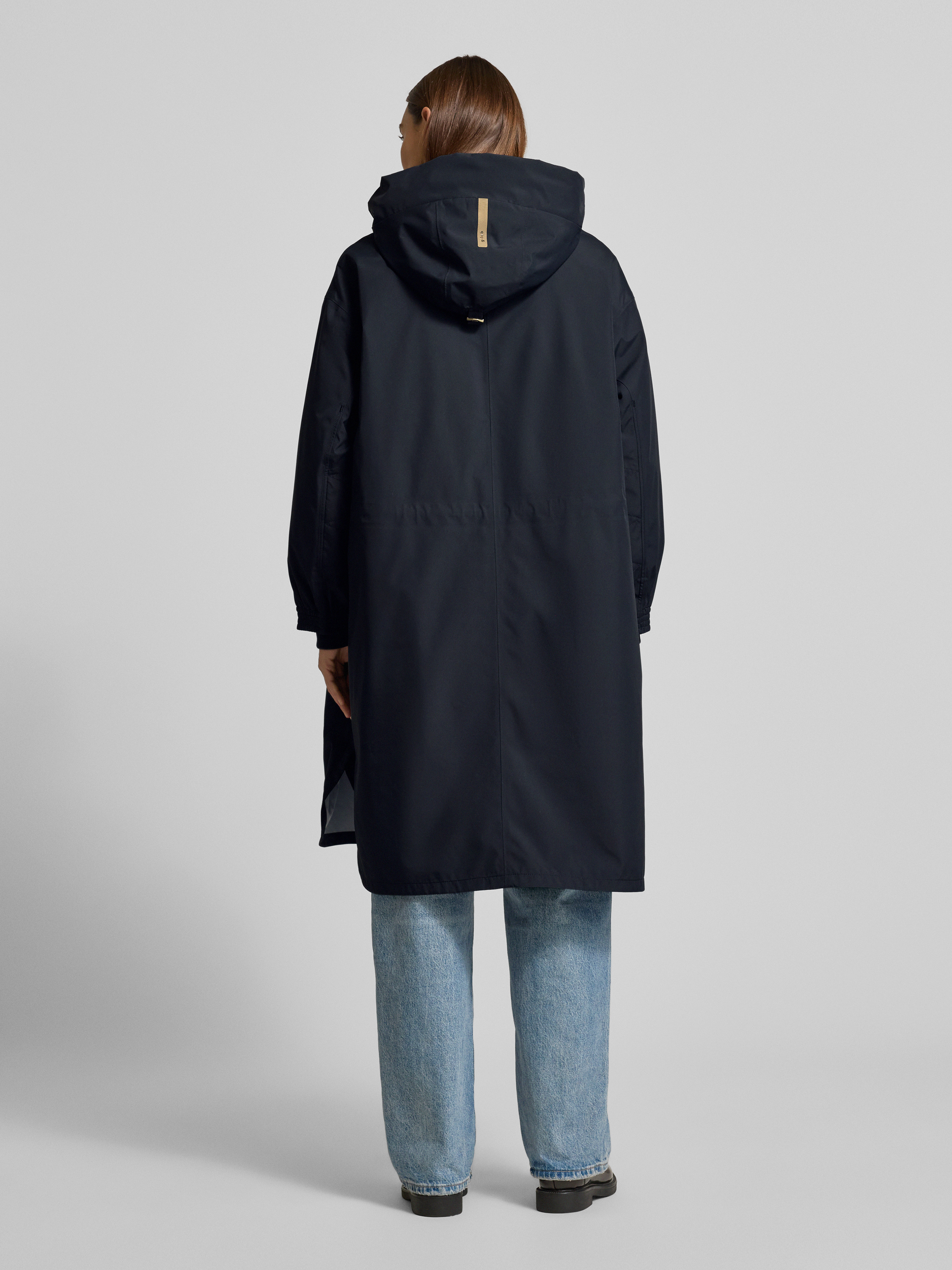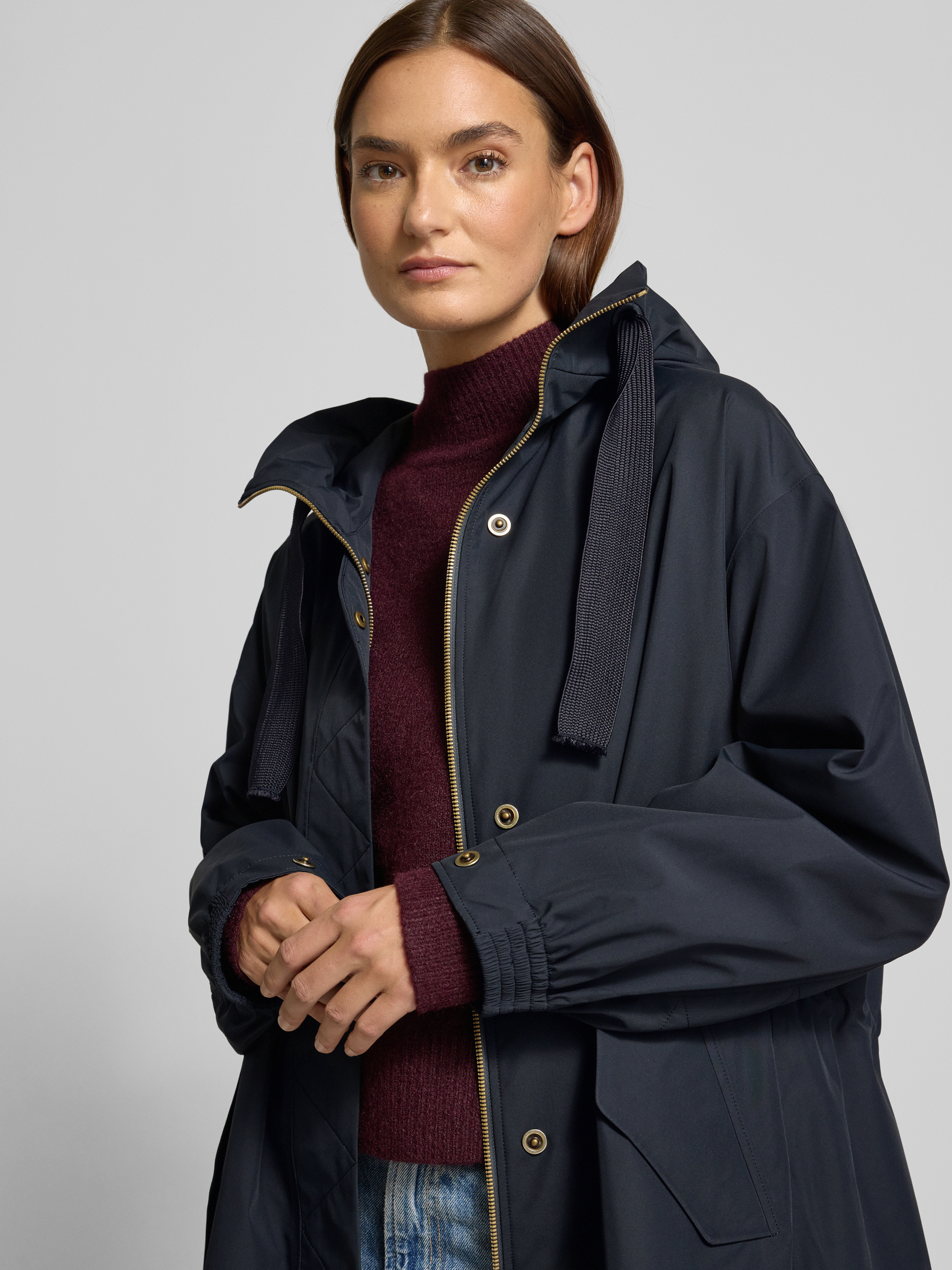 Der Damen Mantel von G-LAB zeigt sich mit lockerer Passform und einer praktischen Kapuze, die bei wechselhaftem Wetter Schutz spendet. Das herausnehmbare Innenfutter ermöglicht Anpassungen je nach Jahreszeit. Durch den Tunnelzug lässt sich der Sitz individuell variieren, während Pattentaschen zusätzlichen Stauraum bieten.
