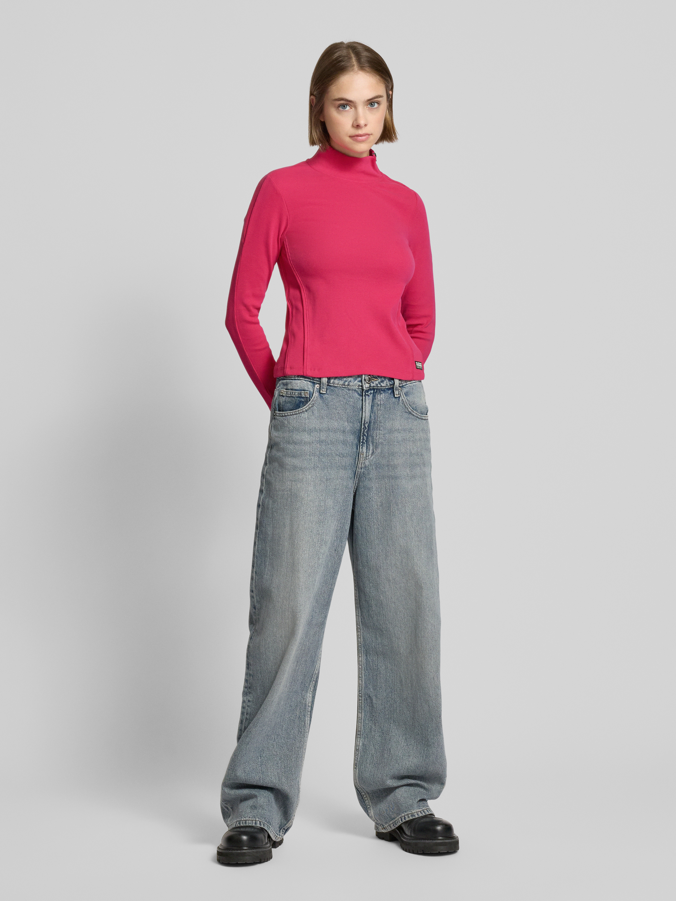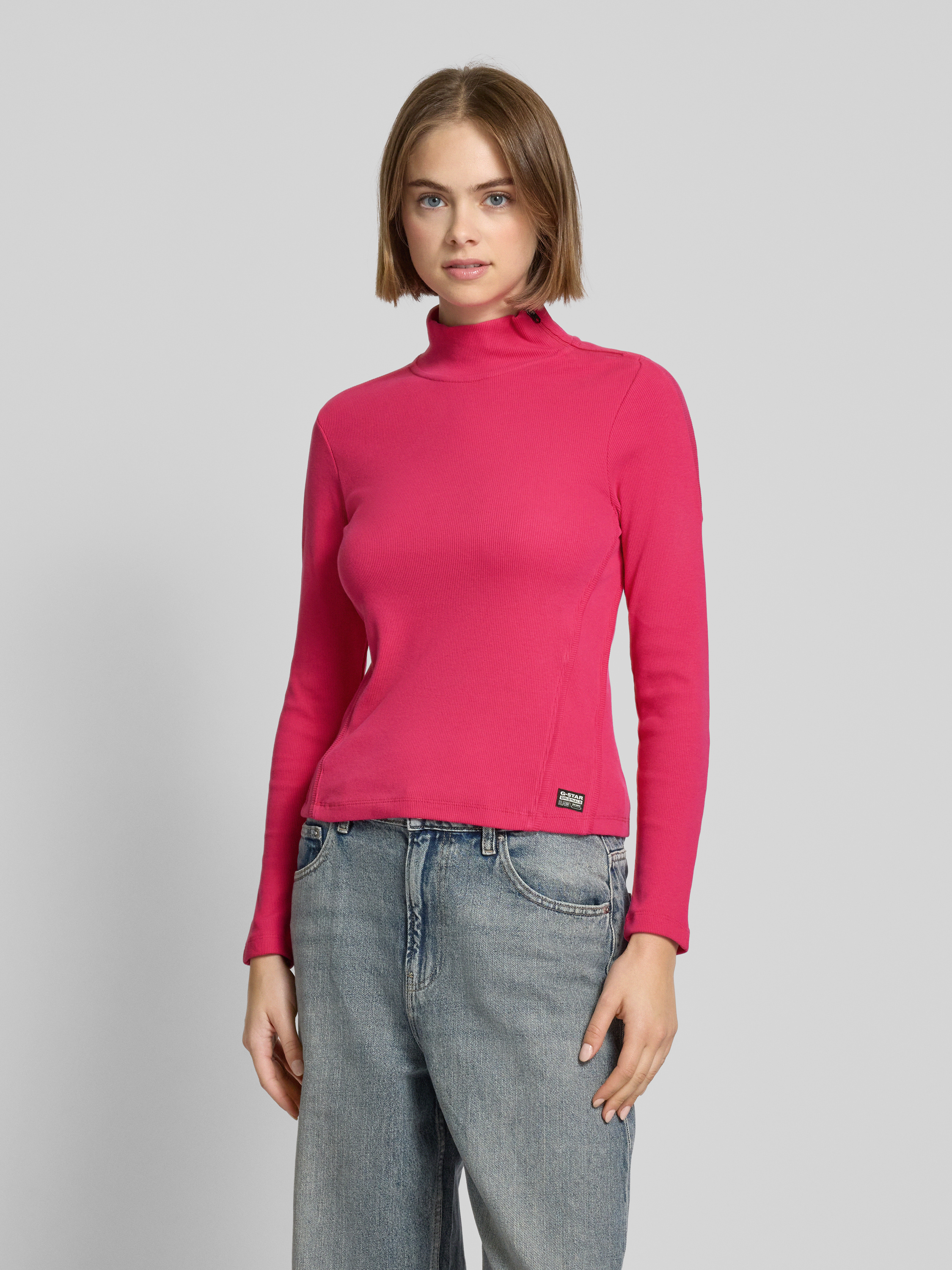 Das Damen Langarmshirt von G-Star RAW schmiegt sich durch den körpernahen Schnitt angenehm an und sitzt zuverlässig. Dank des Baumwoll-Elasthan-Mix fühlt sich das Material weich auf der Haut an, während der Stehkragen einen modernen Akzent setzt. Ein Label-Patch rundet den sportlichen Look dezent ab.