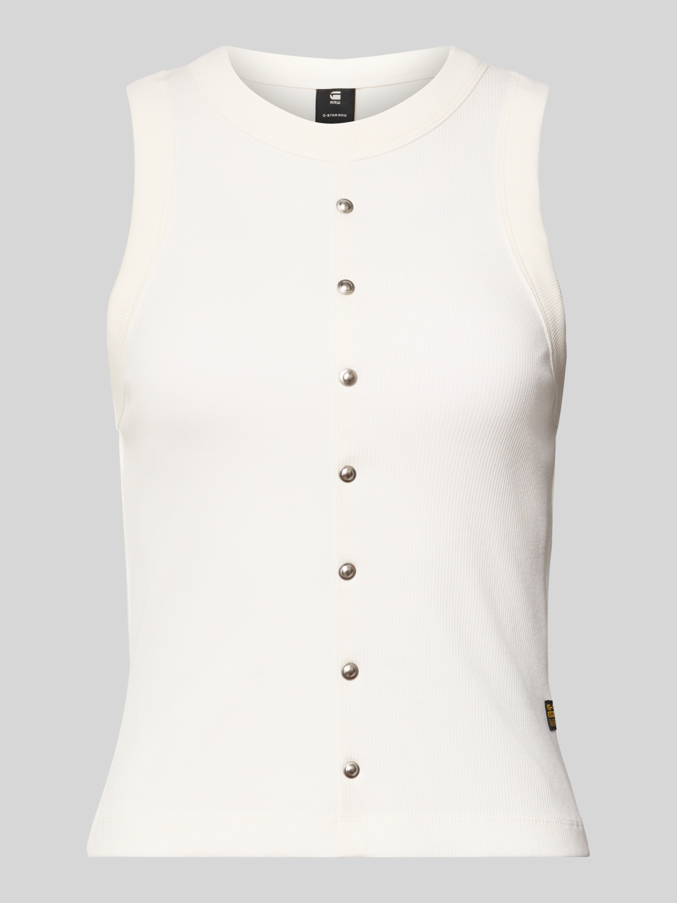 Das Damen Tanktop Heritage von G-Star Raw liegt durch den körpernahen Slim Fit angenehm an und passt sich flexibel verschiedenen Outfits an. Dank Baumwoll-Elasthan-Mix bleibt das Material formstabil und weich. Dezente Nieten setzen einen Akzent, während der Rundhalsausschnitt für Alltagstauglichkeit sorgt.