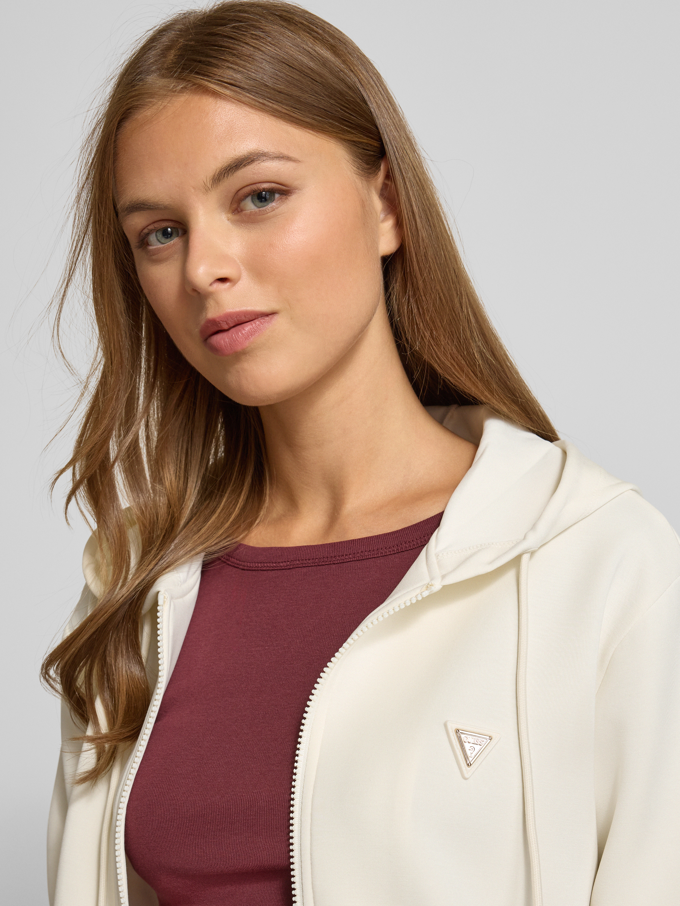 Die Damen Sweatjacke von Guess Activewear zeigt sich mit einem entspannten, geraden Schnitt, der Bewegungsfreiheit ermöglicht und angenehm sitzt. Ein feiner Material-Mix mit Modal-Anteil verleiht ein weiches Tragegefühl, während die Kapuze mit Tunnelzug für zusätzlichen Komfort sorgt. Dezente Label-Applikationen runden das Design harmonisch ab.