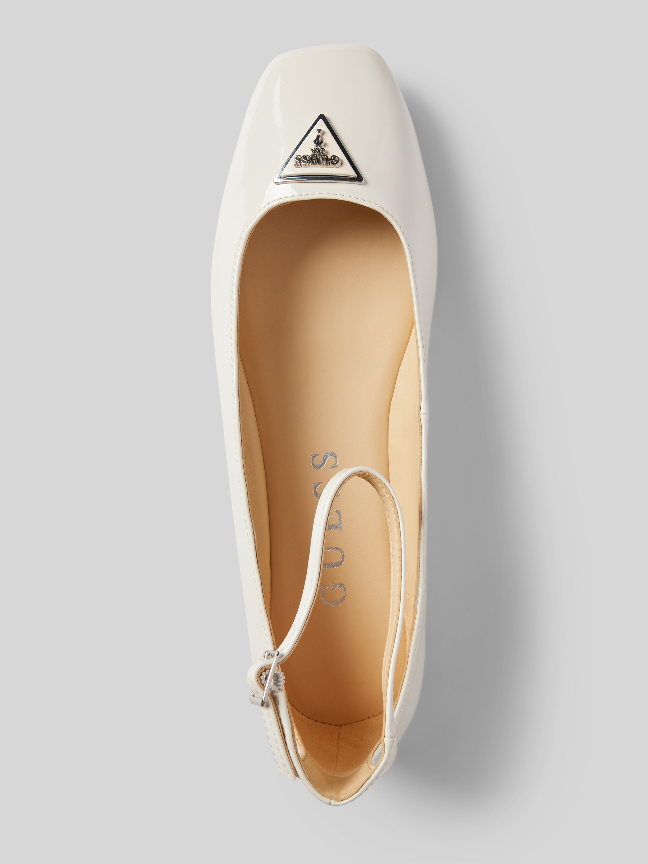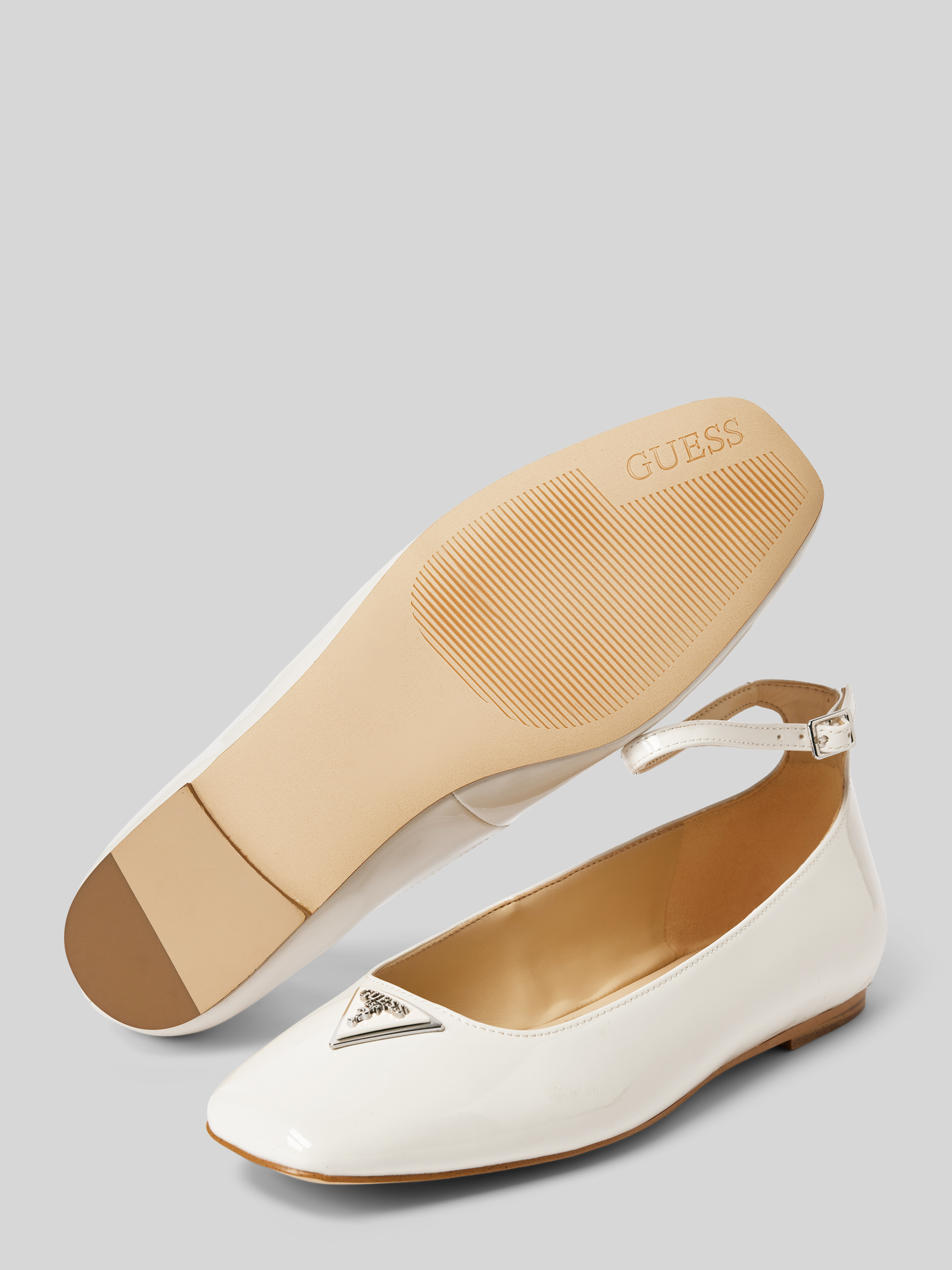Die Ballerinas von GUESS, Modell 'LEVVIS', kombinieren stilvolle Details mit praktischer Funktionalität. Der abgerundete Zehenbereich und der bequeme Blockabsatz bieten angenehmen Tragekomfort, während die strukturierte Sohle für sicheren Halt sorgt. Ein eleganter Fesselriemen mit Dornschließe ergänzt das Design harmonisch.