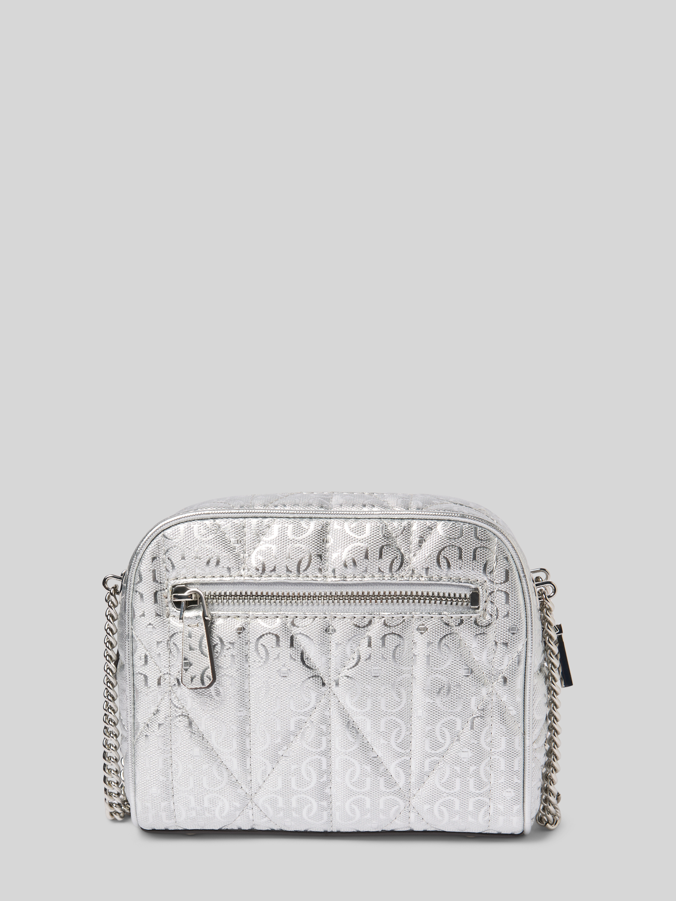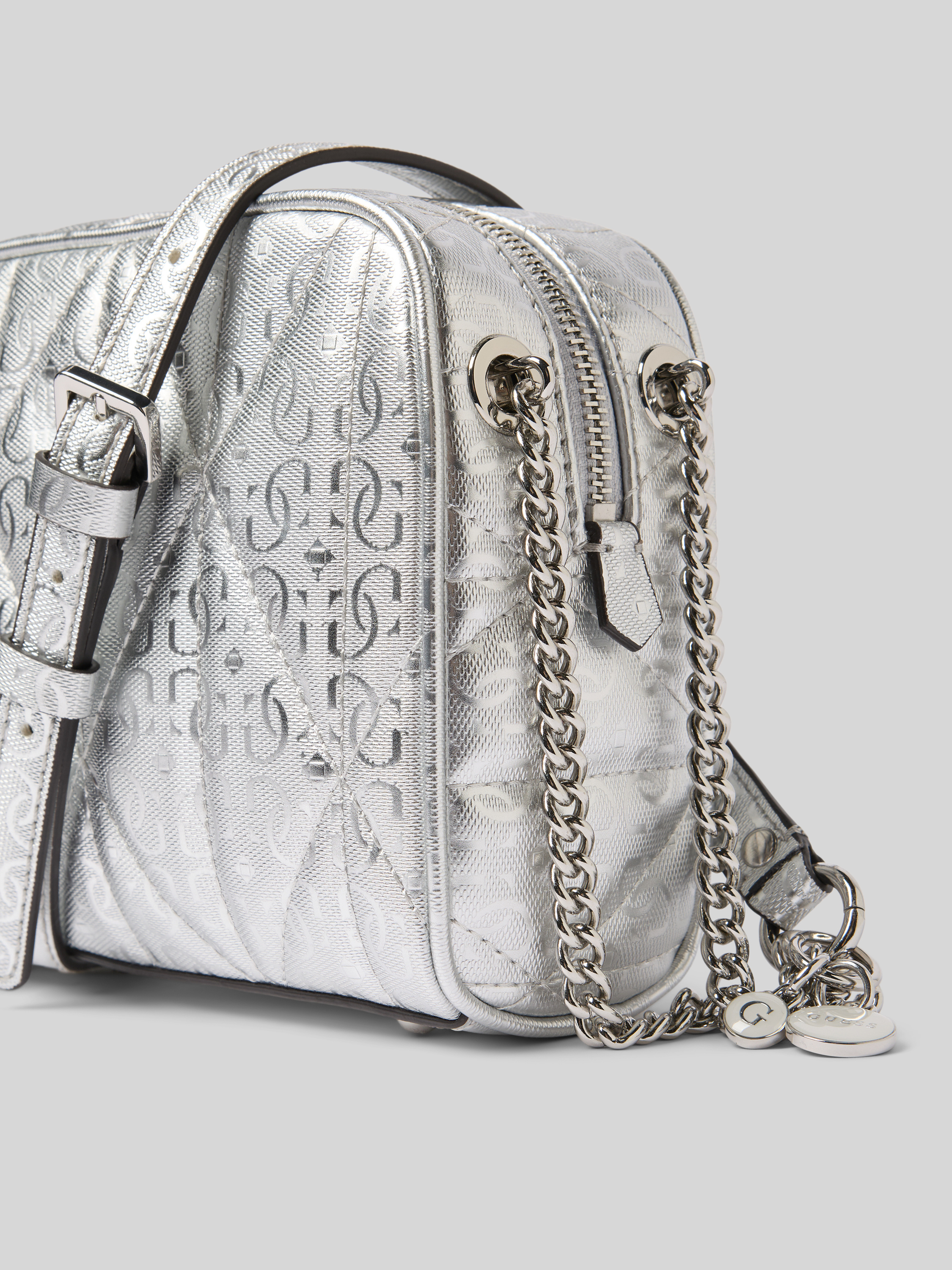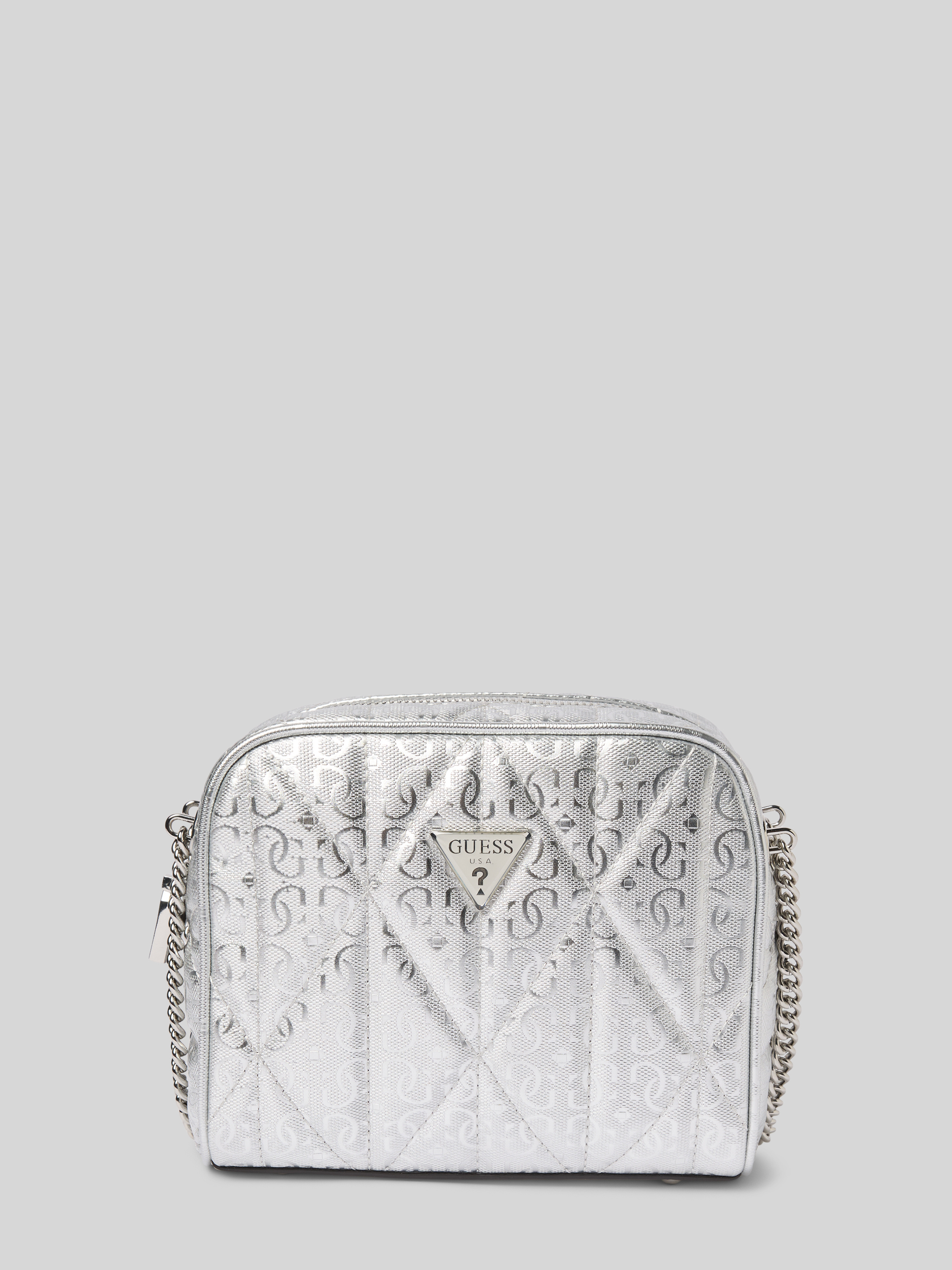 GuessHandtasche mit Label-Applikation Modell 'ALDINA CAMERA CROSSBODY' in silber