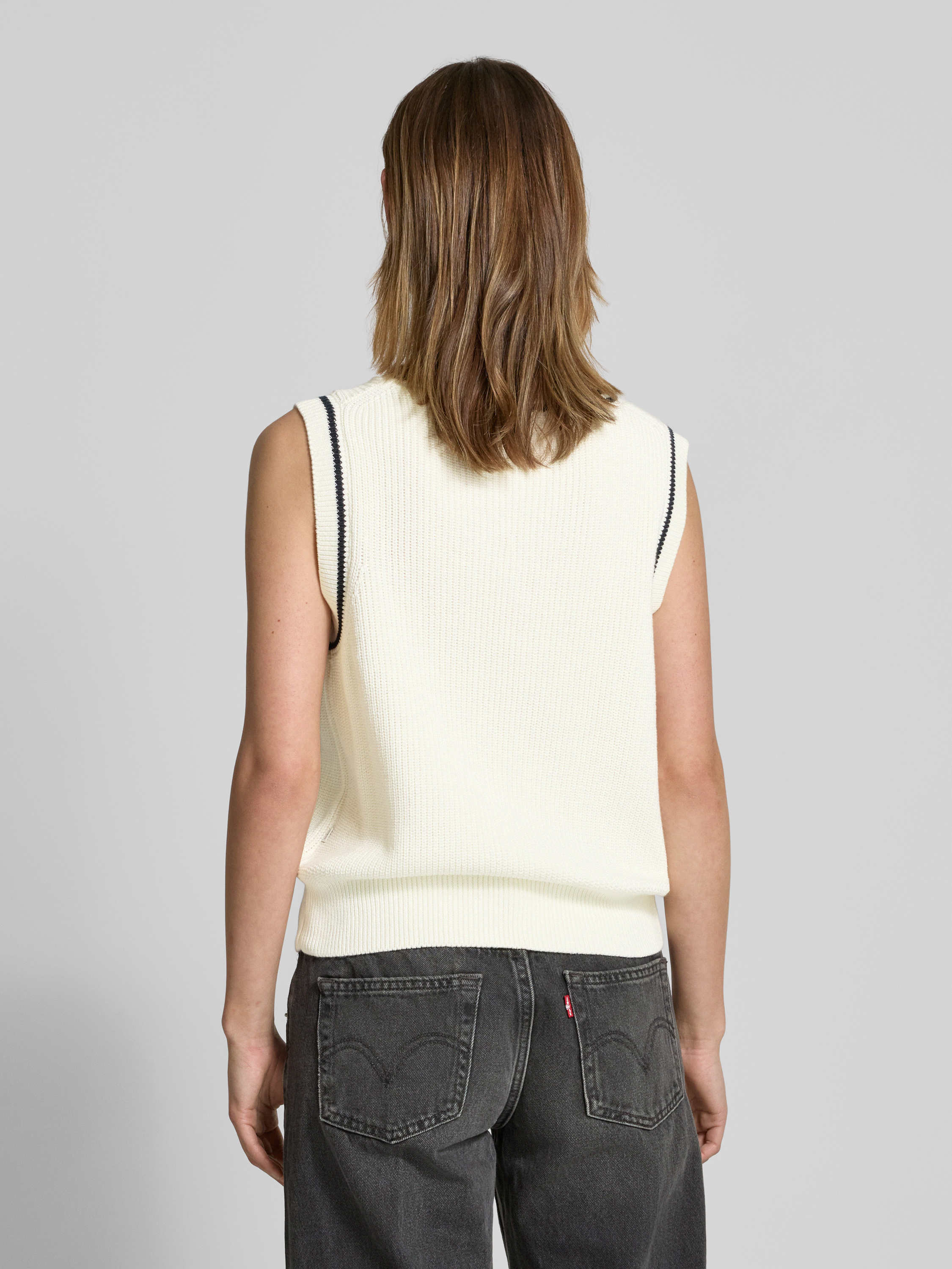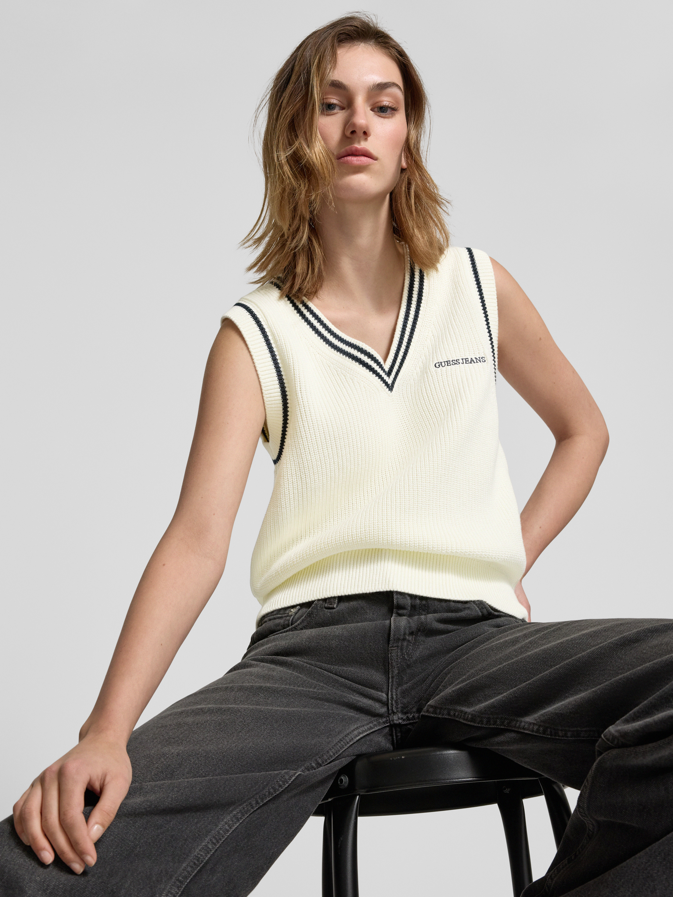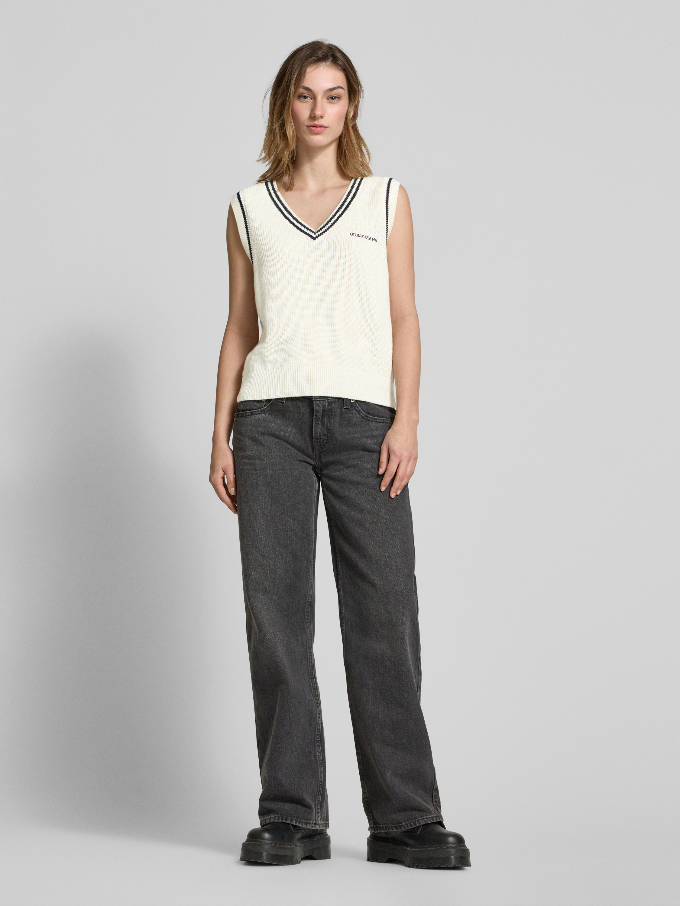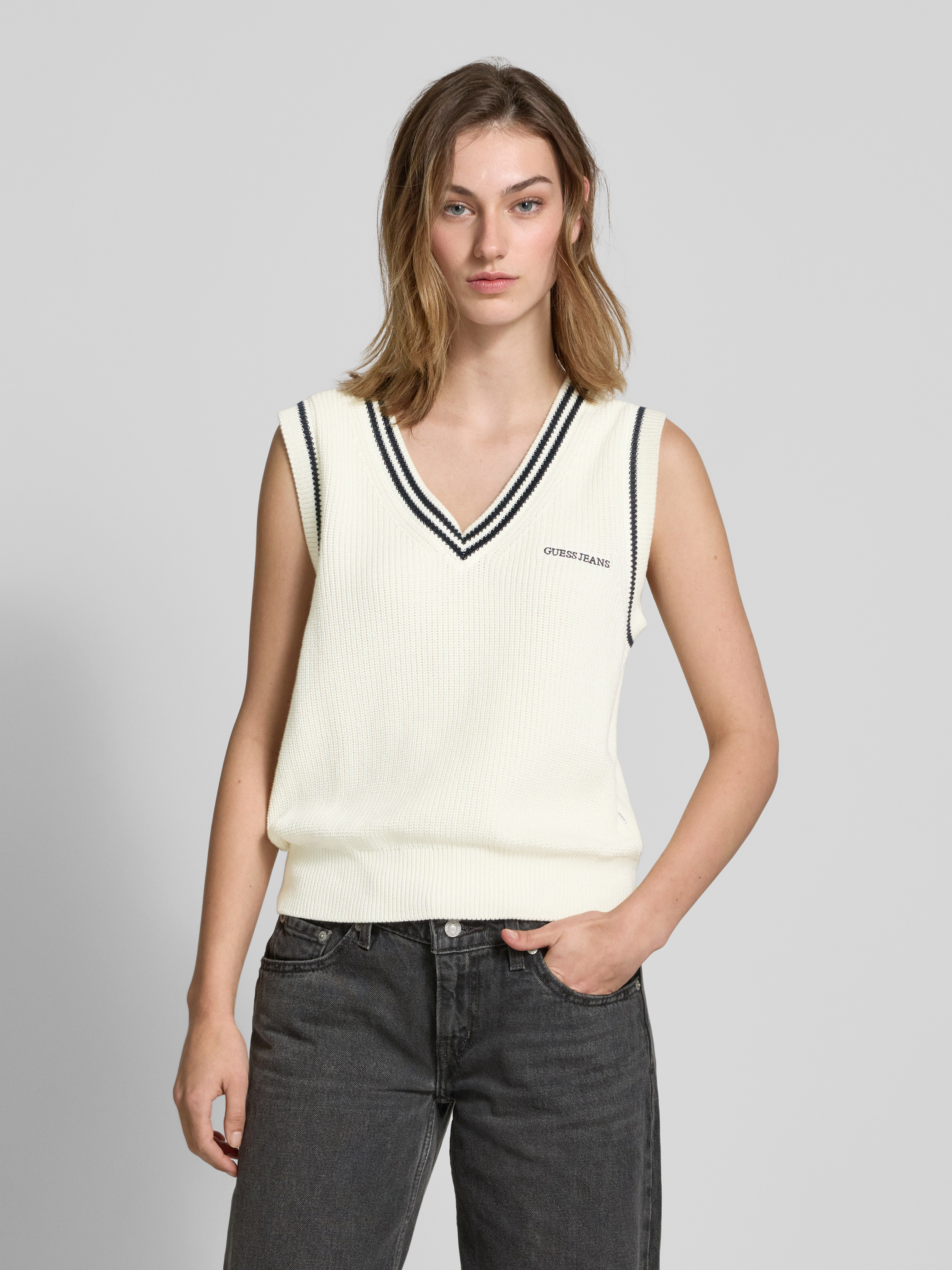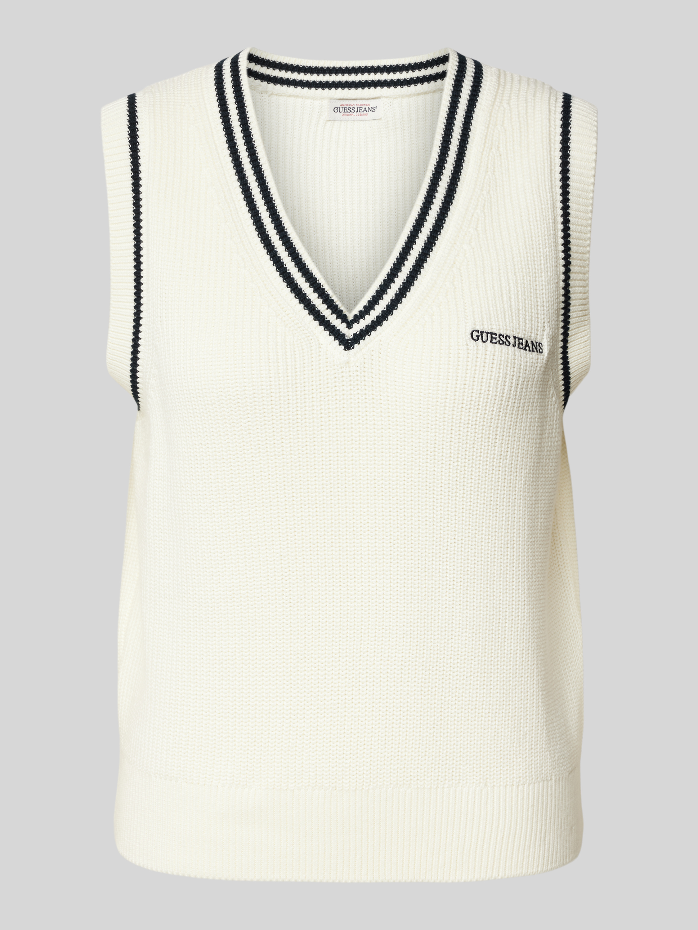 Der Pullunder von Guess Jeans besteht aus reiner Baumwolle und bietet einen Regular Fit, der für ein angenehmes Tragegefühl sorgt. Der V-Ausschnitt und das dezente Label-Stitching verleihen dem Kleidungsstück eine stilvolle Note, während gerippte Abschlüsse das Design abrunden.